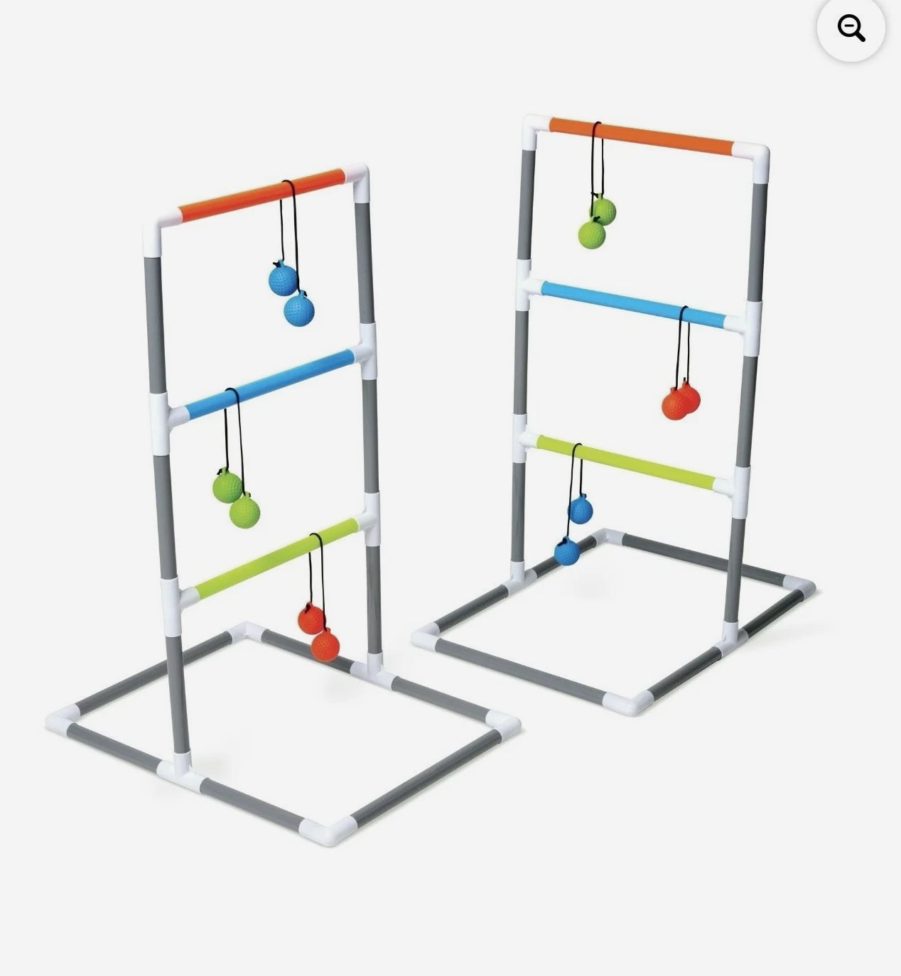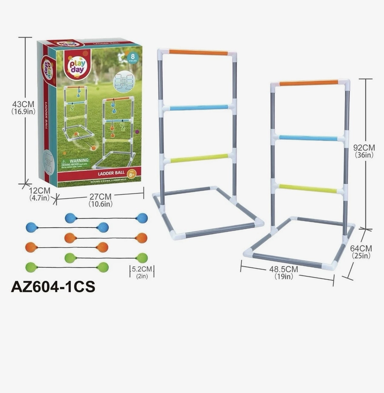 Play Day Ladder Ball Play Set Great for Outdoor Play 8 Pieces: Includes 2 targets and 6 sets of balls Brand new in original packaging Fast shipping from a smoke-free and pet-free facility