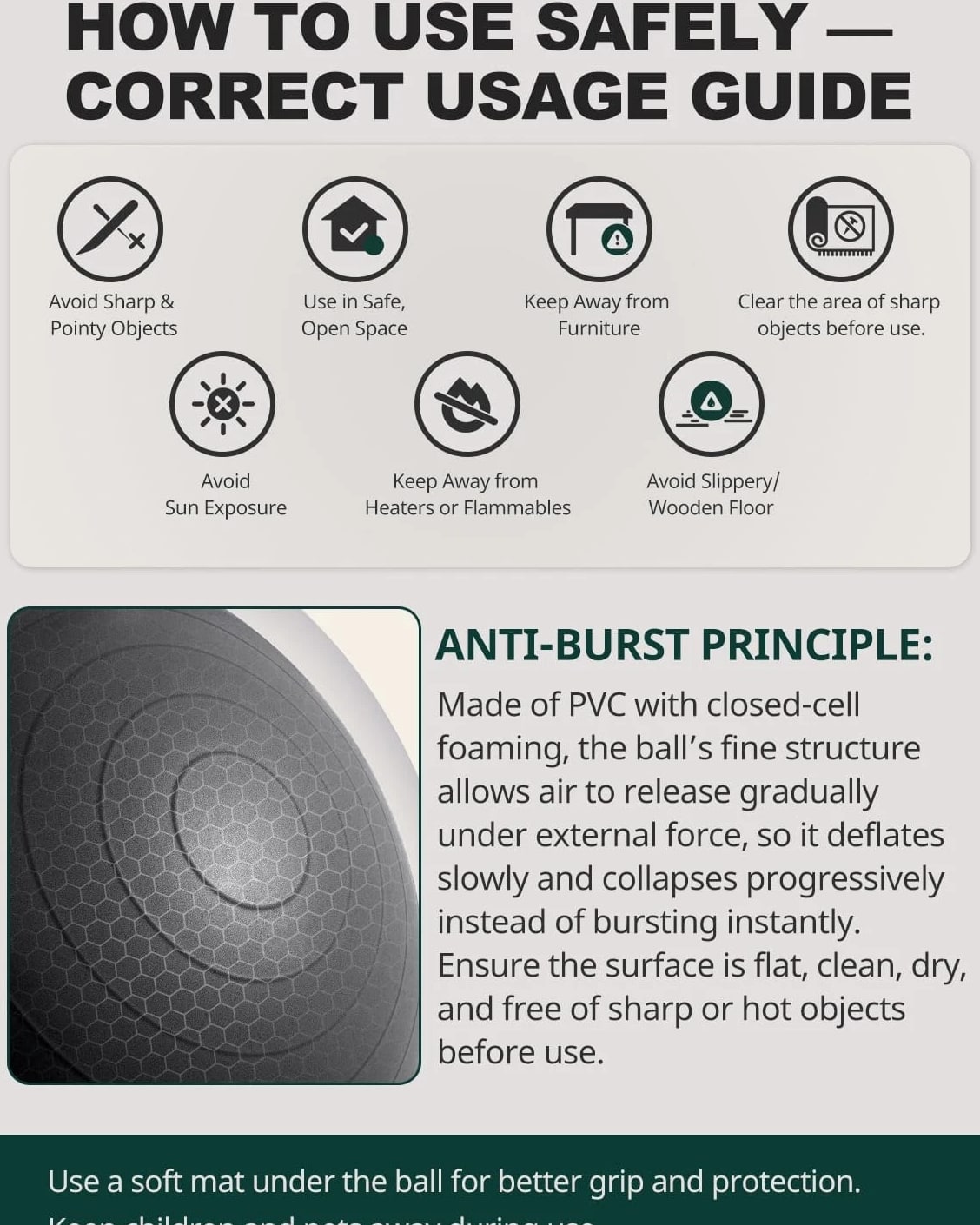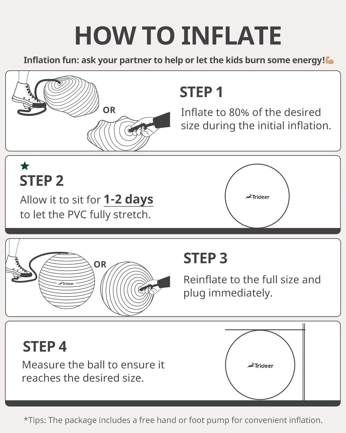 NON-SLIP SURFACE- Non-slip stripes and frosted surface increase friction between the stability ball and user's skin and ground, making the touch more delicate and anti-slip effect better STRONGER WEIGHT CAPACITY- Supports up to 330 pounds; the birthing ball prevents sudden blast; gradual air release mechanism ensures safety; ideal tool for assisting pregnant women throughout labor and delivery SAFETY AND COMFORT- Exercise ball is crafted from PVC material; meticulously manufactured free from harmful heavy metals such as Pb, Cd, Hg, and 10 other heavy metals; safe for pregnant women and children MULTI-SCENARIO USE- Can be used as a pregnancy ball to ease maternity pains, work on core muscles and balance, or replace traditional office chairs to adjust sitting posture and relieve back pains EASY INFLATION- Trideer exercise ball comes with quick inflation pump (45/55/65cm equipped with hand pump; 75/85cm equipped with foot pump), 2 air stoppers, and detailed instructions; available in 5 sizes