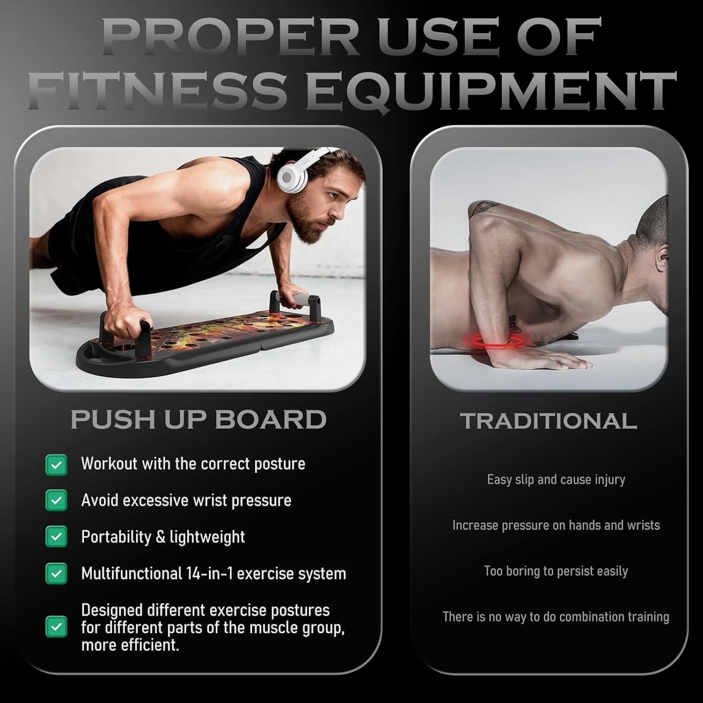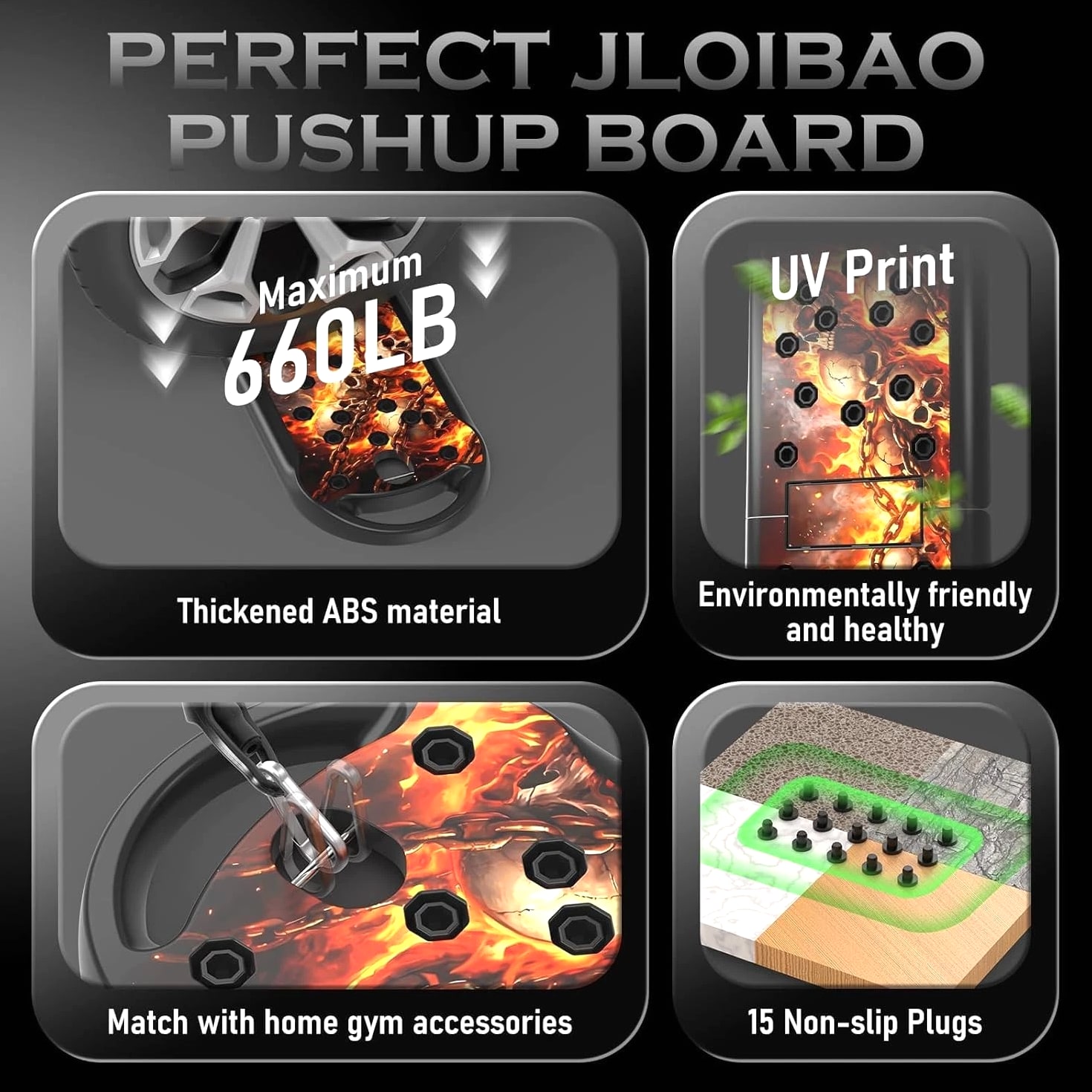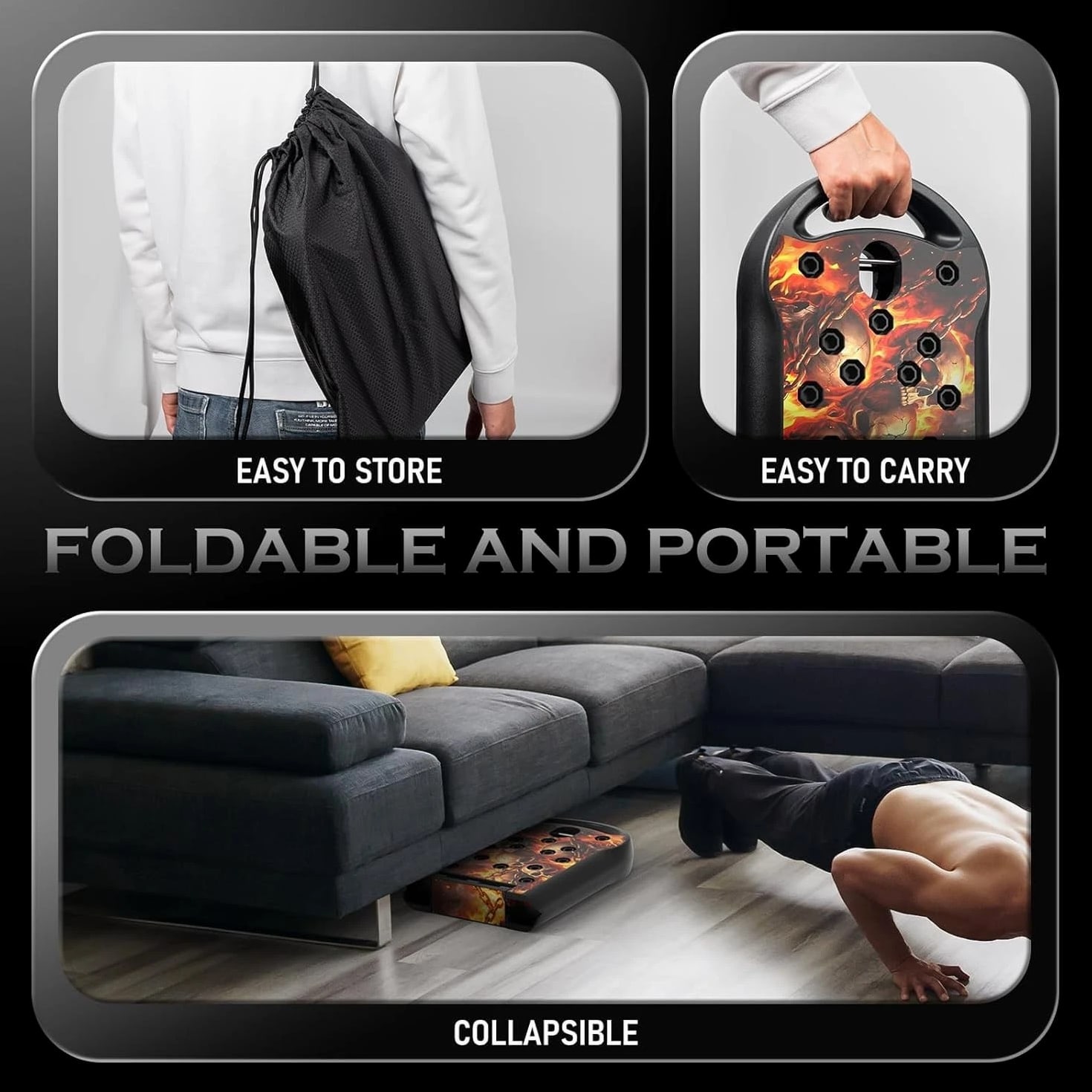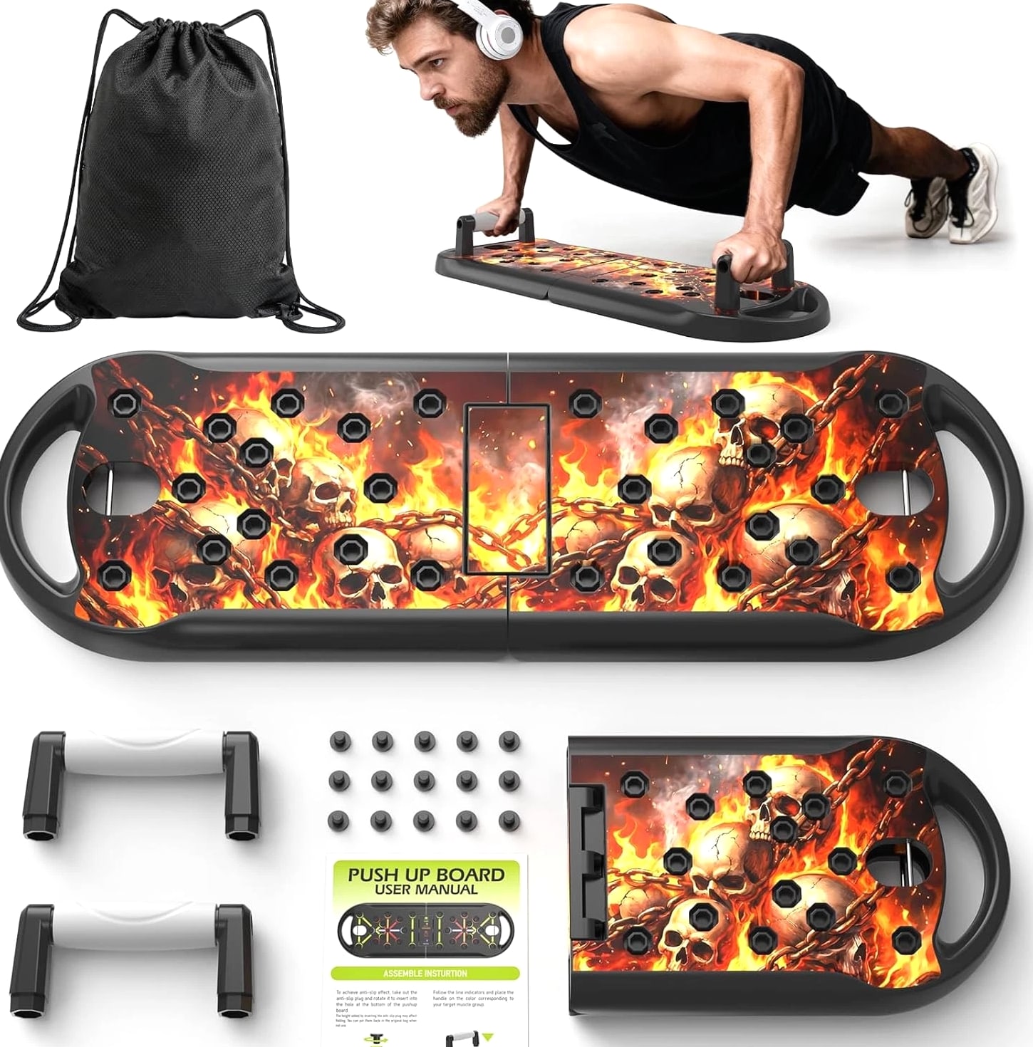 π₯ Professional Push-Up Board System Designed to improve push-up form and help activate upper body muscles for users of all fitness levels, from beginners to advanced training. πͺ Multi Muscle Training Design Color-coded layout helps guide hand placement to support chest, shoulders, back, triceps, and core exercises for more effective workouts. π Home Gym Fitness Tool Supports strength training, calorie burn, and body conditioning exercises without bulky gym equipment. βοΈ Compatible Design System Built with connection ports for use with add-on training accessories to expand workout options at home. π¦ Portable & Easy Storage Foldable design allows compact storage and easy transport. Includes board, handles, plugs, carry bag, and user guide. Material: Acrylonitrile Butadiene Styrene (ABS) Color: Upgraded-Flame Skull Product Dimensions: 29.92"L x 9.84"W x 2.83"H Handle Type: Comfortable Included Components: Push up board, Handles, Storage bag