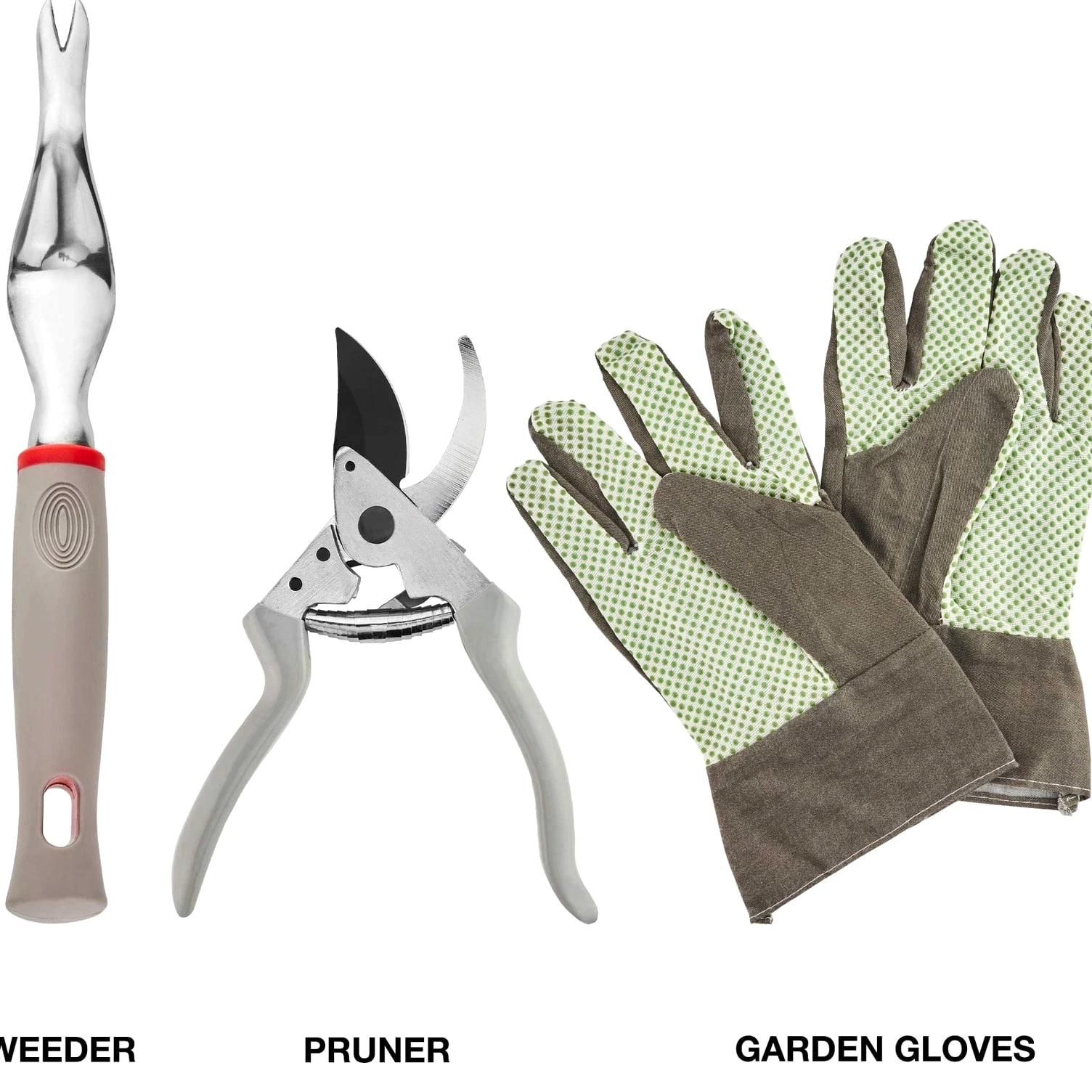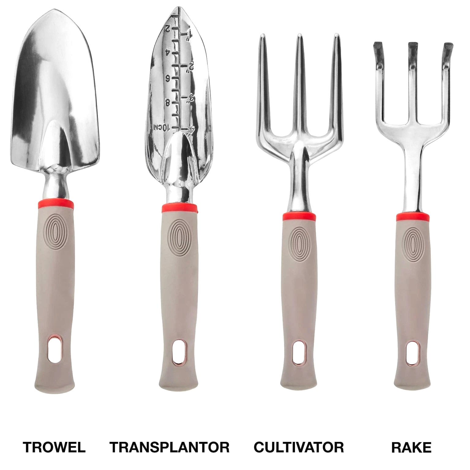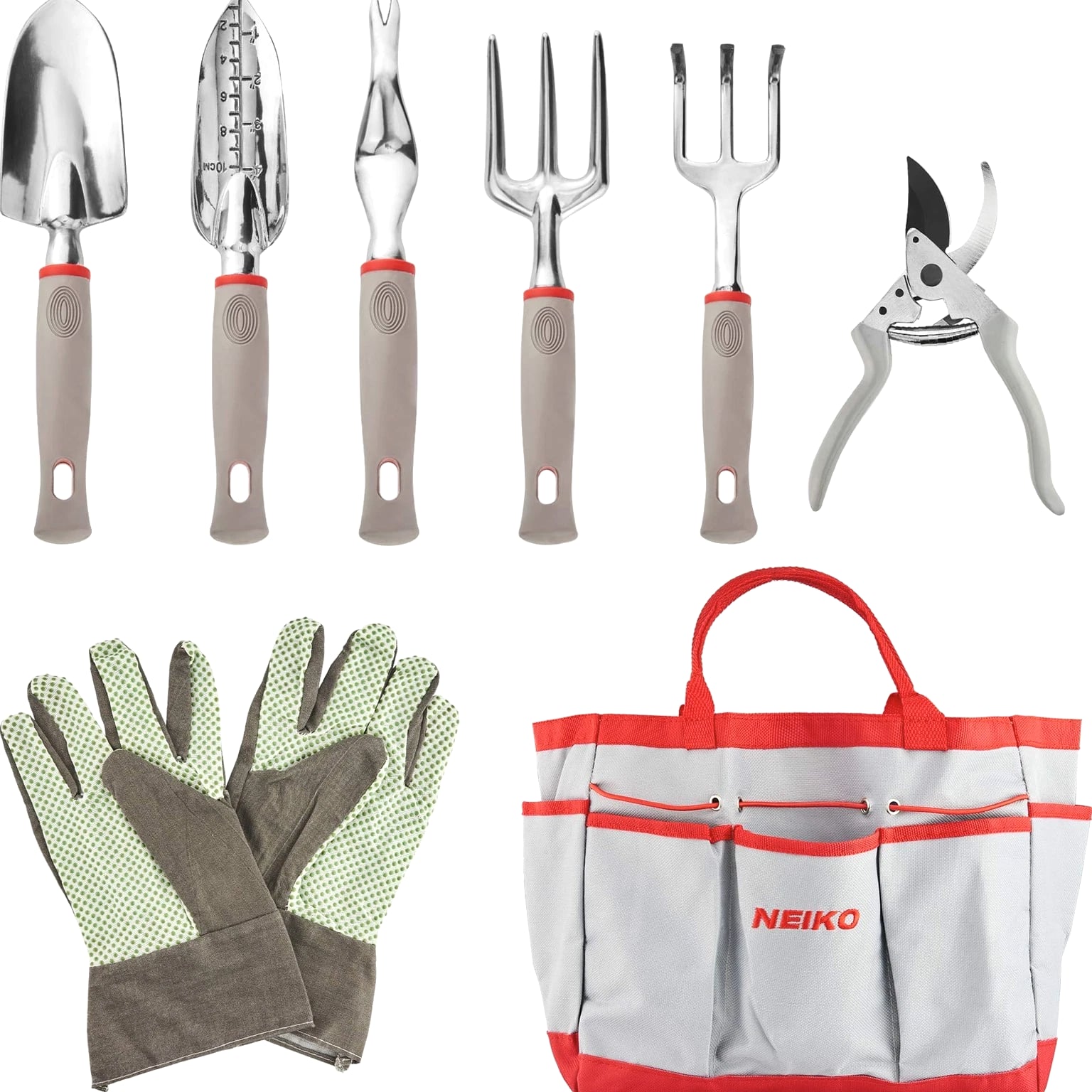 61090A 8-Piece Heavy Duty Garden Tool Set – Includes Durable Storage Bag, Hand Tools for Home Gardening, Ideal for Men & Women DURABLE GARDEN TOOLS: The gardening tools set consists of heavy duty planting tools that are constructed of high-grade polished aluminum that resists rust for the toughest gardening jobs in your home garden. HANDY TOTE BAG: The gardening bag is made of premium canvas and has 7 convenient side pockets to hold your gardening tools and stay organized wherever you need to go. Perfect for all your indoor or outdoor planting! ERGONOMIC HAND TOOLS: With soft grip and anti-slip handles, this gardening tool kit is comfortable for all-day use. The unisex design makes it perfect for both women and men, and this garden set is ergonomically designed to fit securely in your grip while using. This user-friendly design will reduce pressure on the wrist and hand. GARDENING TOOL BAG INCLUDES: Trowel, transplanter, cultivator, rake, weeder, and pruner. Gloves and gardening tool set bag are bonus accessories. GREAT GARDENING GIFT: The perfect gardening kit meets all your requirements for indoor succulent garden plant care and outdoor gardening for beginners as a gardening starter kit or experienced gardeners, this garden set can be used by adults and older children.