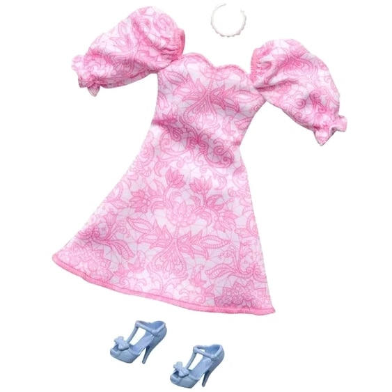 Barbie Doll Clothing Fashion Pack Pink Puff Sleeve Dress & Accessories. Barbie ready for any adventure with fun, fresh, versatile looks for wardrobe expansion. Doll not included. Pink puff sleeve dress features pretty filigree print and sweetheart neckline - perfect for everyday wear, ballet performances, or birthdays. Includes delicate necklace and periwinkle heels with bow detail. Mix and match with other Barbie clothes for style exploration and storytelling. Day to night fashions with mindful design using fabrics made from recycled plastics (excluding trim). Collect different fashion packs to expand wardrobe and inspire playtime stories. Each sold separately.