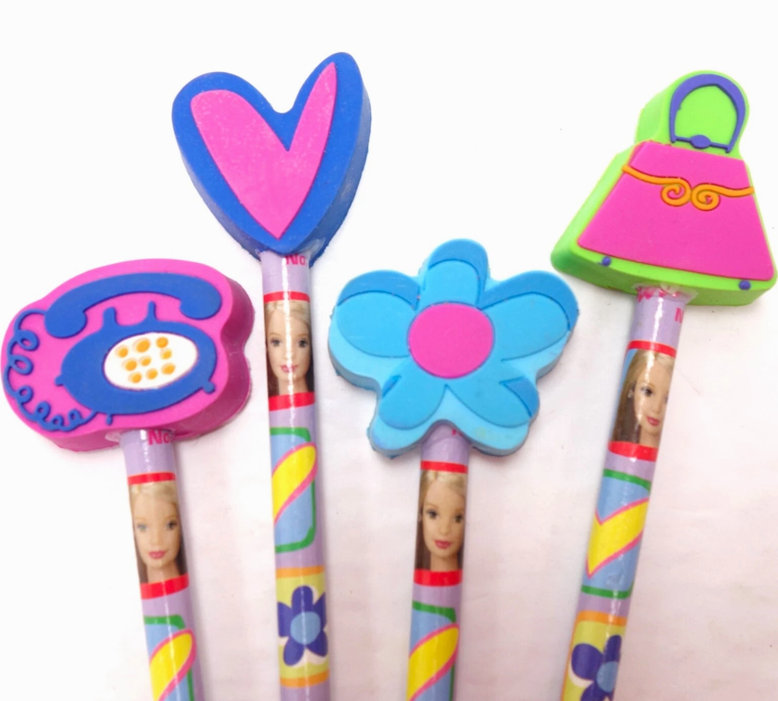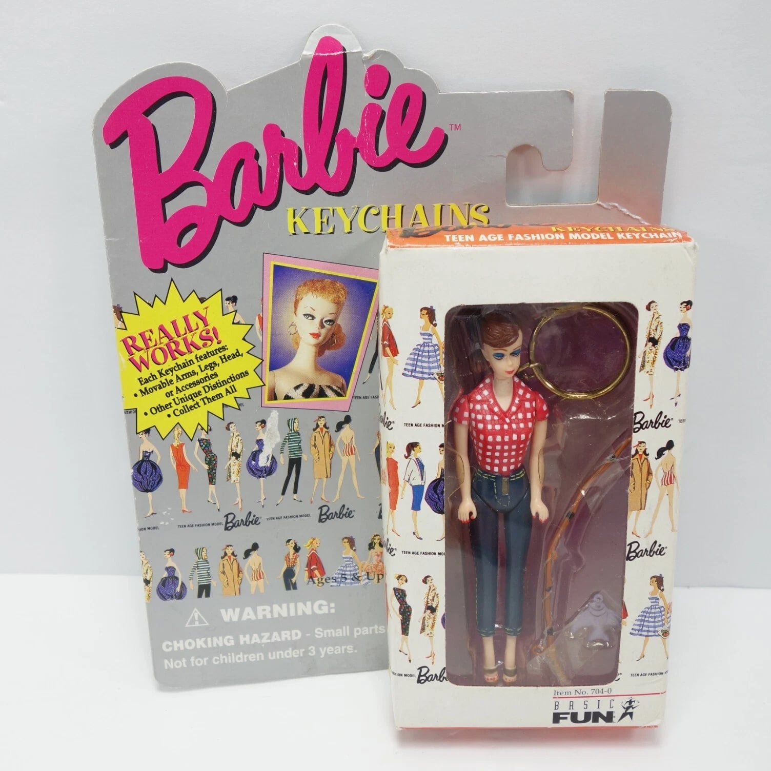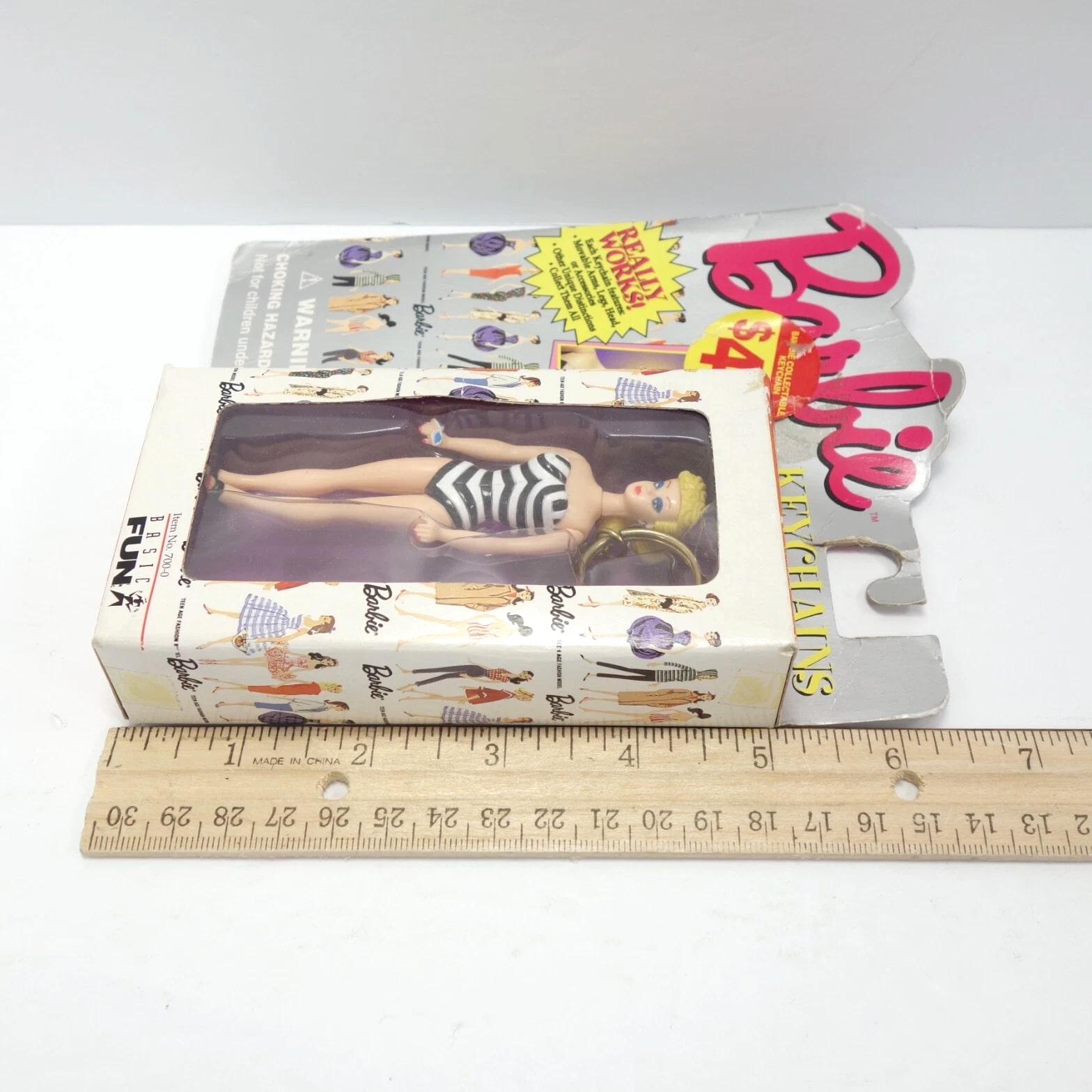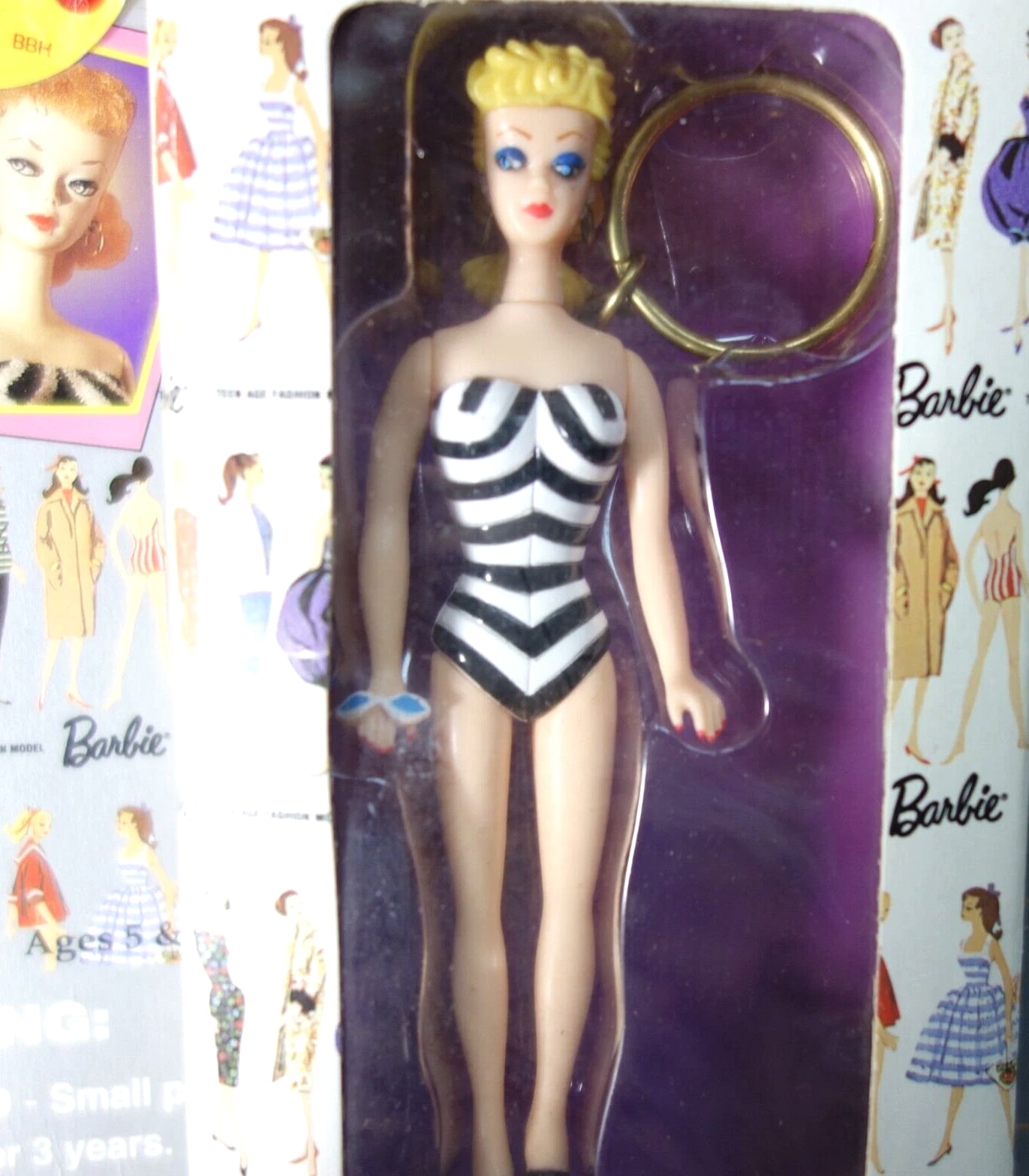 Barbie & Ken Fashion and Accessories, Barbie Keychains, Barbie Pencils with Eraser Toppers, and Barbie Pets. Choose from selections: Barbie and Ken Fashion Packs with clothing and accessories. 1995 Barbie Keychain: Barbie with Fishing Pole - Moveable arms, legs, head, about 4" tall, mint condition. 1995 Barbie Keychain: Barbie in Black/White Striped Swimsuit - Moveable arms, legs, head, about 4" tall, mint condition. Barbie Pencil with Laser Cut Eraser - Lead pencil with graphics, cute topper, 8" long. Combined shipping available.