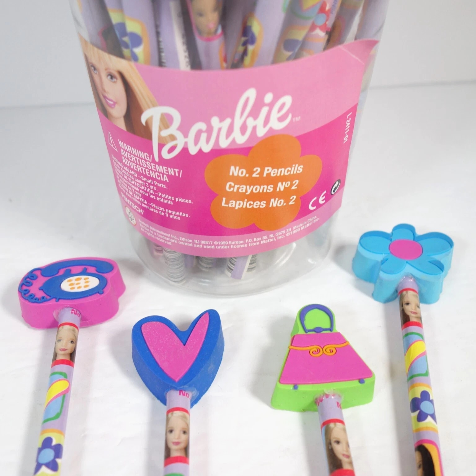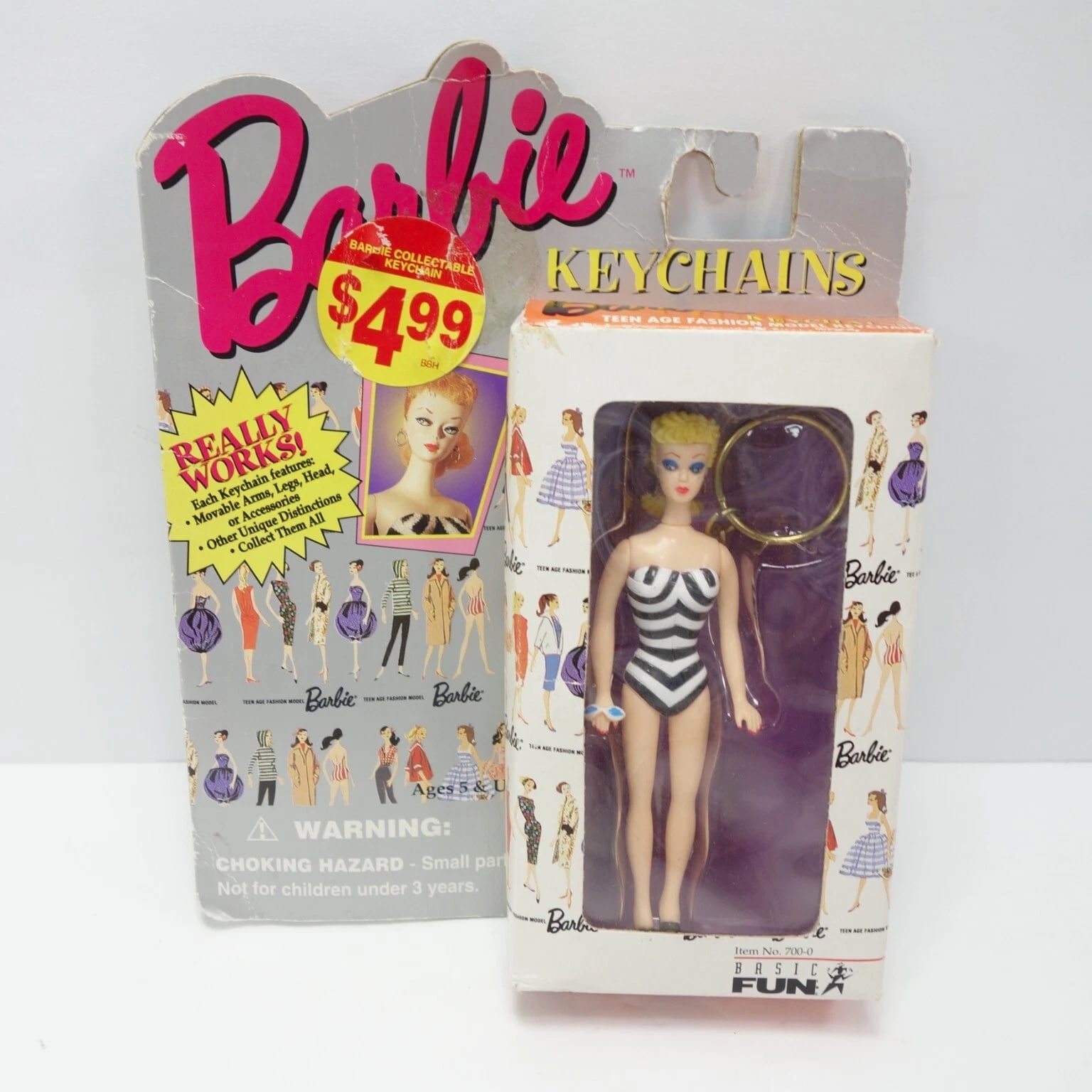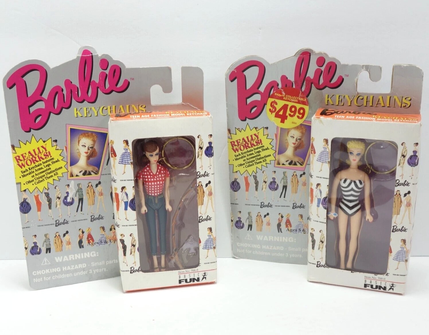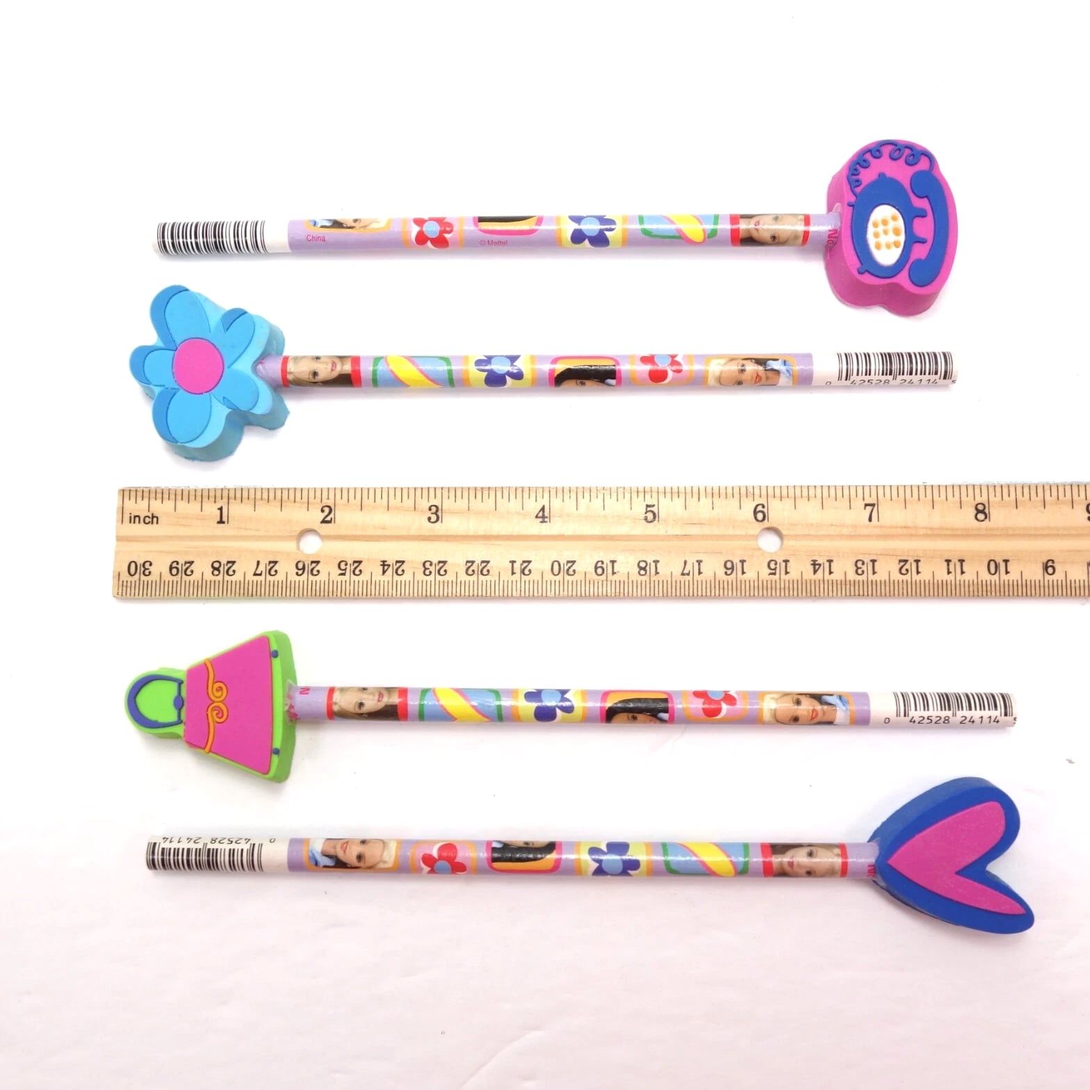 Barbie & Ken Fashion and Accessories, Barbie Keychains, Barbie Pencils with Eraser Toppers, and Barbie Pets. Choose from selections: Barbie and Ken Fashion Packs with clothing and accessories. 1995 Barbie Keychain: Barbie with Fishing Pole - Moveable arms, legs, head, about 4" tall, mint condition. 1995 Barbie Keychain: Barbie in Black/White Striped Swimsuit - Moveable arms, legs, head, about 4" tall, mint condition. Barbie Pencil with Laser Cut Eraser - Lead pencil with graphics, cute topper, 8" long. Combined shipping available.