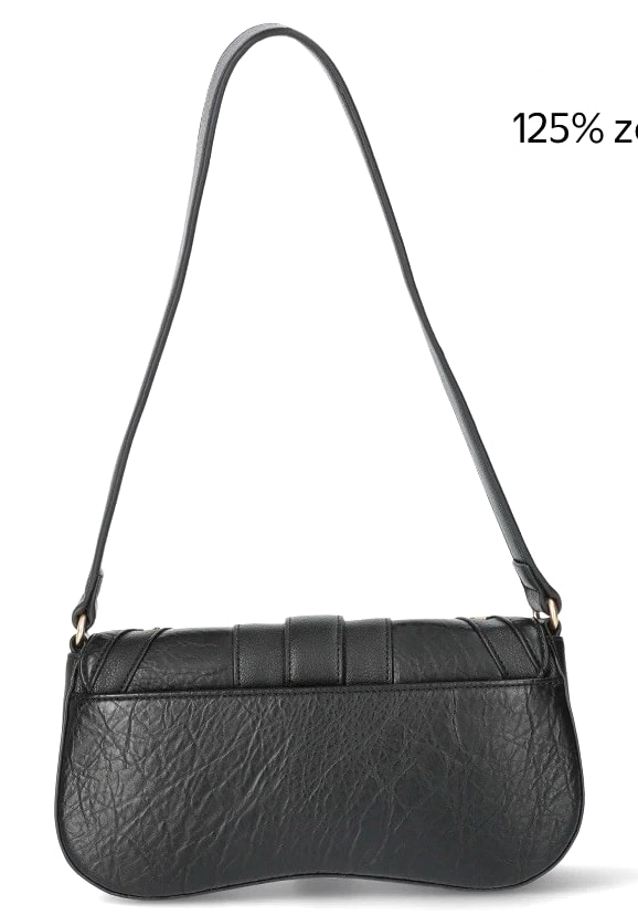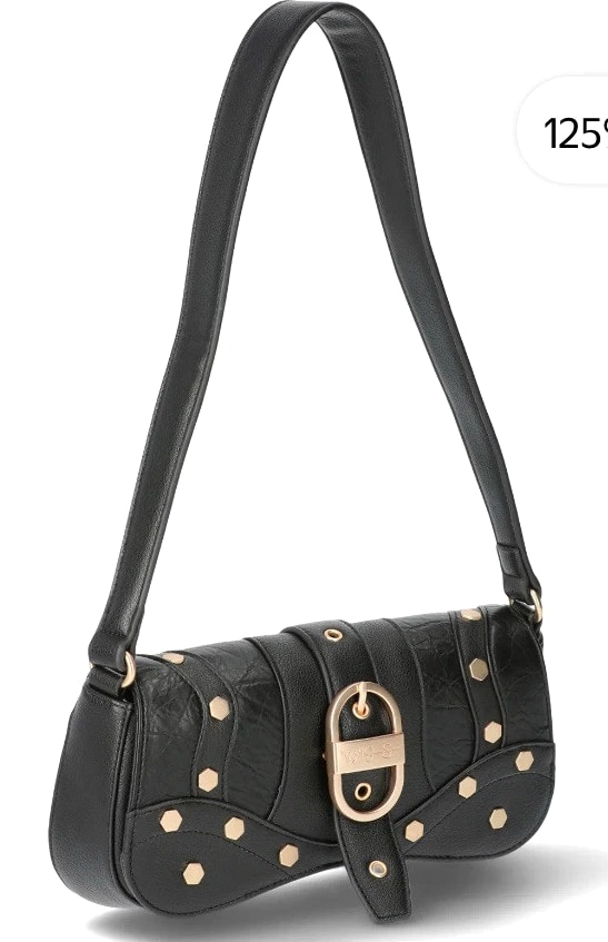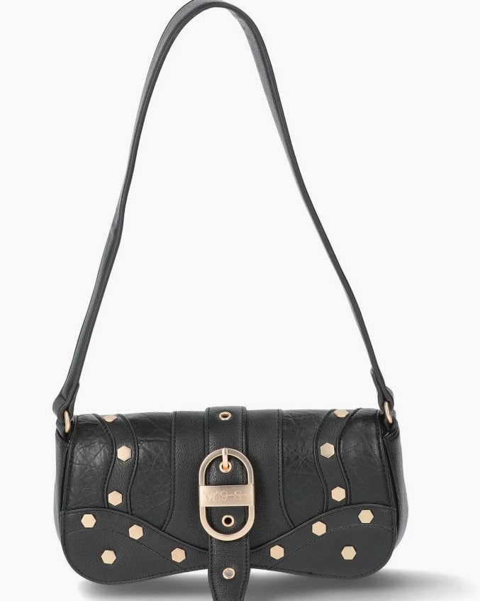 Material: Body - Faux Leather 100% Manmade Materials; Lining - 100% Polyester | Care: Wipe clean | Country of Origin: Imported | Dimensions: 9.5" W x 5" H x 2" D (width measured across bottom) | Handle: Shoulder strap with 11" drop | Closure: Flap over with magnetic snap | Exterior: 1 slit back pocket with magnetic snap, metal hardware, stud and buckle detailing | Interior: 1 zip pocket, 2 slot pockets