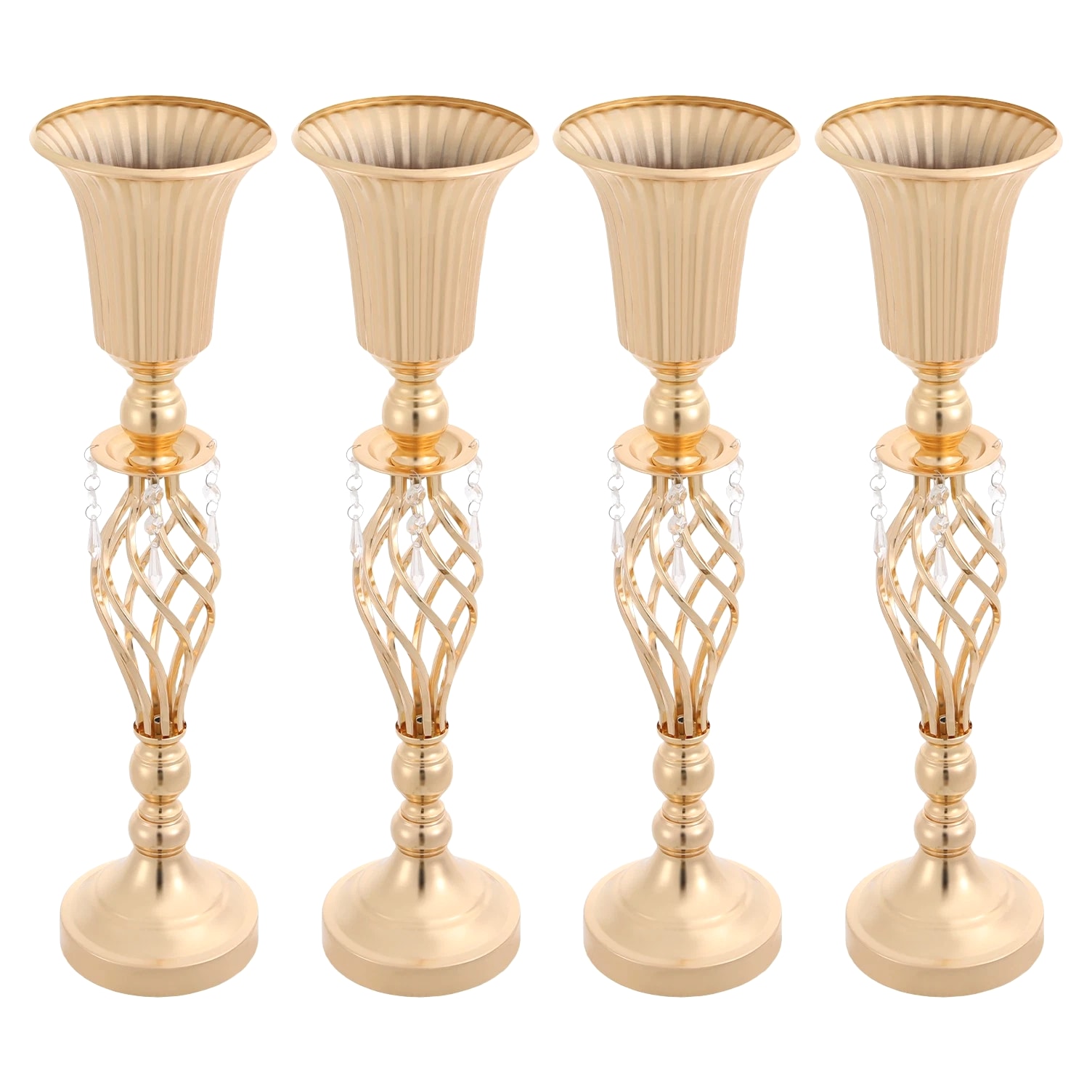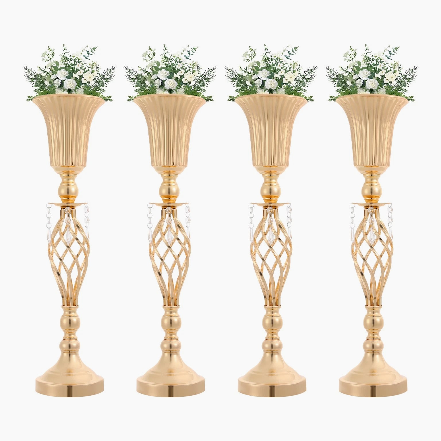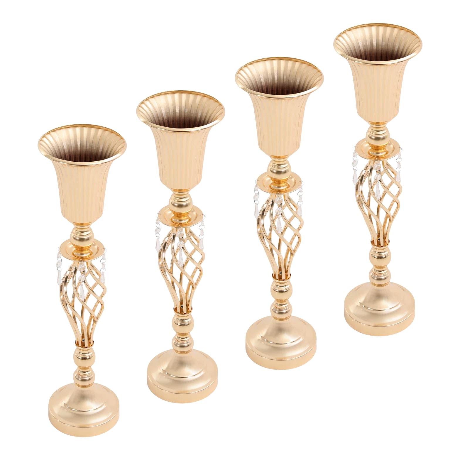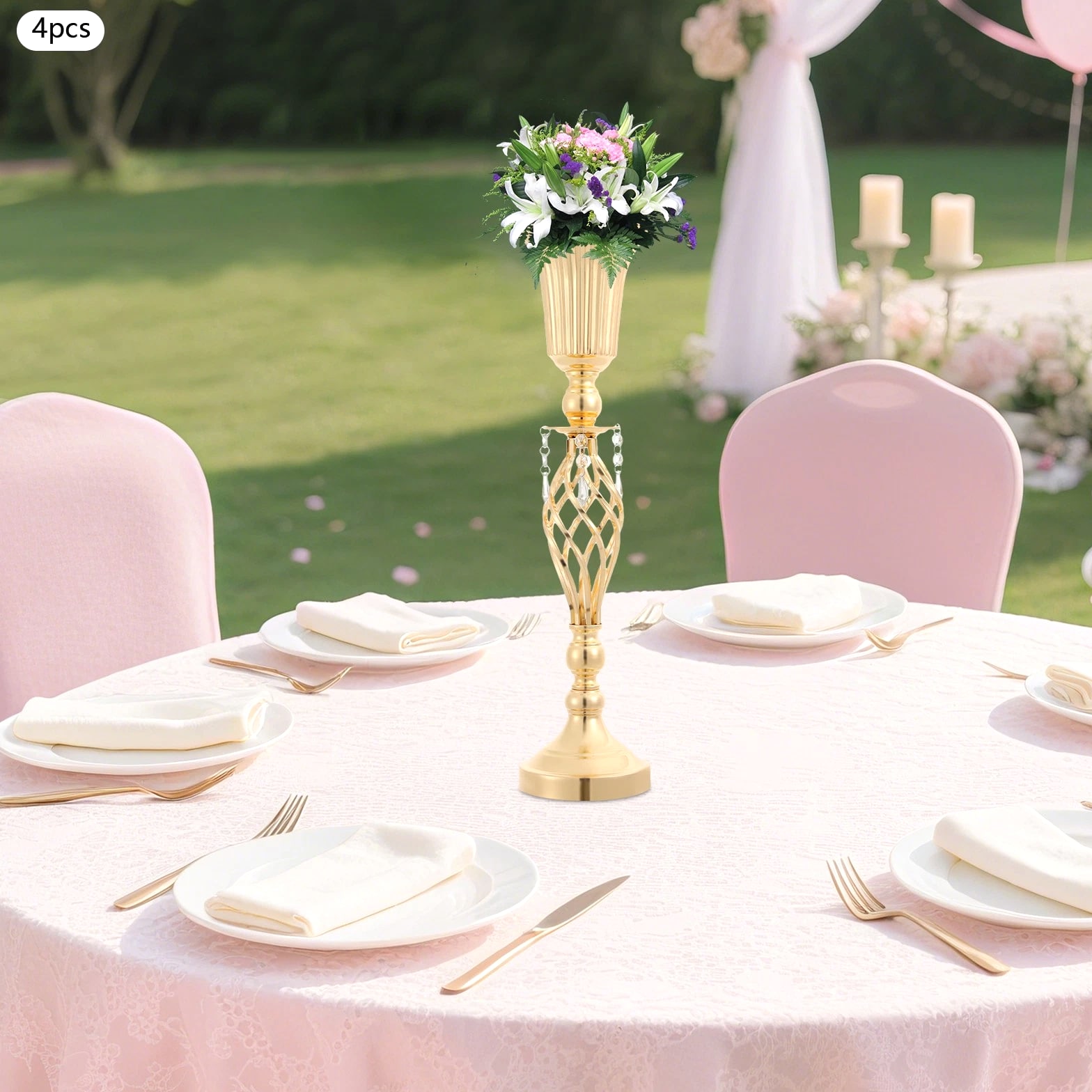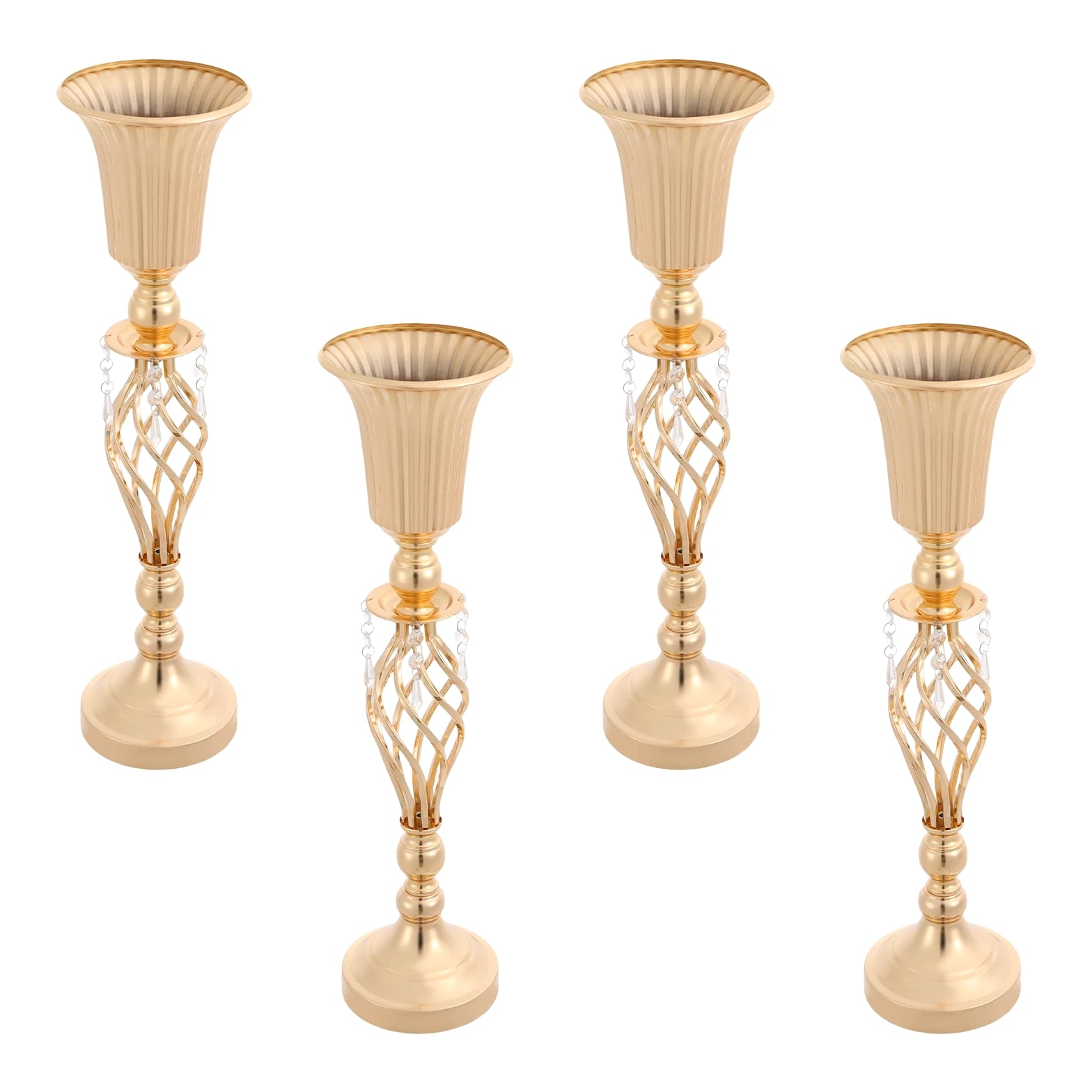 The 4-piece floral vases are excellent additions to your space, blending functionality with aesthetic appeal to transform ordinary environments into inviting, styled settings. Whether used to showcase fresh blooms or decorative greenery, they serve as versatile tools to express personal taste and enhance the ambiance of homes, events, or commercial spaces. Key Features Built to Last: Mainly made of iron with welding and electroplating processes, this product ensures structural rigidity, maintaining its quality through frequent handling and display. Elegant Aesthetic: With its sleek, gold finish, twisted lattice design, and delicate decorative pendants, this product exudes luxurious charm, turning floral arrangements into eye-catching focal points. 4 Pieces Included: Coming in a 4-piece set, this product offers ample flexibility for various scenarios. You can arrange all four together for a grand display or scatter them across different rooms to add consistent decorative flair. Quick Setup: The product's straightforward structure lets you connect the parts easily, so you can start styling floral displays without wasting time on complicated instructions. Practical Design: The 5.7-inch-wide opening makes it easy and enjoyable to arrange and adjust your flowers, allowing you to fit the flower clusters without any hassle. Meanwhile, the 5.51-inch-wide base offers sturdy and reliable foundation for showcasing your beautiful displays. Details Smooth Edges: They enhance the product's refined look and ensure safe handling. Grippy Pad: The pearl cotton pad acts as a soft buffer, preventing scratches, scuffs, or dents caused by friction. Application Suitable for living rooms, dining rooms, banquet halls, wedding venues, birthday parties, coffee shops, hotels, and more. Specifications Color: Gold Style: Modern Material: Iron, Pearl Cotton Process: Welding, Electroplating Assembly Required: Yes Mounting Type: Tabletop Number of Pieces: 4 Base Diameter: