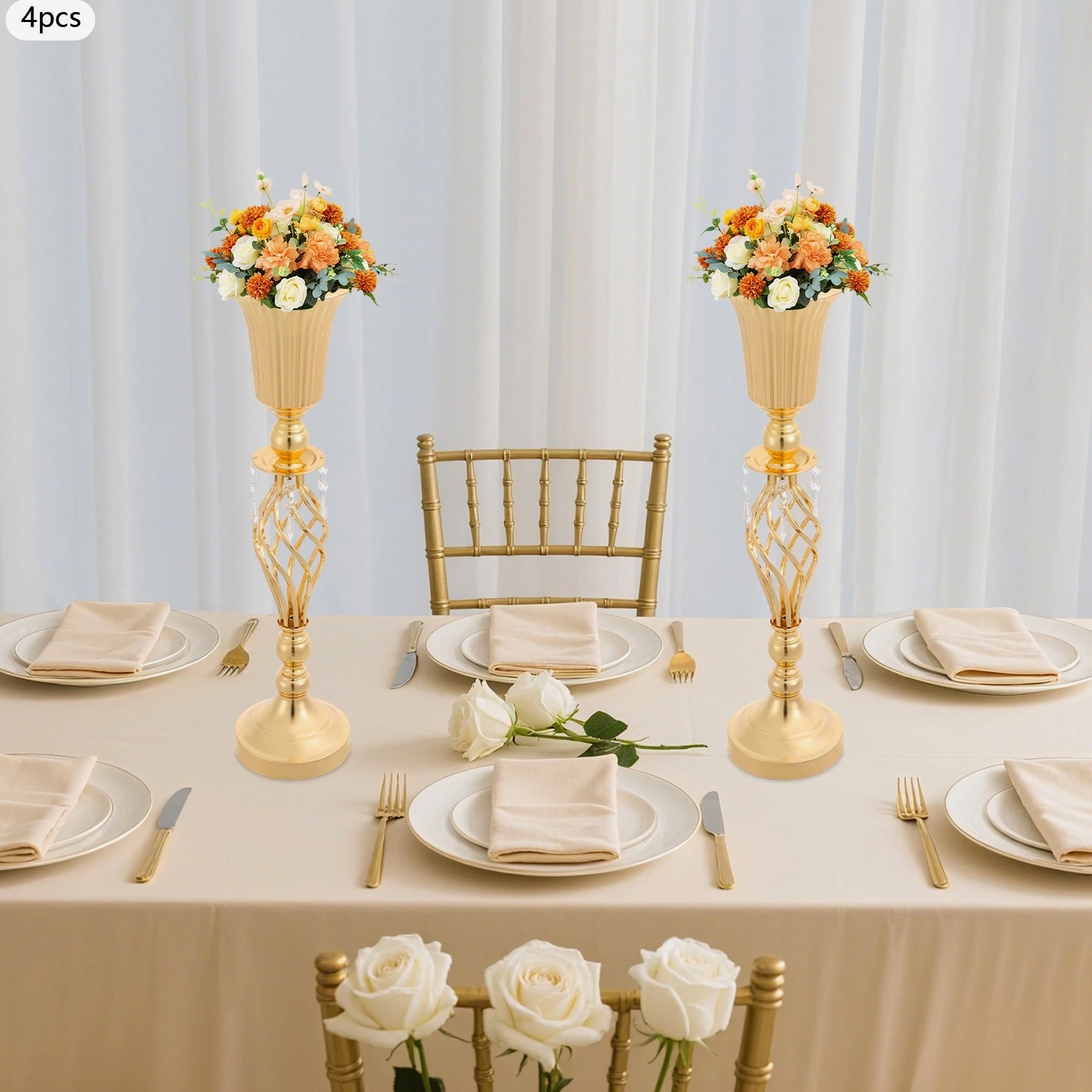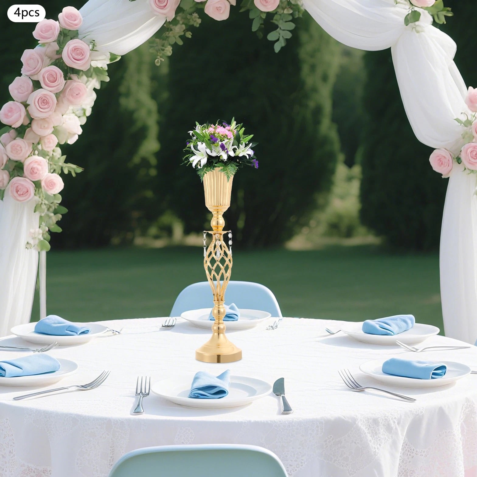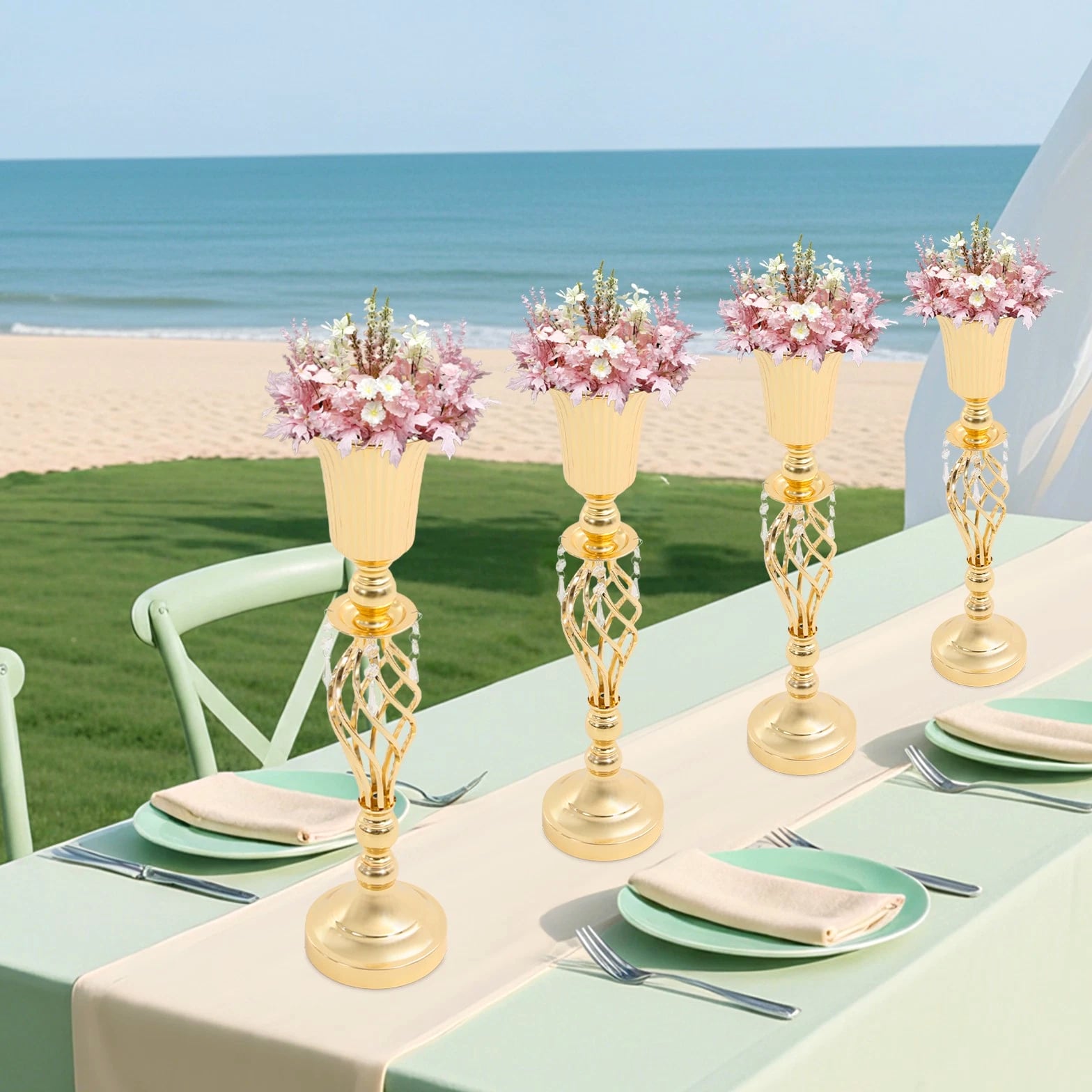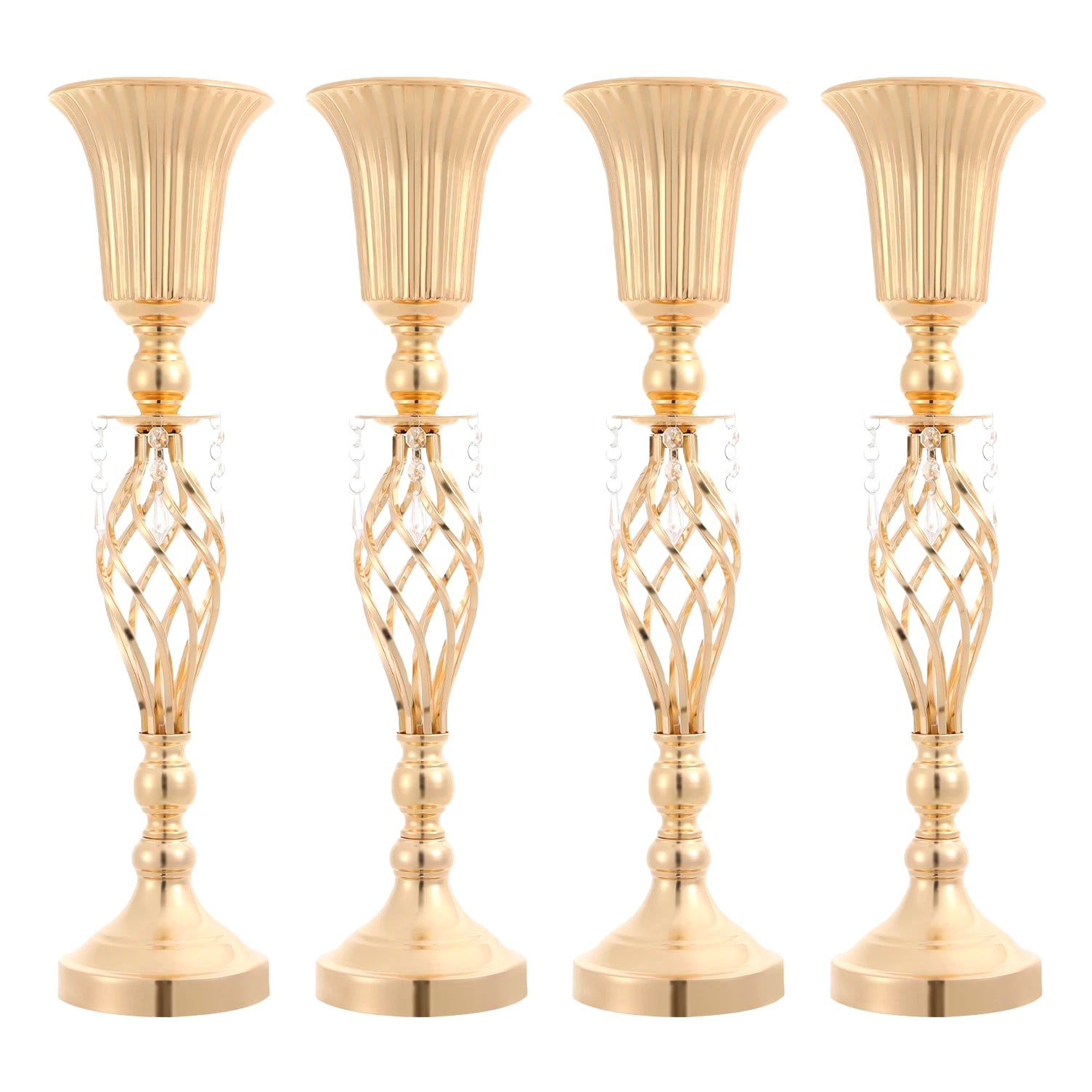 The 4-piece floral vases are excellent additions to your space, blending functionality with aesthetic appeal to transform ordinary environments into inviting, styled settings. Whether used to showcase fresh blooms or decorative greenery, they serve as versatile tools to express personal taste and enhance the ambiance of homes, events, or commercial spaces. Key Features Built to Last: Mainly made of iron with welding and electroplating processes, this product ensures structural rigidity, maintaining its quality through frequent handling and display. Elegant Aesthetic: With its sleek, gold finish, twisted lattice design, and delicate decorative pendants, this product exudes luxurious charm, turning floral arrangements into eye-catching focal points. 4 Pieces Included: Coming in a 4-piece set, this product offers ample flexibility for various scenarios. You can arrange all four together for a grand display or scatter them across different rooms to add consistent decorative flair. Quick Setup: The product's straightforward structure lets you connect the parts easily, so you can start styling floral displays without wasting time on complicated instructions. Practical Design: The 5.7-inch-wide opening makes it easy and enjoyable to arrange and adjust your flowers, allowing you to fit the flower clusters without any hassle. Meanwhile, the 5.51-inch-wide base offers sturdy and reliable foundation for showcasing your beautiful displays. Details Smooth Edges: They enhance the product's refined look and ensure safe handling. Grippy Pad: The pearl cotton pad acts as a soft buffer, preventing scratches, scuffs, or dents caused by friction. Application Suitable for living rooms, dining rooms, banquet halls, wedding venues, birthday parties, coffee shops, hotels, and more. Specifications Color: Gold Style: Modern Material: Iron, Pearl Cotton Process: Welding, Electroplating Assembly Required: Yes Mounting Type: Tabletop Number of Pieces: 4 Base Diameter: