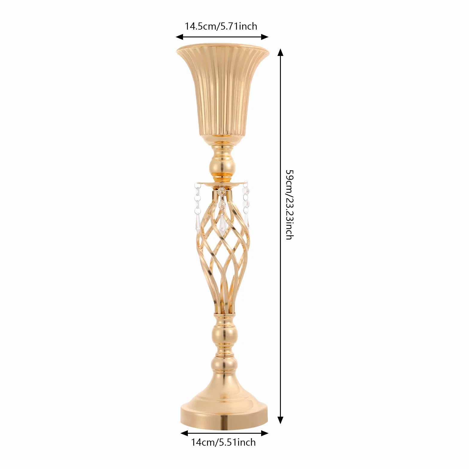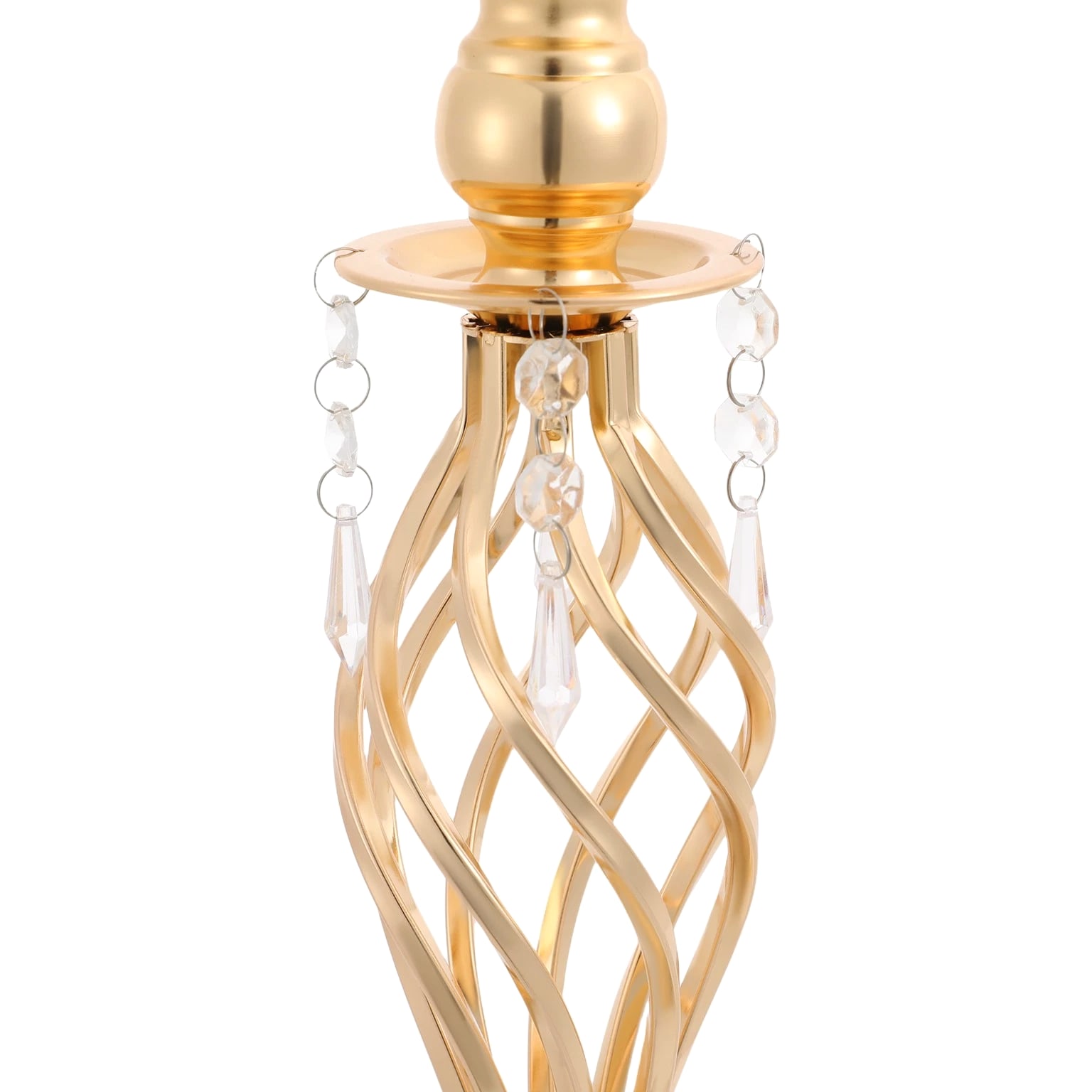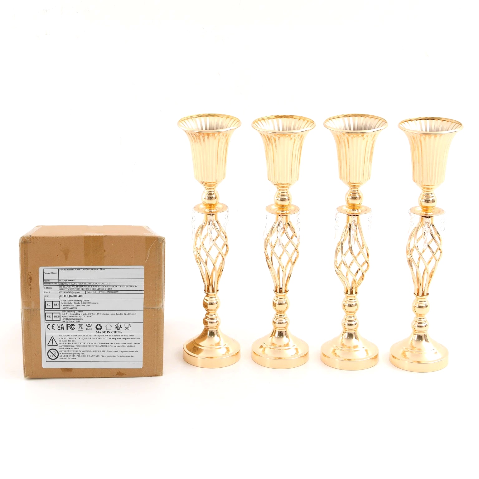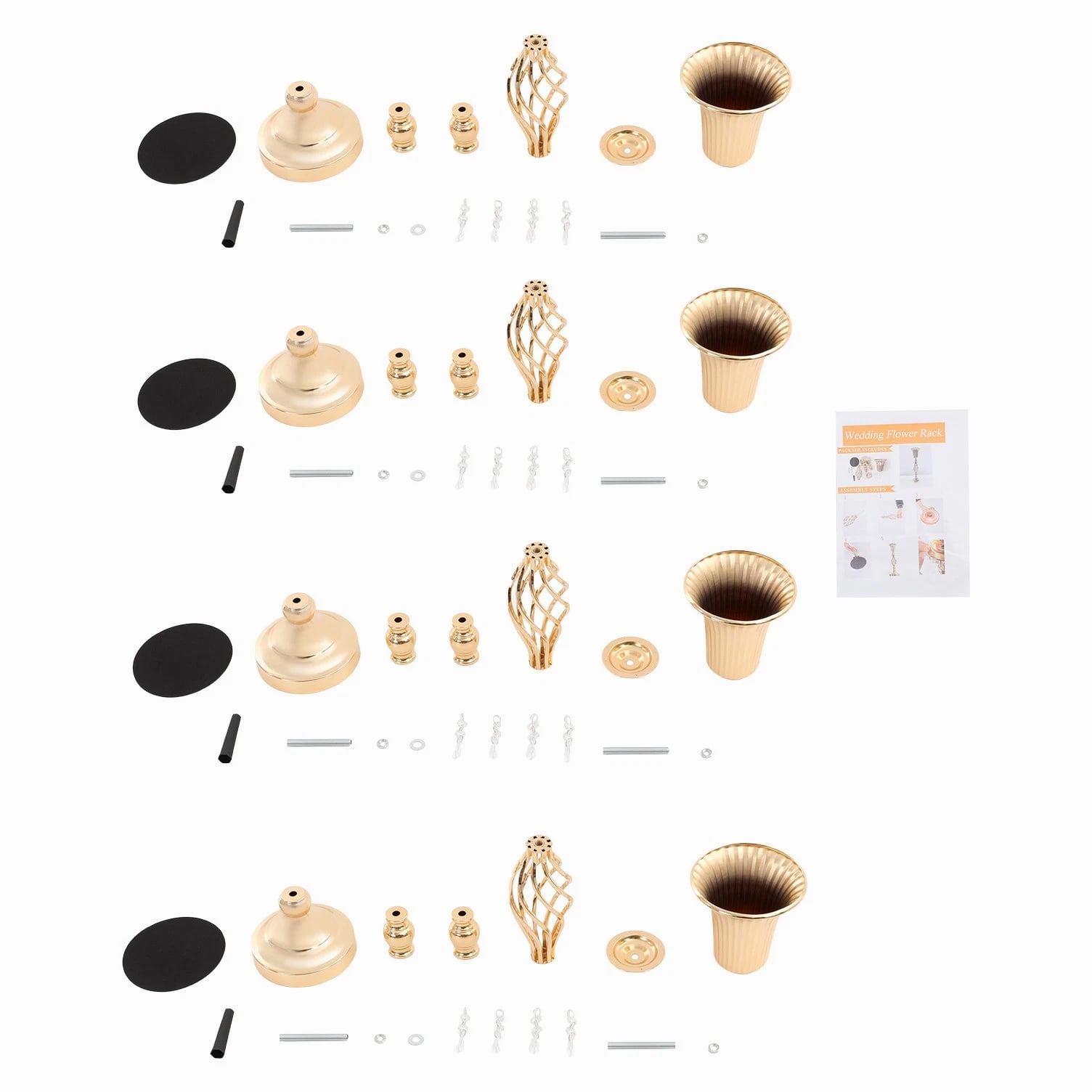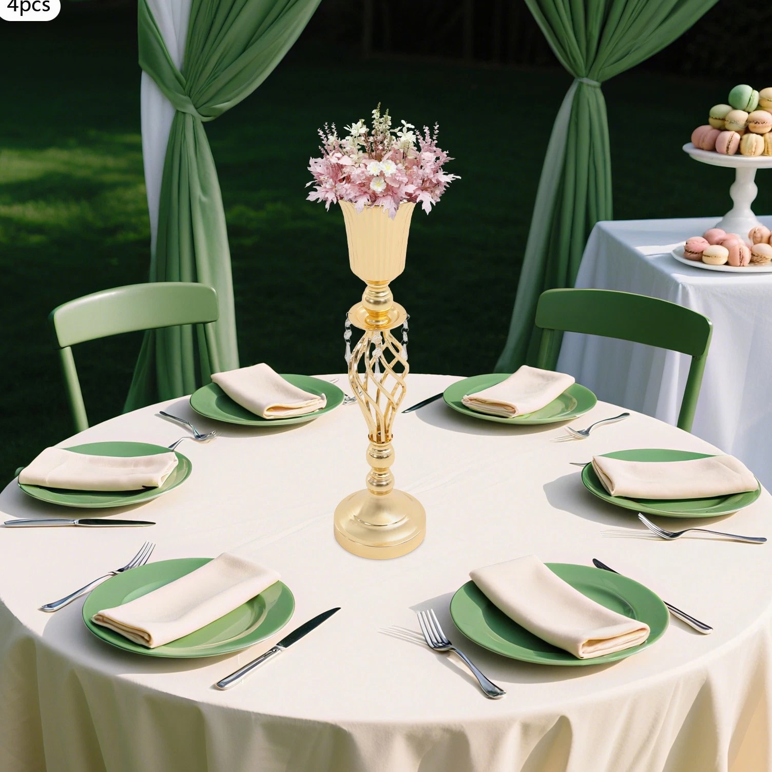 The 4-piece floral vases are excellent additions to your space, blending functionality with aesthetic appeal to transform ordinary environments into inviting, styled settings. Whether used to showcase fresh blooms or decorative greenery, they serve as versatile tools to express personal taste and enhance the ambiance of homes, events, or commercial spaces. Key Features Built to Last: Mainly made of iron with welding and electroplating processes, this product ensures structural rigidity, maintaining its quality through frequent handling and display. Elegant Aesthetic: With its sleek, gold finish, twisted lattice design, and delicate decorative pendants, this product exudes luxurious charm, turning floral arrangements into eye-catching focal points. 4 Pieces Included: Coming in a 4-piece set, this product offers ample flexibility for various scenarios. You can arrange all four together for a grand display or scatter them across different rooms to add consistent decorative flair. Quick Setup: The product's straightforward structure lets you connect the parts easily, so you can start styling floral displays without wasting time on complicated instructions. Practical Design: The 5.7-inch-wide opening makes it easy and enjoyable to arrange and adjust your flowers, allowing you to fit the flower clusters without any hassle. Meanwhile, the 5.51-inch-wide base offers sturdy and reliable foundation for showcasing your beautiful displays. Details Smooth Edges: They enhance the product's refined look and ensure safe handling. Grippy Pad: The pearl cotton pad acts as a soft buffer, preventing scratches, scuffs, or dents caused by friction. Application Suitable for living rooms, dining rooms, banquet halls, wedding venues, birthday parties, coffee shops, hotels, and more. Specifications Color: Gold Style: Modern Material: Iron, Pearl Cotton Process: Welding, Electroplating Assembly Required: Yes Mounting Type: Tabletop Number of Pieces: 4 Base Diameter: