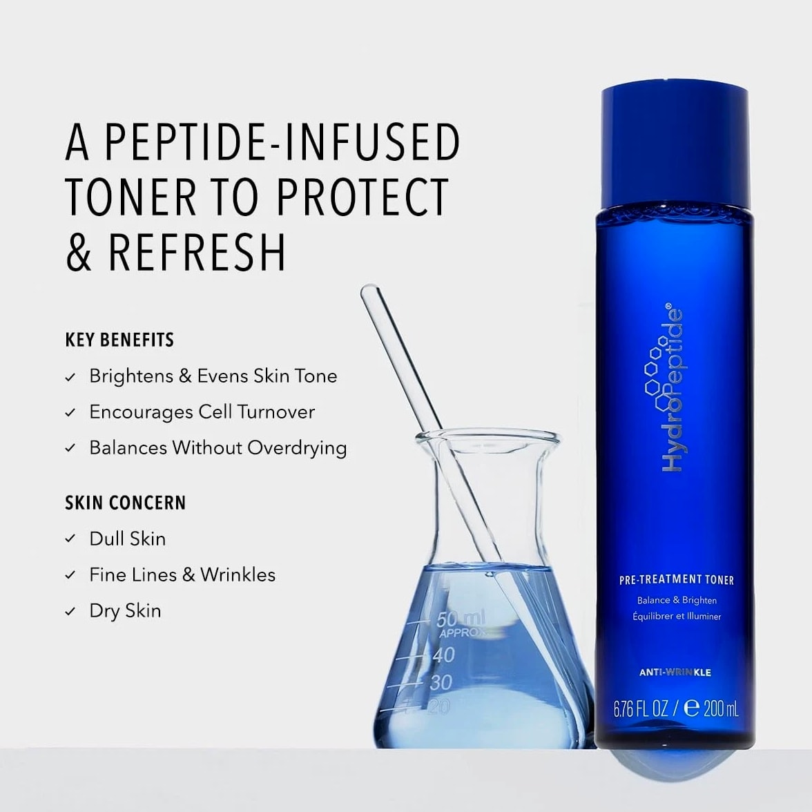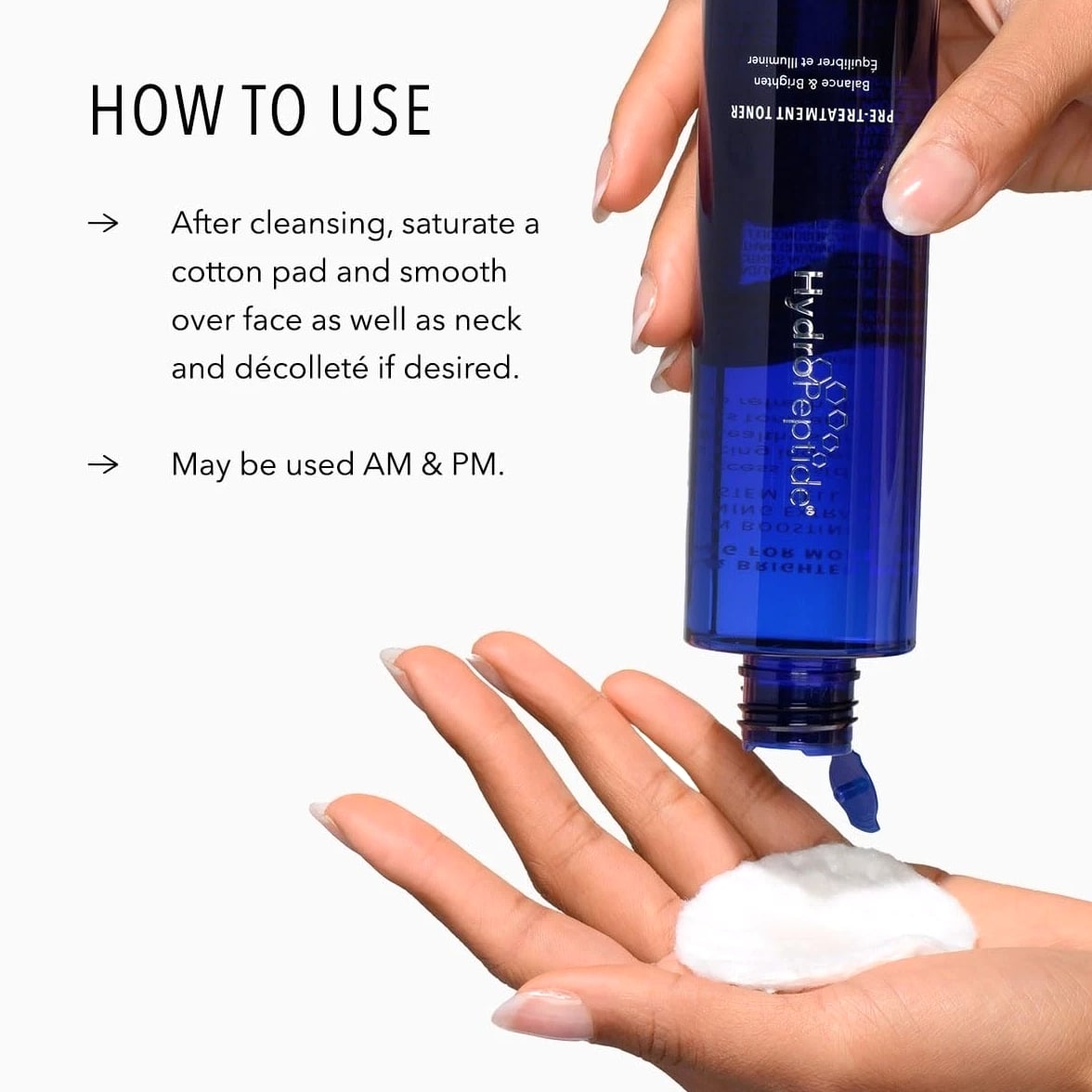 HydroPeptide Pre-Treatment Toner is crafted to enhance your skincare routine by preparing your complexion for optimal treatment absorption. This toner helps balance and brighten the skin, providing a refreshing cleanse after your regular face wash. Infused with a powerful blend of six peptides and natural extracts, it supports overall skin vitality and promotes a more youthful appearance. Suitable for all skin types, this toner is free from sulfates, PEGs, gluten, artificial fragrances, parabens, and Phenoxyethanol, making it a gentle choice for your daily regimen. Benefits: Peptide Power: Helps pre-treat skin with a unique combination of six peptides, including Triple Action Collagen Peptide, promoting visible signs of youthfulness. Citrus Confidence: Enhances skin elasticity through the nourishing benefits of citrus plant cell extract, rich in antioxidants and flavonoids. Brightening Blend: Features 5% Lactic Acid, along with Mulberry, Licorice, Green Tea, and Vitamin C, to encourage a brighter, more even complexion. Skin-Soothing: A comforting formula designed to minimize the appearance of imperfections, leaving skin feeling refreshed and rejuvenated. How to Use: Directions: Apply after cleansing, using a cotton pad to sweep across the skin. Storage: Store in a cool, dry place, away from direct sunlight. Keep out of reach of children. Precautions: Consult a skincare professional prior to usage if necessary.