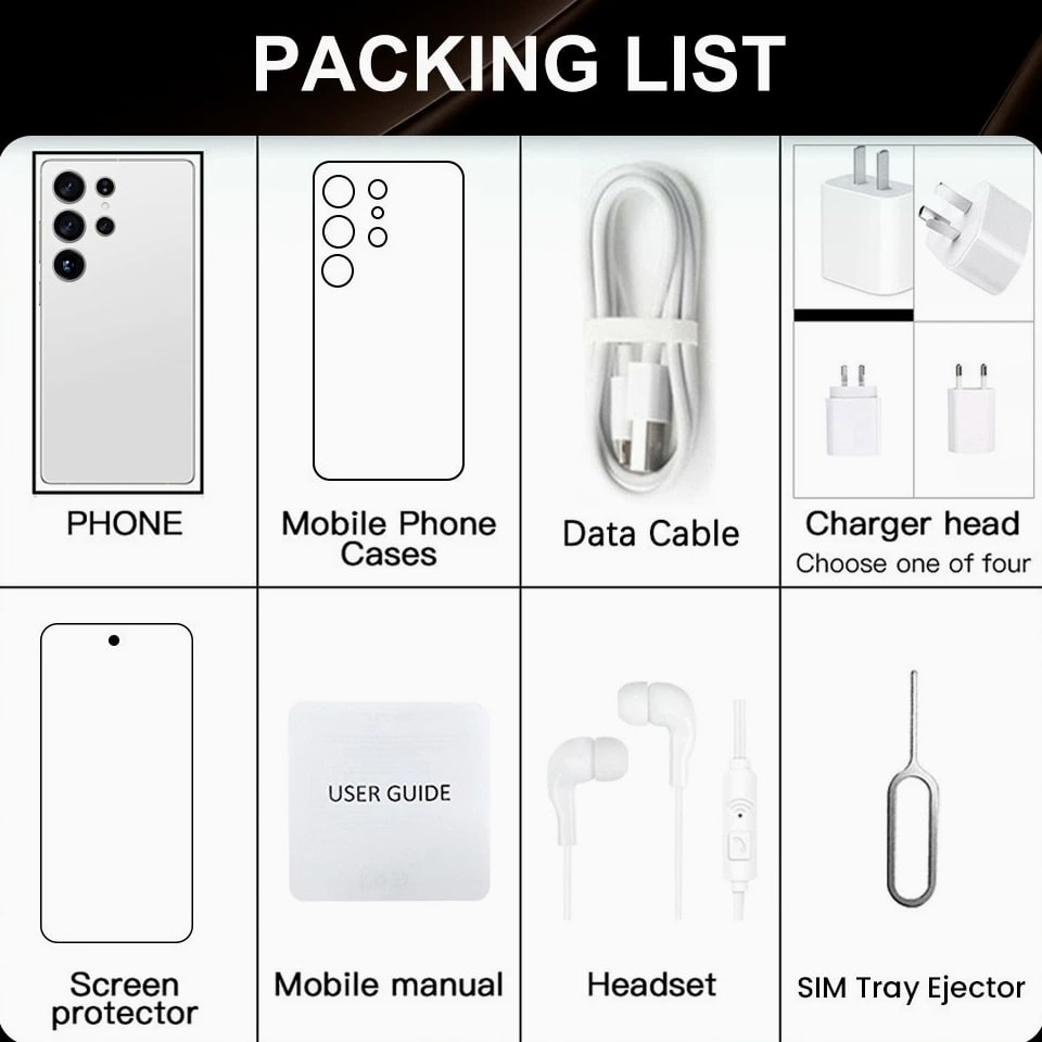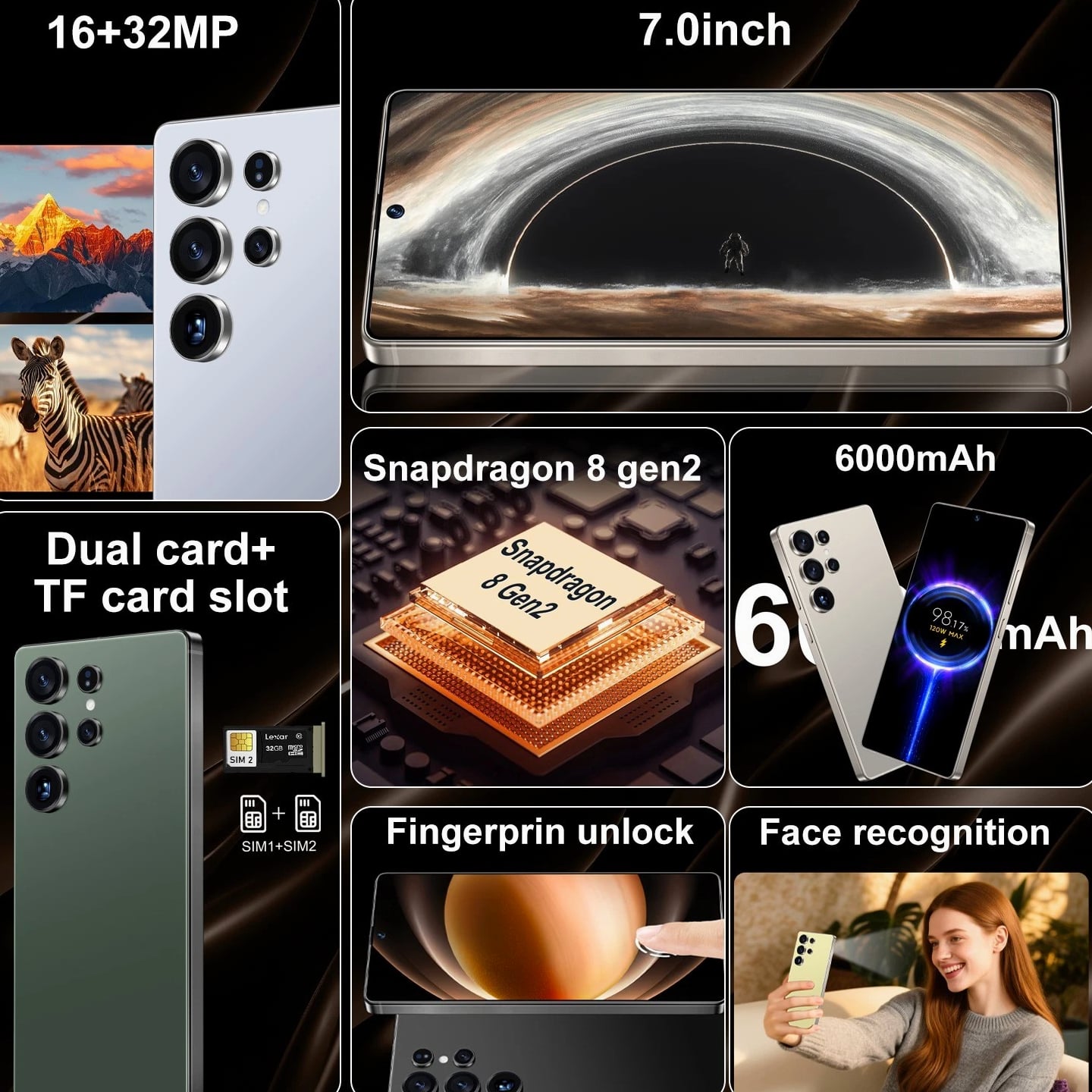 ☑️Specification: 1.Model Number:G25 Ultra 5G S Pen 2.Standby: Dual sim dual standby 3.Processor: snapdragon 8 Gen2,Deca Core Processor 4.Operation System: Android OS 15.0 5.Storage & RAM: 3GB+32GB 6.Battery & Charging: 6000mAh(typ) 5V2A charger & USB-C 7.Screen: 7" HD Full Display 8.Camera:16MP+32MP 9.Expandable Storage & RAM:128GB micro SD (not included) 10.Colors:Black/White/Green/Purple/Grey/DarkPurple/Yellow/Blue 11.Earphone jack:TYPE-C 12.Multi Media:MP3/MP4/3GP/FM Radio/Bluetooth 13.Multi Function: Full screen, Face recognition, Dual SIM, Wi-Fi, GPS, Gravity Sensor, Alarm, Calendar, Calculator, Audio recorder, Video recorder, WAP/MMS/GPRS, Image viewer, World clock 14.Languages: Multi-language support ☑️Package Contents: 1 x G25 Ultra 5G S Pen Smartphone 1 x Charger Adapter, 1 x USB Cable, 1 x Earphone, 1 x Stylus, 1 x User Manual, 1 x Phone case, 1 x Protection film