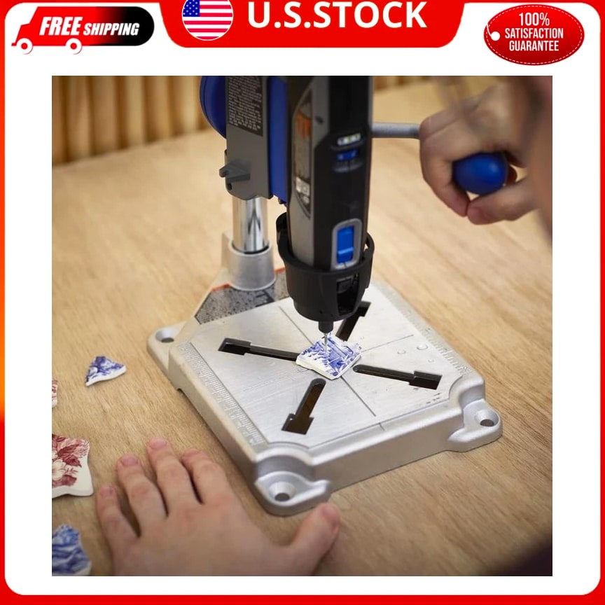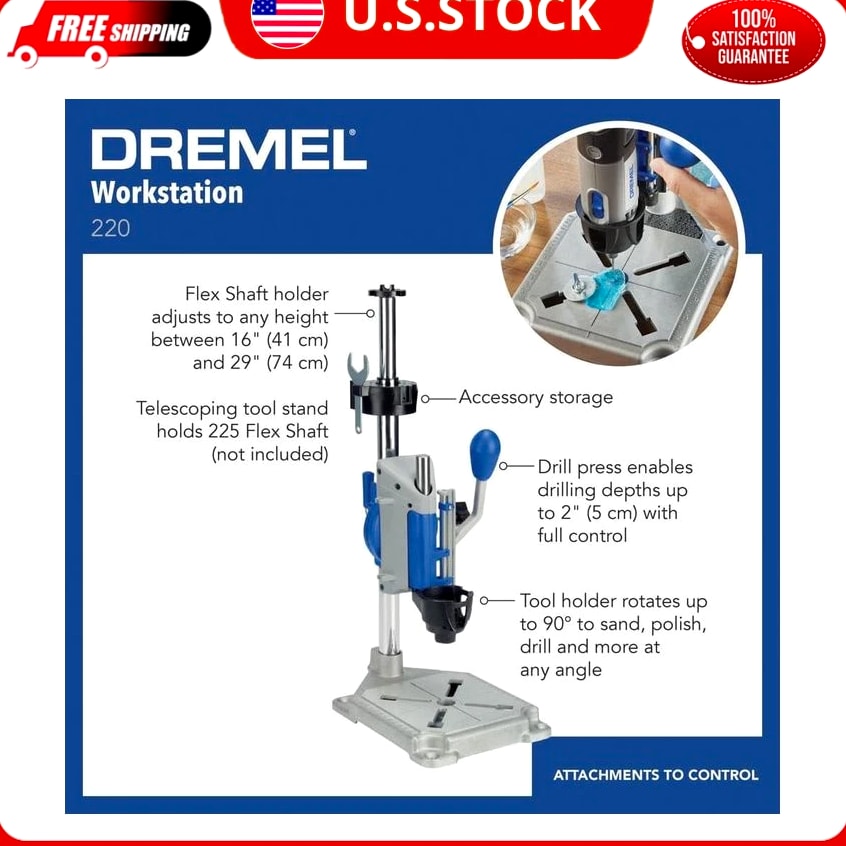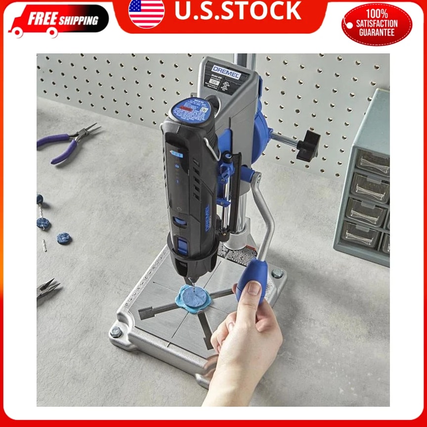 Dremel Drill Press Rotary Tool Workstation Stand with Wrench - Mini Portable Press & Tool Holder - 2 Inch Depth- Ideal for Drilling Perpendicular and Angled Holes - 220-01 Size: No Size Style: Work station Color Blue, Gray, Black Material Metal, Plastic Brand Dremel Item Weight 4.9 Pounds Item dimensions L x W x H 5.98 x 5.98 x 11.81 inches About this item ARTICULATING DRILL PRESS STAND: Drills perpendicular and angled holes in 15-degree increments, up to 90 degrees horizontal. TOOL HOLDER: Holds rotary tool at 90 degrees horizontal for tasks such as polishing metal objects, sanding different shapes and grinding metal pieces. Drill depth- 2 inches COMPATIBILITY: Fits Dremel Rotary Tool Models: 4300, 4000, 3000,200, 100, 8250, 8240, and 8220. FLEX SHAFT TOOL STAND: Allows telescopic adjustment to any height between 16 and 29 inches. CORD MANAGEMENT: Clips included for safe storage of power cords, inch/metric marking on base for accurate drilling of workpiece, depth markings with depth stop - for consistent depth, sturdy metal base with 4 clamping points - to securely hold the station. CONSISTENT DEPTH ADJUSTMENT: Depth markings with depth stop. FREE shipping on all orders! We ship within five business days of payment, usually sooner. We use a selection of shipping services such as UPS, FedEx, USPS etc. We only ship to the lower 48 states, no APO/FPO addresses or PO Boxes allowed. Local pickups and combined shipping options are not provided at this time. You can return a product for up to 30 days from the date you purchased it. Any product you return must be in the same condition you received it and in the original packaging. Please keep the receipt. Your satisfaction is a wonderful reward for our efforts. Please assist us by leaving a positive review if you feel pleased with our service. In the event that you encounter any difficulties related to your order, please do not hesitate to reach out to us directly through the Messaging system