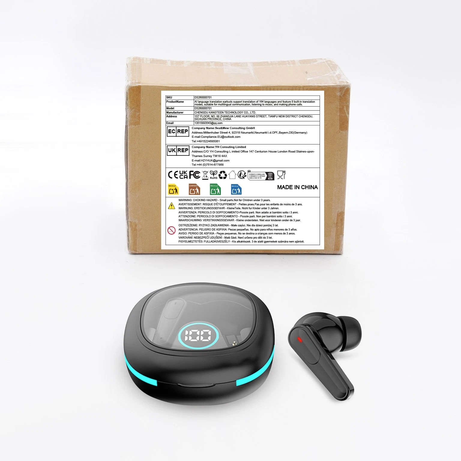 Real-Time AI Translation Earbuds with 164 Languages for Travel Business Learning Key Features Travel Language Companion: It supports accurate real-time translation across 164 global languages and dialects, delivers instant responses in noisy environments (0.2 seconds), and enables easy conversations for directions, dining, and shopping—making a personal translator always within reach, without extra fees. 8-in-1 Translation Modes: It features free talk, interpreter, earbud+phone, video call, photo translate, voice note, AI chat, and simultaneous interpretation modes, enabling versatile and easy multilingual communication anytime, anywhere. Business & Social Partner: The microphone captures sound with precision, enabling simultaneous translation during business negotiations to prevent semantic discrepancies. When conversing with overseas contacts, a single click on the headset automatically translates both parties' speech (headset + mobile mode), making chats flow as naturally as with a native speaker. It also supports multi-person group translation, ensuring uninterrupted conversation during gatherings and social events. Long-Lasting Battery: It offers extended usage on a single charge for continuous translation, music playback, and calls, reliably supporting long-haul flights and smoothly switching between entertainment and communication with stable Bluetooth connectivity and clear, high-quality audio. Simple to Use: It pairs easily via Bluetooth after removal from the charging case, activates translation mode through an intuitive app setup, and features an ergonomic design for comfortable extended wear—making multilingual communication easy and accessible anytime. Details Charging Case: It comes with a battery-level display that shows precise remaining power, so you always know when to recharge. Charging Cable: It includes a widely compatible charging cable that ensures quick and convenient power replenishment for both the earbuds and the smart charging case, keeping your