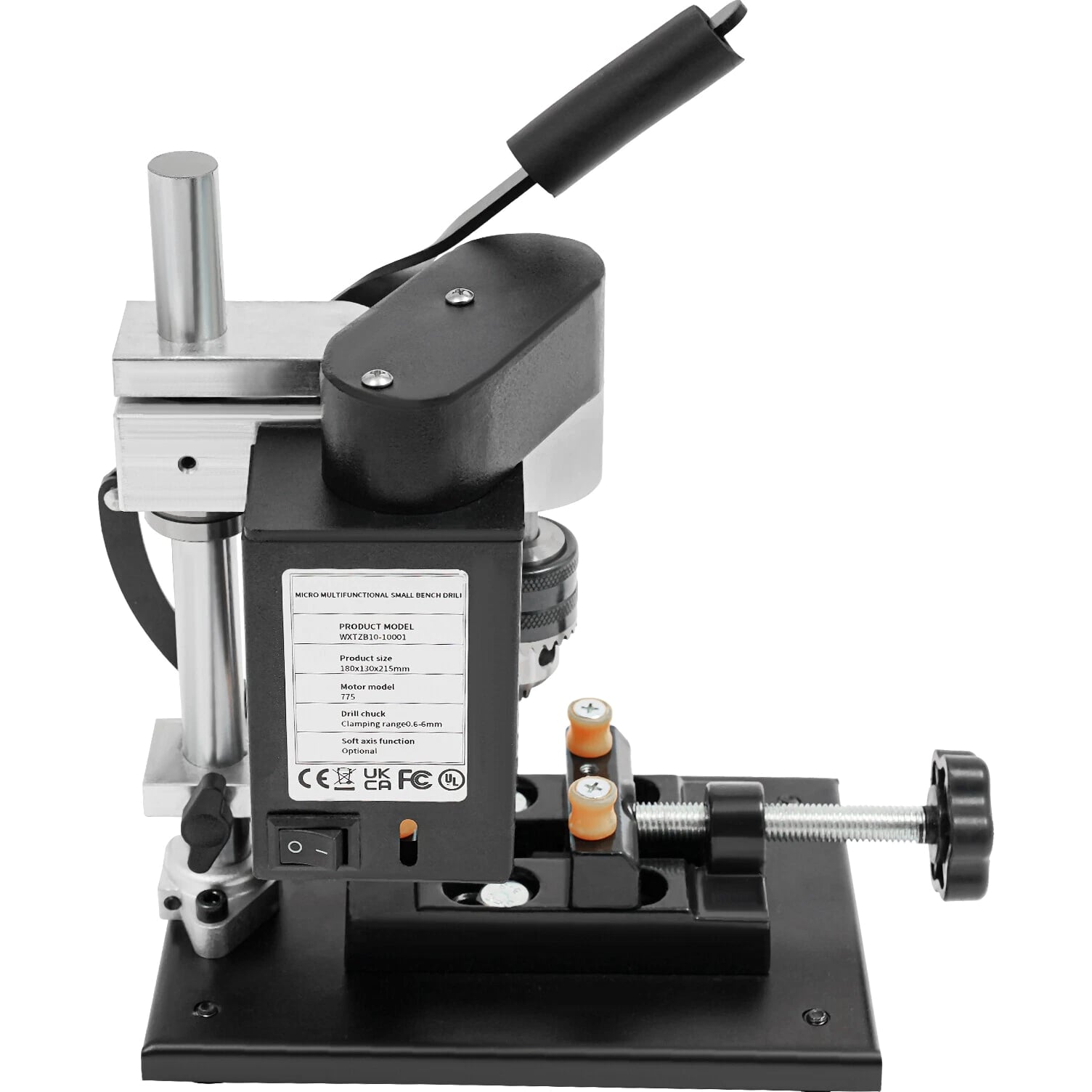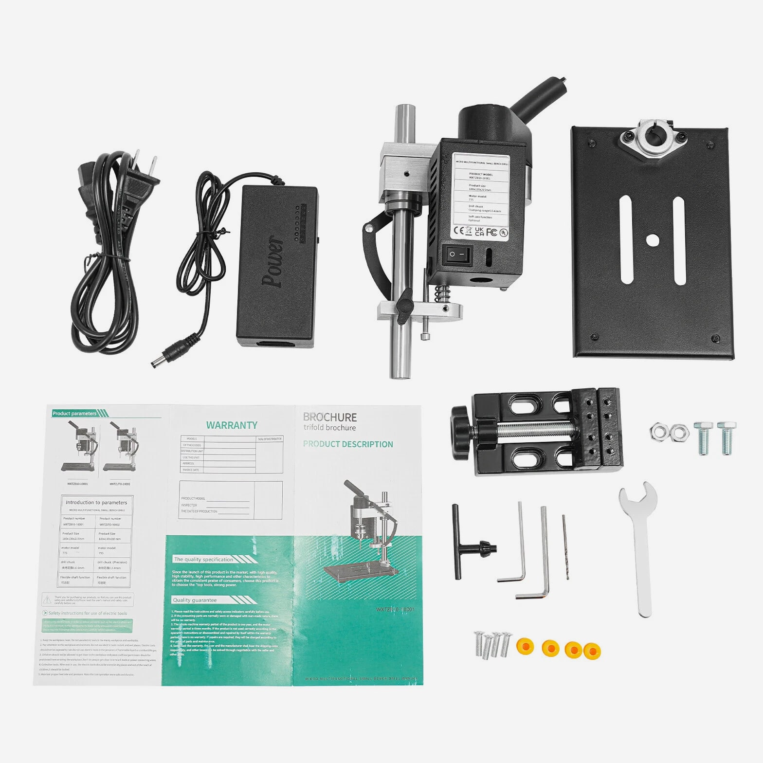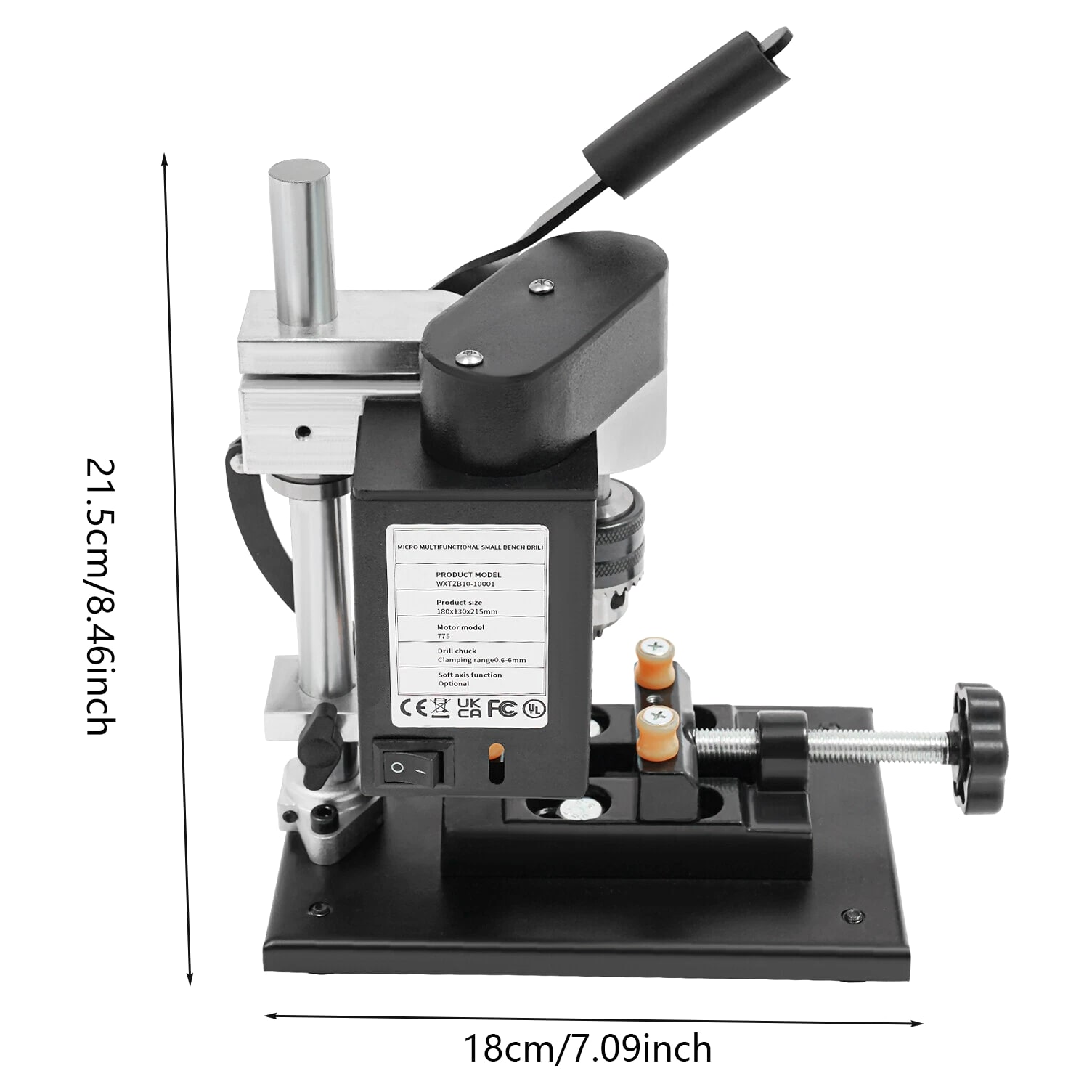 Power Bench Drill, Mini Drill Press, Adjustable Speed Electric Drilling Machine Description This lightweight and compact mini drill press will be a great choice for your home, workshop, or school hand DIY. It adopts a premium motor, drill bit, and easy operation, which gives the product efficient and smooth drilling performance. In addition, the seven-speed adjustable power supply allows the product to face the challenge of machining workpieces of different materials and shapes smoothly, giving you an excellent user experience. Key Features Long Service Life: The product adopts the plastic spraying process and is made of cold-rolled steel, aluminum alloy, and #45 steel, which is hard to break and deform and boasts excellent rust resistance, corrosion resistance, and high durability. Variable Speed: The 7-speed adjustable power supply allows this product to flexibly handle a variety of different materials, thicknesses, and shapes of the workpiece, meeting your needs for a variety of manual work. High-precision Chuck: The three-jaw high-precision chuck ensures stable clamping and higher drilling precision. In addition, the 0.02-0.24in clamping range allows the product to be used with different drill bit sizes to obtain different hole diameters. Wide Compatibility: The bench clamp features an adjustable range of 0-1.97in and 4 columns to stabilize spherical objects, allowing you to drill workpieces of different shapes with stability and ease. In addition, the height-adjustable head (1.97in) allows you to drill different depths and handle different sizes of workpieces. Compact & Lightweight: The compact size(7.09*8.46in) and lightweight(6.39 lbs) allow you to move the product easily and make it stable and perform even on a small table. Simple Assembly: The English manual and needed accessories can help you finish the assembly with less time and effort. Safety Guarantee: The product is equipped with overload protection, which can prevent damage to the product