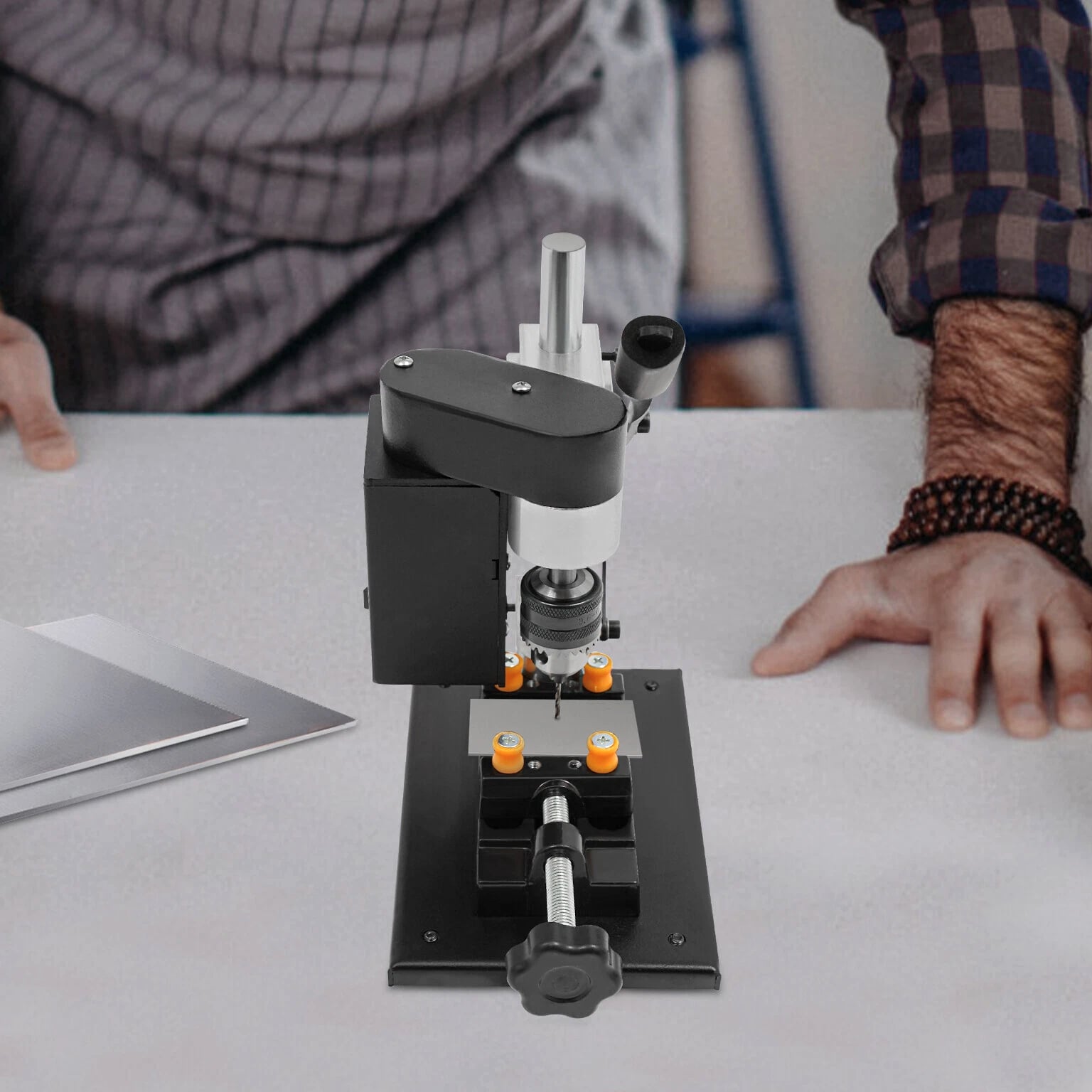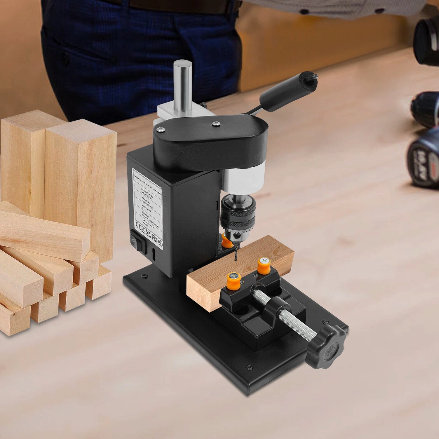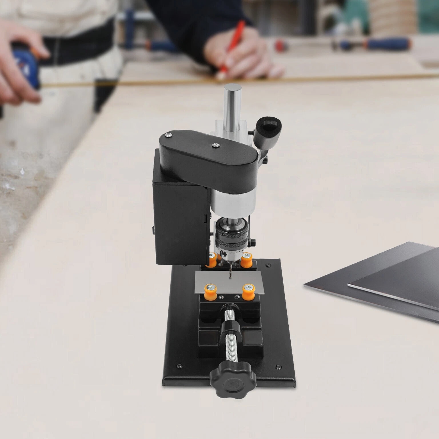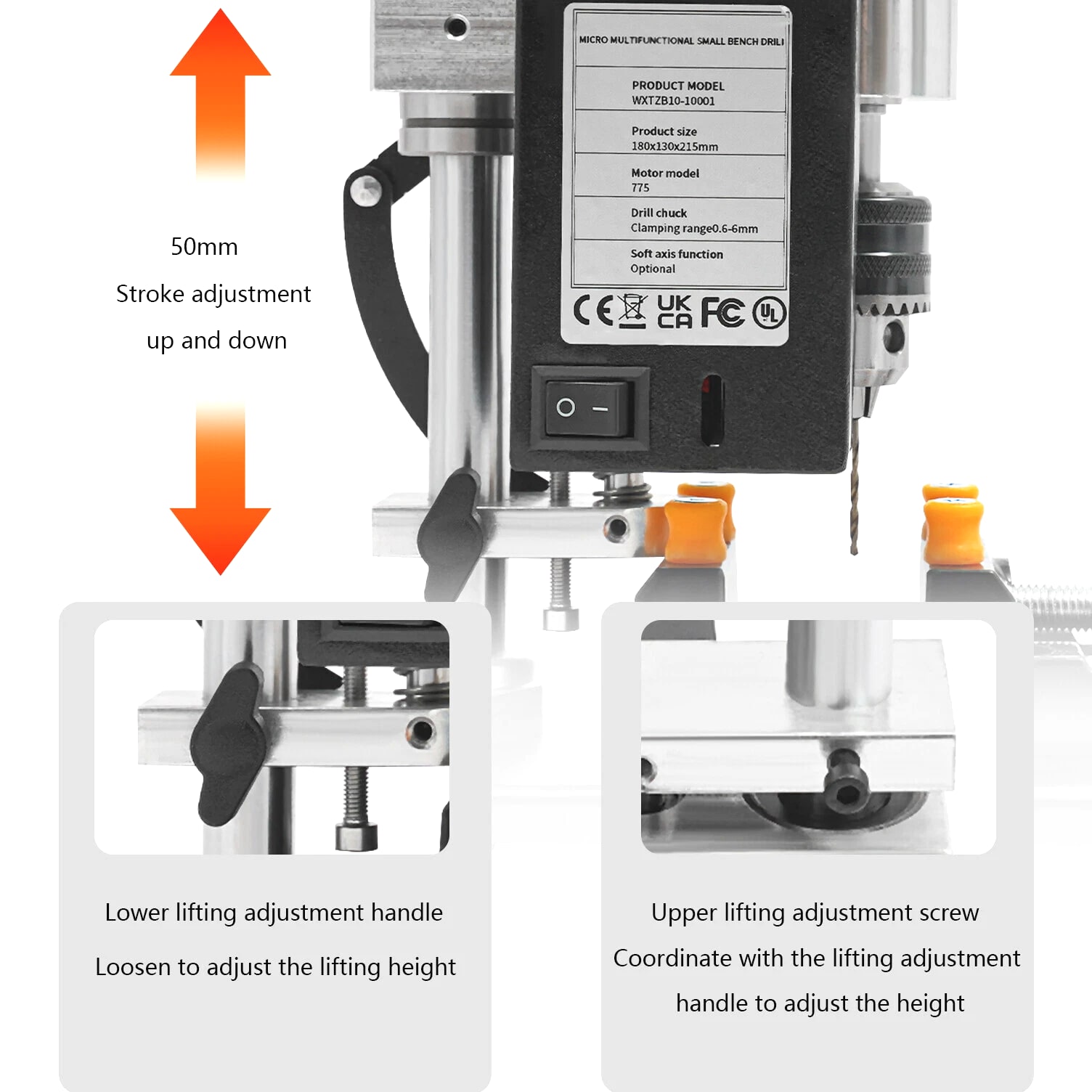 Power Bench Drill, Mini Drill Press, Adjustable Speed Electric Drilling Machine Description This lightweight and compact mini drill press will be a great choice for your home, workshop, or school hand DIY. It adopts a premium motor, drill bit, and easy operation, which gives the product efficient and smooth drilling performance. In addition, the seven-speed adjustable power supply allows the product to face the challenge of machining workpieces of different materials and shapes smoothly, giving you an excellent user experience. Key Features Long Service Life: The product adopts the plastic spraying process and is made of cold-rolled steel, aluminum alloy, and #45 steel, which is hard to break and deform and boasts excellent rust resistance, corrosion resistance, and high durability. Variable Speed: The 7-speed adjustable power supply allows this product to flexibly handle a variety of different materials, thicknesses, and shapes of the workpiece, meeting your needs for a variety of manual work. High-precision Chuck: The three-jaw high-precision chuck ensures stable clamping and higher drilling precision. In addition, the 0.02-0.24in clamping range allows the product to be used with different drill bit sizes to obtain different hole diameters. Wide Compatibility: The bench clamp features an adjustable range of 0-1.97in and 4 columns to stabilize spherical objects, allowing you to drill workpieces of different shapes with stability and ease. In addition, the height-adjustable head (1.97in) allows you to drill different depths and handle different sizes of workpieces. Compact & Lightweight: The compact size(7.09*8.46in) and lightweight(6.39 lbs) allow you to move the product easily and make it stable and perform even on a small table. Simple Assembly: The English manual and needed accessories can help you finish the assembly with less time and effort. Safety Guarantee: The product is equipped with overload protection, which can prevent damage to the product
