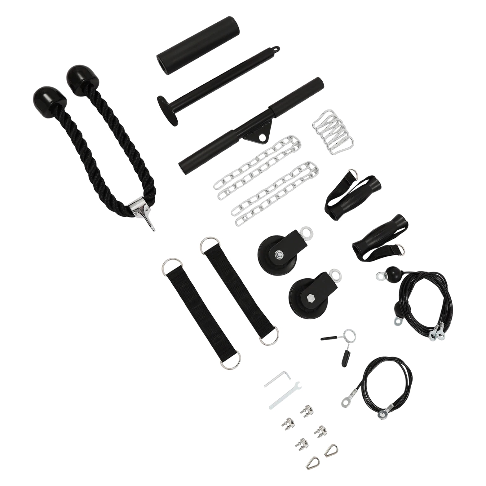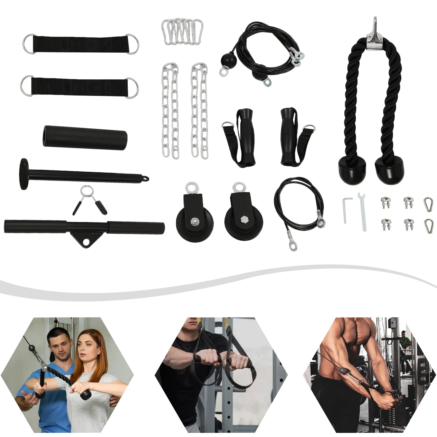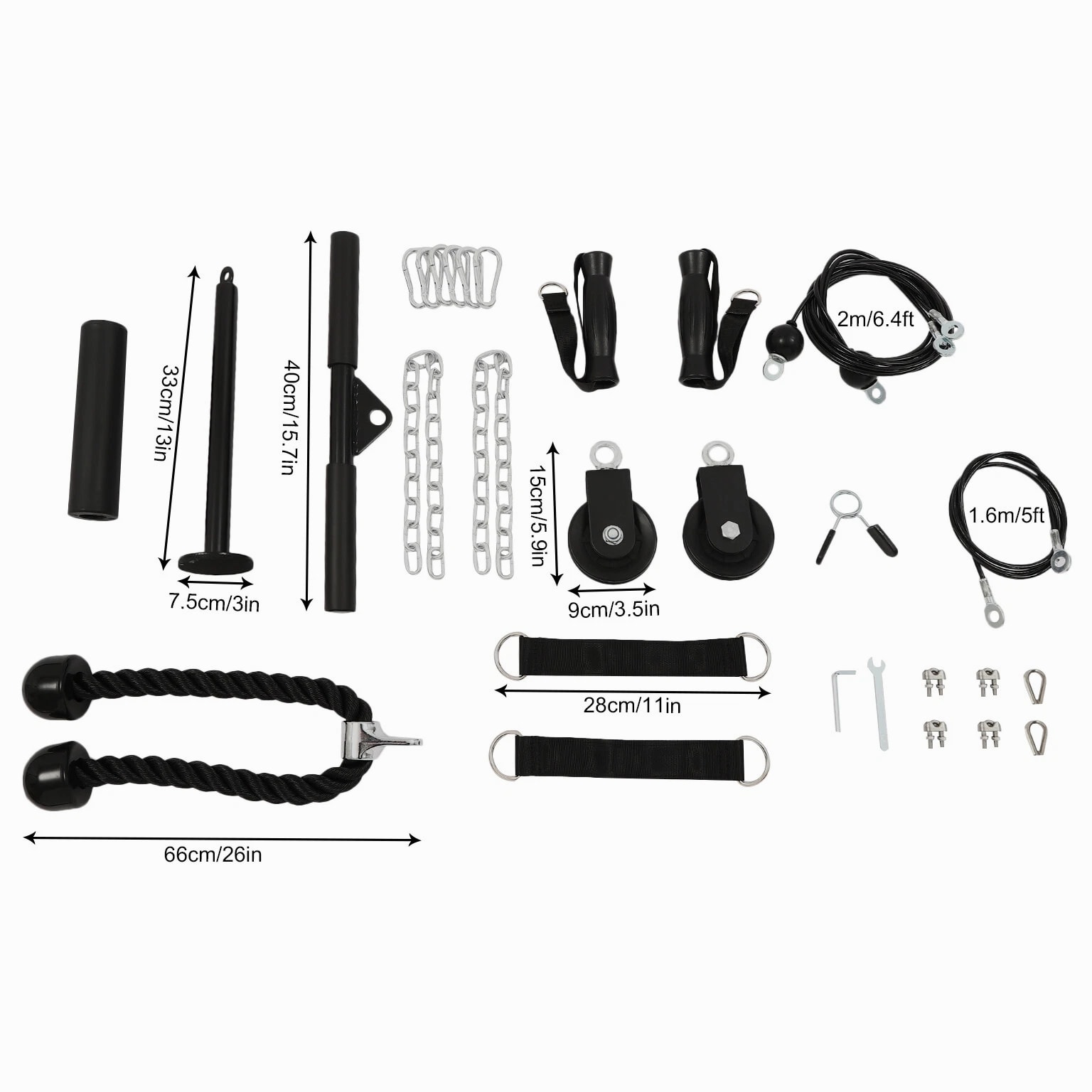 Cable Weight Pulley System, Home Gym Equipment, Fitness Cable Pulley System Cable Weight Pulley System, Home Gym Equipment, Fitness Cable Pulley System Description Are you struggling with large machines that lack flexibility to work your target muscle groups? Try this fitness pulley cable system, which you can assemble flexibly and freely according to your workout needs. With a maximum weight capacity of 330 lbs, it's ideal for both novice and experienced users and is suitable for both targeted training and daily workouts. Key Features Built to Last: The premium steel and plastic provide the product with high hardness and strength, ensuring that it can withstand intense use and have a long service life. High Load Bearing: Thanks to its sturdy construction and quality materials, it can hold up to 330 lbs, which brings you comfortable and safe use. Exercise Assistant: It is designed to build strength and muscle in the upper body by focusing on the biceps, triceps, shoulders, back, latissimus dorsi, and more. Additionally, it can help you increase coordination, improve endurance, and burn fat. Powerful Accessories: With accessories such as steel cables, a locking pin, hanging straps, pulleys, extension chains, a tricep rope, a straight bar, and fly handles, you can complete different combinations to work different muscle groups and save money on other equipment. Simple Assembly: You can easily connect the accessories to power racks, squat rack, pull-up bars, beams, and other places where you can install the strap. Easy Clean-up: Thanks to its simple construction and smooth surface, you can wipe it clean with a damp rag. Protective Package: The bubble bag can better protect your product during transportation so that it can be delivered to you completely to the greatest extent. Ideal Gift: The practical function makes this product an ideal gift for a fitness-loving friend, colleague, or family member. Details Hoist Buckles: They can help link fitness equipme