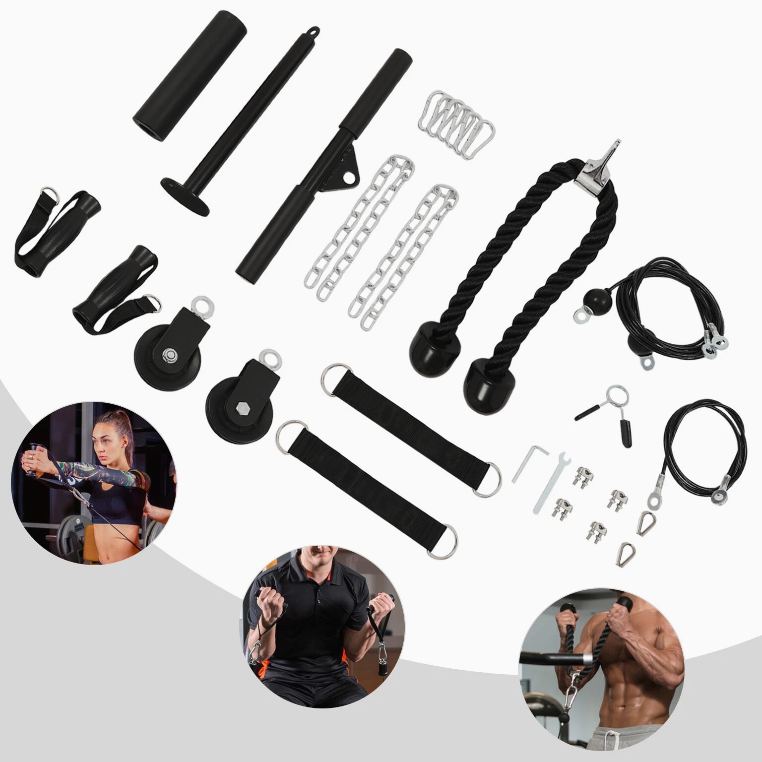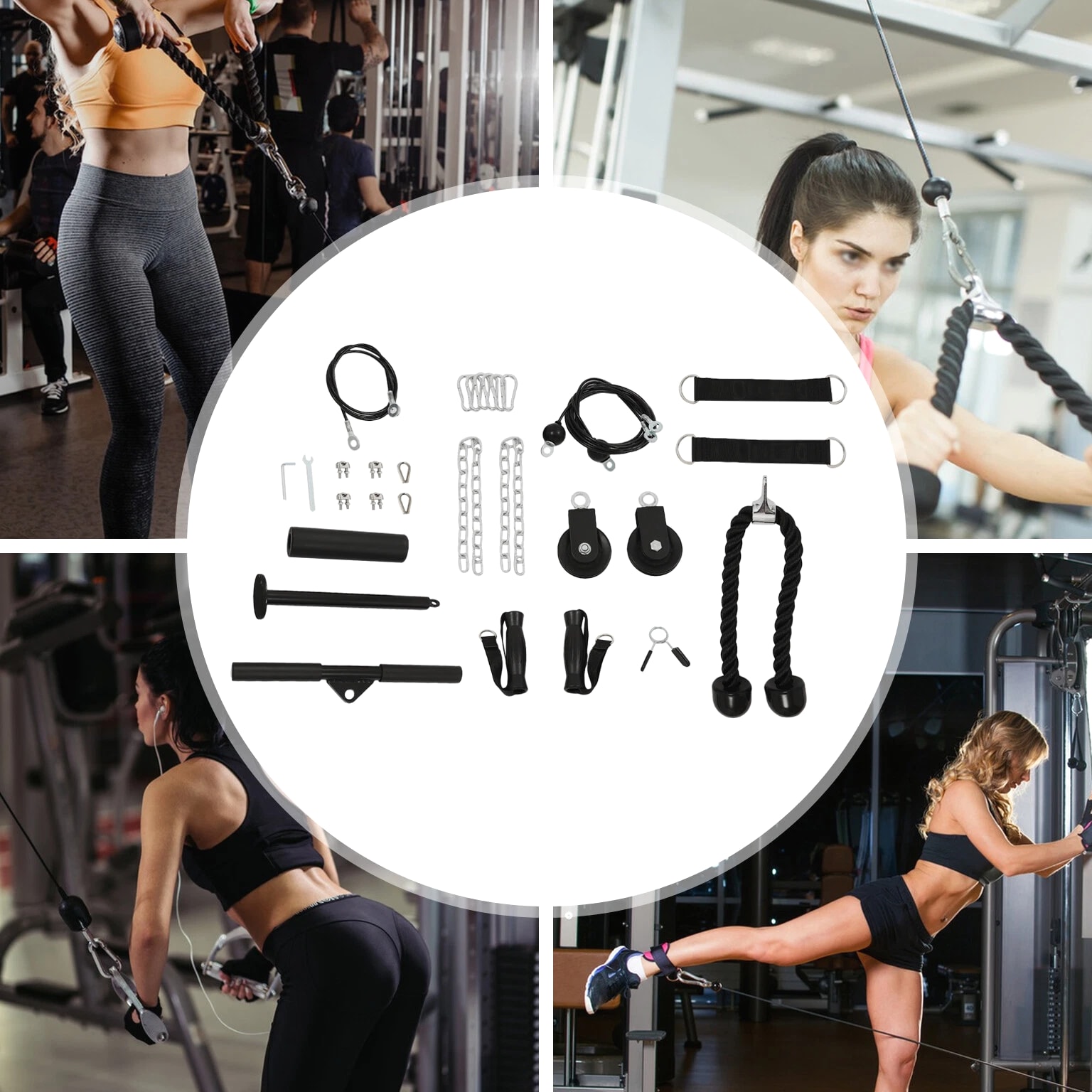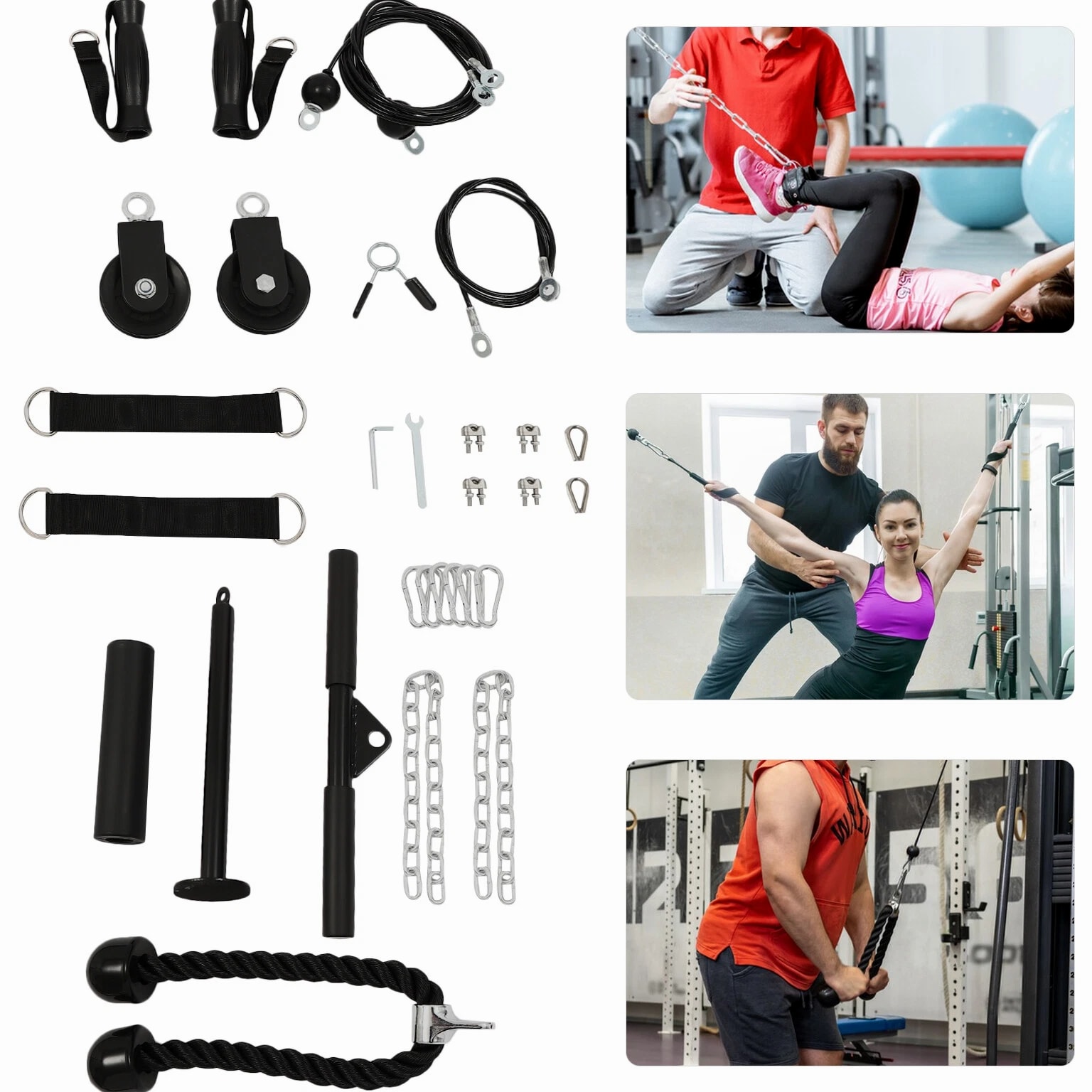 Cable Weight Pulley System, Home Gym Equipment, Fitness Cable Pulley System Cable Weight Pulley System, Home Gym Equipment, Fitness Cable Pulley System Description Are you struggling with large machines that lack flexibility to work your target muscle groups? Try this fitness pulley cable system, which you can assemble flexibly and freely according to your workout needs. With a maximum weight capacity of 330 lbs, it's ideal for both novice and experienced users and is suitable for both targeted training and daily workouts. Key Features Built to Last: The premium steel and plastic provide the product with high hardness and strength, ensuring that it can withstand intense use and have a long service life. High Load Bearing: Thanks to its sturdy construction and quality materials, it can hold up to 330 lbs, which brings you comfortable and safe use. Exercise Assistant: It is designed to build strength and muscle in the upper body by focusing on the biceps, triceps, shoulders, back, latissimus dorsi, and more. Additionally, it can help you increase coordination, improve endurance, and burn fat. Powerful Accessories: With accessories such as steel cables, a locking pin, hanging straps, pulleys, extension chains, a tricep rope, a straight bar, and fly handles, you can complete different combinations to work different muscle groups and save money on other equipment. Simple Assembly: You can easily connect the accessories to power racks, squat rack, pull-up bars, beams, and other places where you can install the strap. Easy Clean-up: Thanks to its simple construction and smooth surface, you can wipe it clean with a damp rag. Protective Package: The bubble bag can better protect your product during transportation so that it can be delivered to you completely to the greatest extent. Ideal Gift: The practical function makes this product an ideal gift for a fitness-loving friend, colleague, or family member. Details Hoist Buckles: They can help link fitness equipme