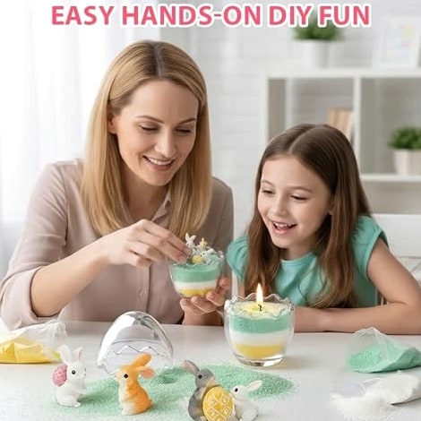 All-in-One Easter Craft Kit: This DIY sand candle kit includes 3 packs of vibrant sand wax, 10 cotton wicks, an egg-shaped glass jar, and 5 adorable bunny & egg resin figurines. Everything needed to create your own Easter candles in one beautiful gift set. Easy DIY – No Melting Required: Simply layer the colorful candle sand, insert the wick, and arrange the bunny and egg ornaments to create your own Easter sand candle. This beginner-friendly craft activity is relaxing, creative, and perfect for spring DIY projects. Premium Quality & Elegant Design: Made with carefully selected sand wax for a smooth crafting experience. Paired with durable resin decorations and an elegant egg-shaped glass jar, this kit creates a beautiful decorative accent for Easter and spring. Charming Easter & Spring Décor: Design a festive bunny or egg-inspired candle that doubles as seasonal home décor. Ideal for Easter tables, shelves, mantels, centerpieces, and spring displays that bring warmth and cheerful holiday atmosphere. Perfect Easter Gift Idea: A creative DIY craft kit perfect for Easter baskets, spring birthdays, or holiday surprises. This thoughtful gift for women, teens, and kids doubles as charming seasonal home décor and a fun family activity. FREE shipping to lower 48 states from US-based warehouse. Orders ship within 24-72 hours of payment.