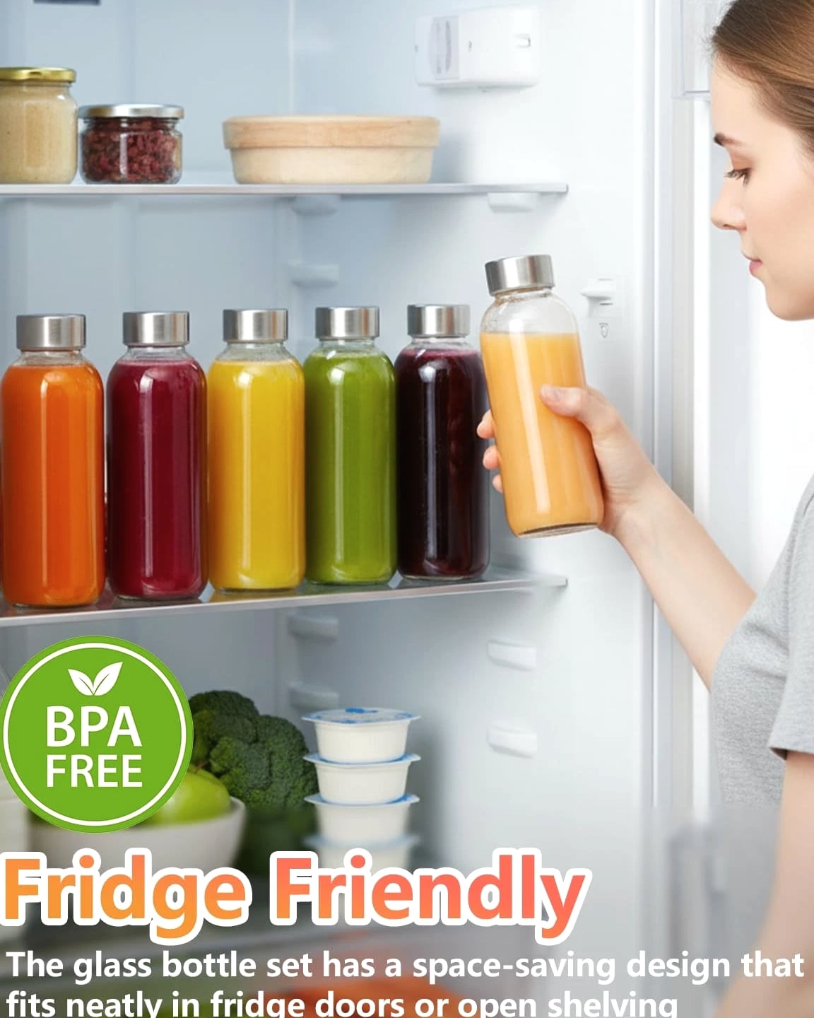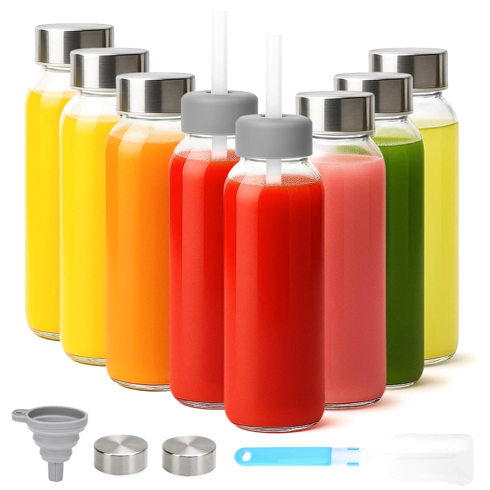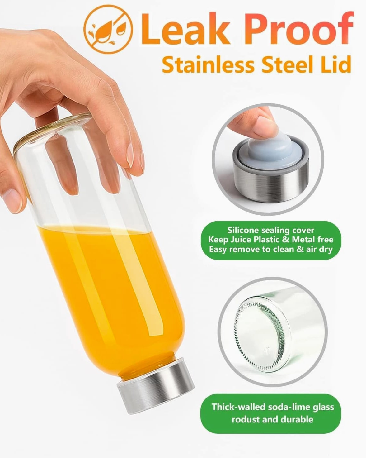 Elevate your hydration with 16 oz glass water bottles featuring Lids — the perfect blend of function, durability, safety, and sleek style. This 8-pack of glass juicing bottles is crafted from premium thick soda-lime glass, known for its durability and crystal clarity. Whether you are storing fresh juice, mixing nutrient-packed smoothies, or creating flavorful infused water, these bottles make every sip pure and refreshing. Each bottle features a regular mouth for easy filling and cleaning — ideal for busy mornings or prepping ahead. The leak-proof airtight stainless steel lids ensure a secure seal, keeping your beverages fresh and your bag or fridge dry. Compact in size, these beverage containers are fridge-friendly and portable for work, gym, or on-the-go use. Designed for the health-conscious and eco-minded, they are BPA-free, reusable, and safe for cold beverages. Say goodbye to plastic and hello to an elegant, sustainable solution for a clean, pure drinking experience. DURABILITY & REUSABLE & HEALTHY QUALITY: 16 oz juicing bottles are made from premium quality food-safe thick glass with superior chemical and impact resistance, which is BPA and Lead free. These reusable glass bottles with lids are a sustainable choice for enjoying your favorite juices and supporting a healthier planet. The juicing bottles reusable glass are designed to be super tough and withstand a long time of use. Say goodbye to disposable cups and contribute to a greener environment. GLASS BOTTLES WITH STRAWS FOR JUICING, WATER AND MORE: Durable stainless steel lids with air and water-tight seals, it's completely airtight to keep your beverage fresh without any worry of spills and oxygen can't get in to break down the enzymes and ruin your juices. Toss this glass water bottle in your bag or car and get a healthy start to your day with a juice, smoothie, milk, protein shakes, ice tea, milkshakes. This 100% leak-proof glass bottle will never leave a leaky mess. STAY HYDRATED WHEREVER YOU GO: The slim design fits easily in bags and cup holders.