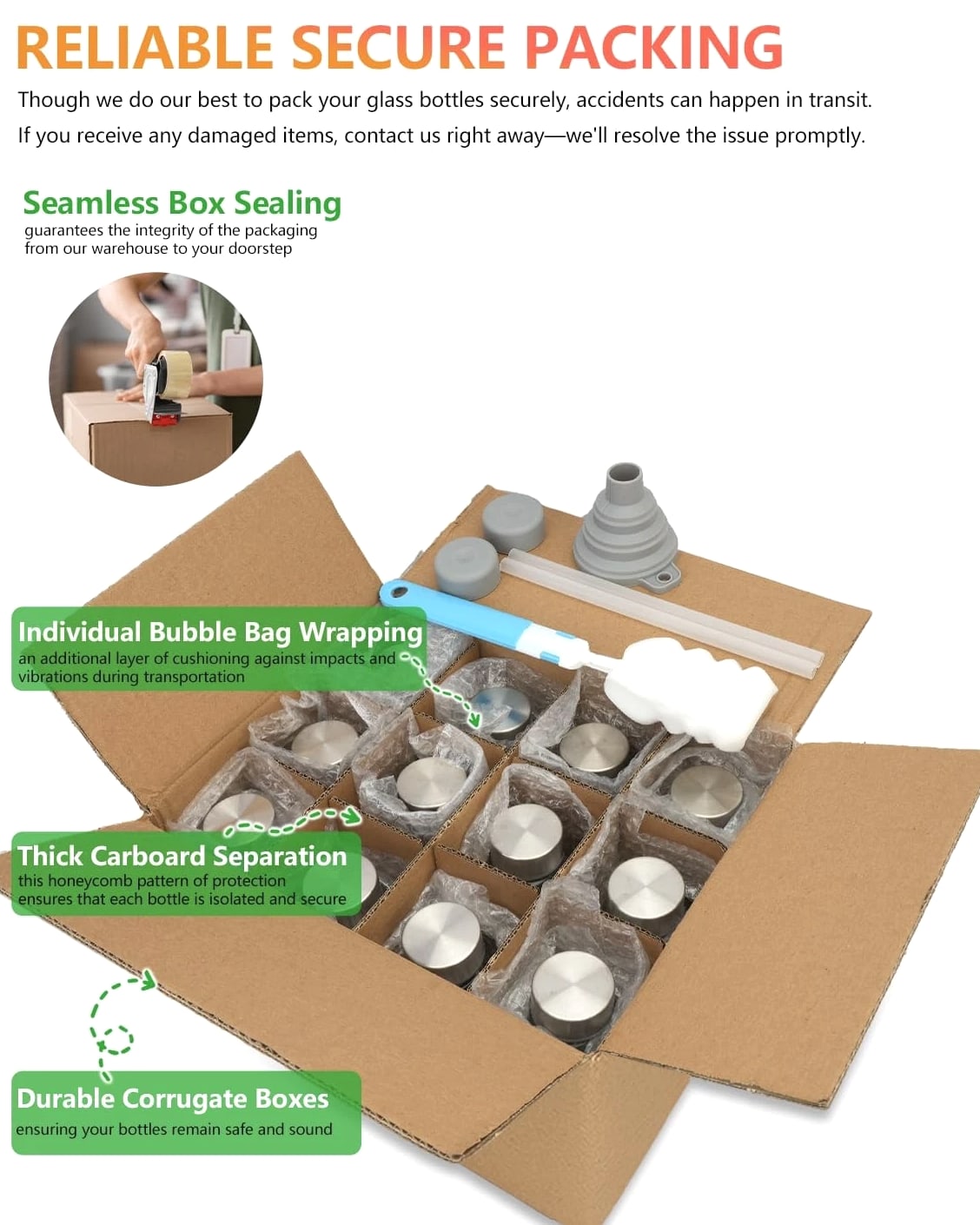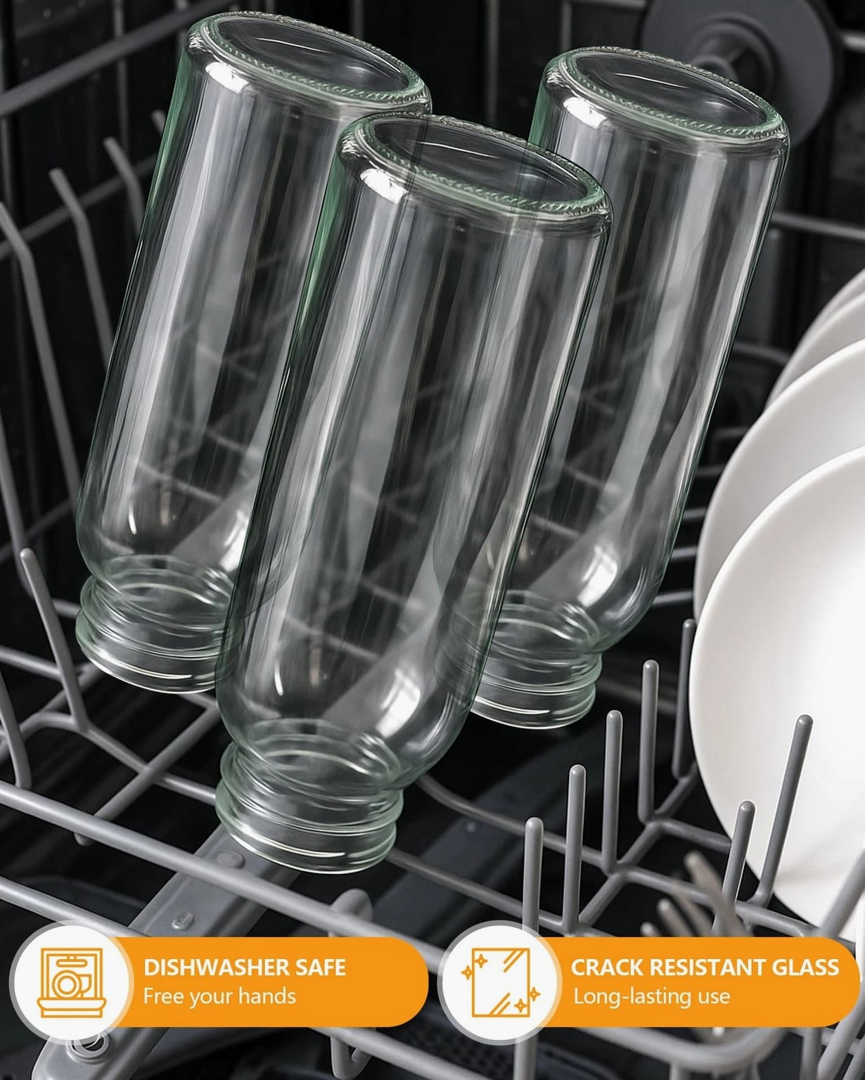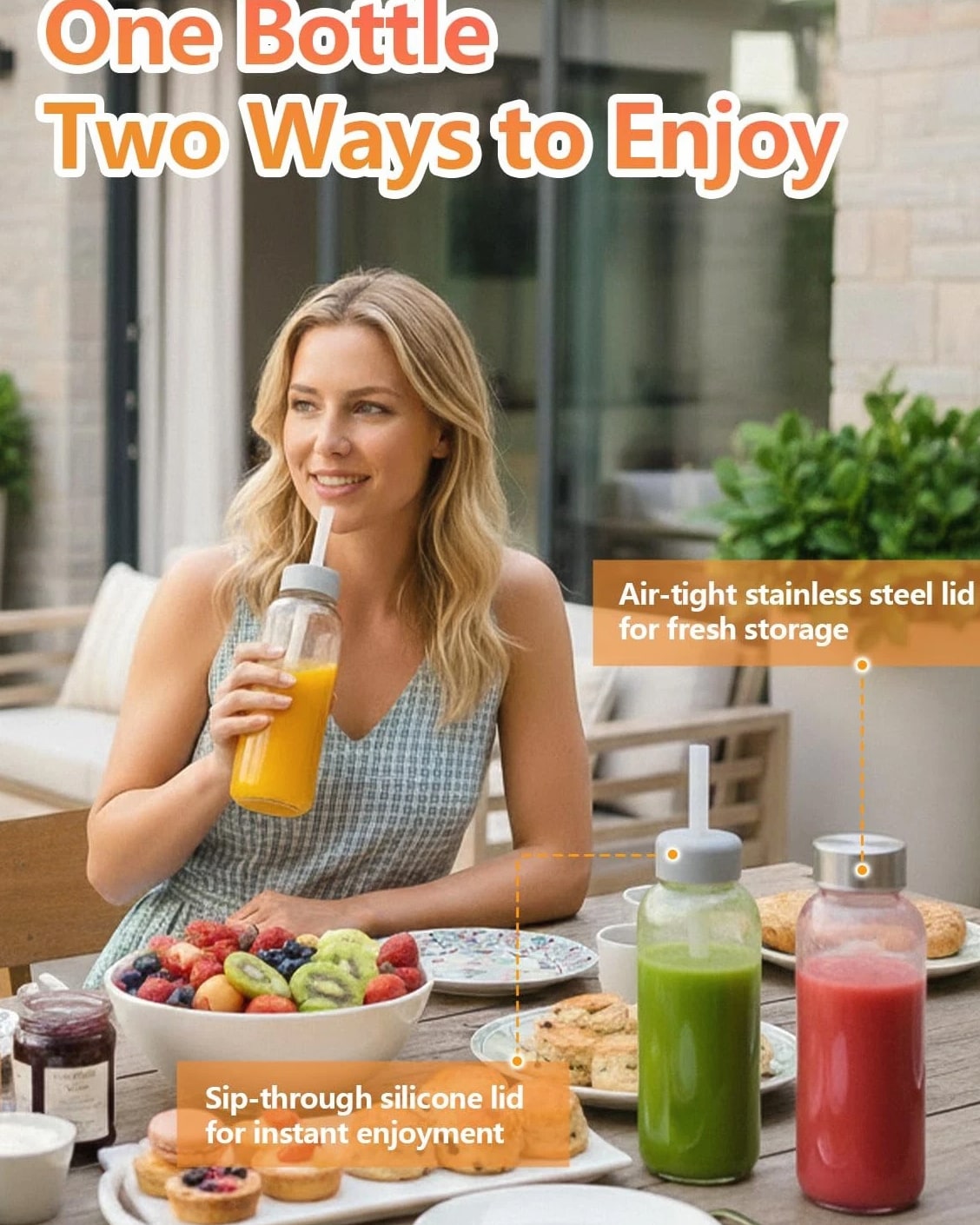 Elevate your hydration with 16 oz glass water bottles featuring Lids — the perfect blend of function, durability, safety, and sleek style. This 8-pack of glass juicing bottles is crafted from premium thick soda-lime glass, known for its durability and crystal clarity. Whether you are storing fresh juice, mixing nutrient-packed smoothies, or creating flavorful infused water, these bottles make every sip pure and refreshing. Each bottle features a regular mouth for easy filling and cleaning — ideal for busy mornings or prepping ahead. The leak-proof airtight stainless steel lids ensure a secure seal, keeping your beverages fresh and your bag or fridge dry. Compact in size, these beverage containers are fridge-friendly and portable for work, gym, or on-the-go use. Designed for the health-conscious and eco-minded, they are BPA-free, reusable, and safe for cold beverages. Say goodbye to plastic and hello to an elegant, sustainable solution for a clean, pure drinking experience. DURABILITY & REUSABLE & HEALTHY QUALITY: 16 oz juicing bottles are made from premium quality food-safe thick glass with superior chemical and impact resistance, which is BPA and Lead free. These reusable glass bottles with lids are a sustainable choice for enjoying your favorite juices and supporting a healthier planet. The juicing bottles reusable glass are designed to be super tough and withstand a long time of use. Say goodbye to disposable cups and contribute to a greener environment. GLASS BOTTLES WITH STRAWS FOR JUICING, WATER AND MORE: Durable stainless steel lids with air and water-tight seals, it's completely airtight to keep your beverage fresh without any worry of spills and oxygen can't get in to break down the enzymes and ruin your juices. Toss this glass water bottle in your bag or car and get a healthy start to your day with a juice, smoothie, milk, protein shakes, ice tea, milkshakes. This 100% leak-proof glass bottle will never leave a leaky mess. STAY HYDRATED WHEREVER YOU GO: The slim design fits easily in bags and cup holders.