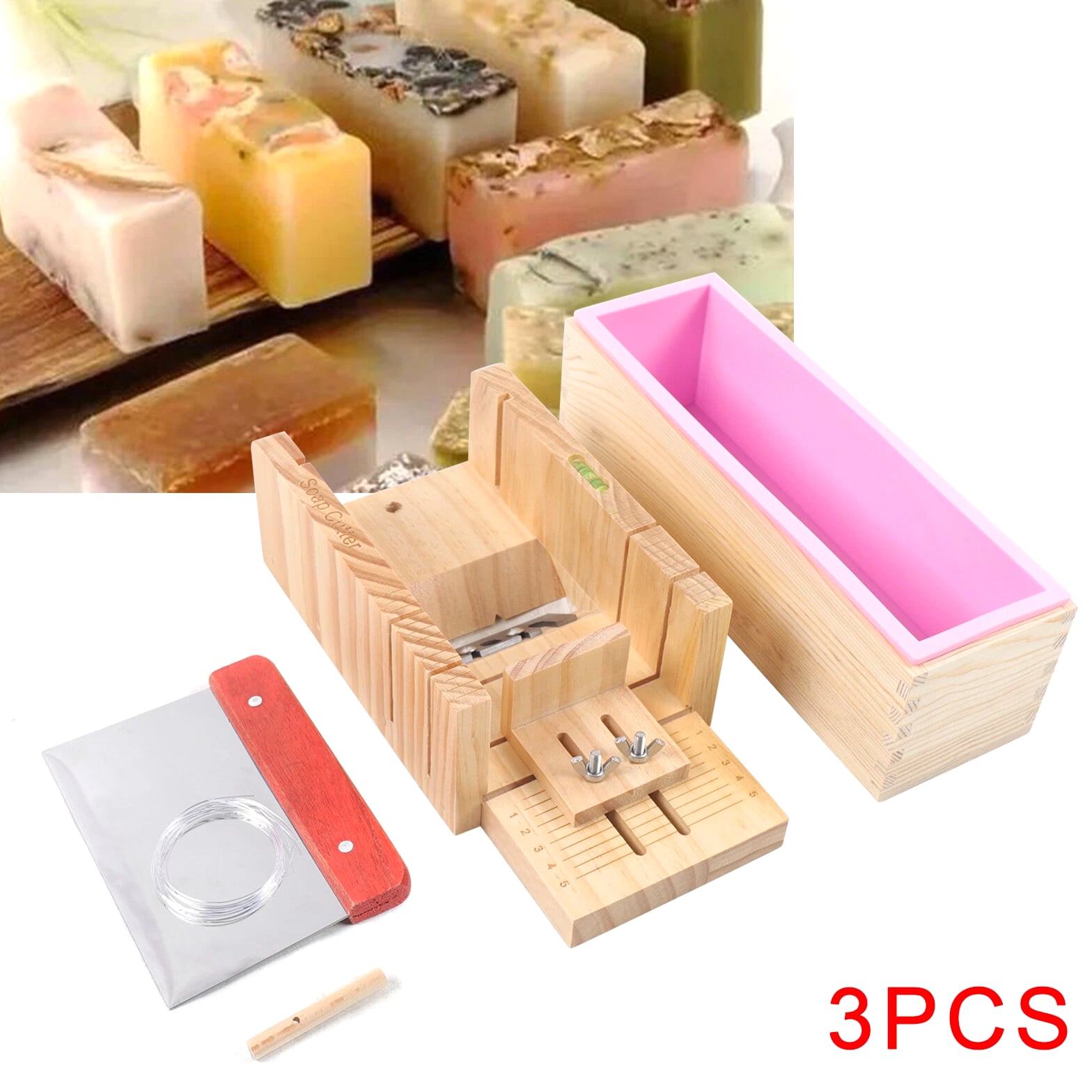 Pro Soap Making Supplies Kit 3 Pcs Set Soap Tools Cakes Mold Handmade DIY The Description of product: 3 Pcs Soap Making Tool Kit Loaf Soap Mould Adjustable Wooden Soap Cutter Slicer Gift Description: Name: Soap cutter set Style: modern and simple Process: grinding, polishing Specification: 3 Pcs set Material: wood+silicone+stainless steel Product Size: Wooden mold box: 9.6"*2"*2.8" Wooden Soap cutter Mold: 10.8"*3.5"*5" Straight knife: 5.9"*4.3" Function: used to make handmade soap, candles, cakes, etc. Applicable occasions: holidays, weddings, birthdays, full moons, travel commemorations, graduations, parties, etc. Features: 1. Multifunctional: suitable for cutting soap and candles 2. The surface of the accessories is smooth and easy to clean 3. Adjustable thickness: clear scale reading, you can adjust the thickness of soap, easy to observe during operation, easy to get the correct soap size you need. 4. High quality and easy to clean: made of exquisite solid wood and food grade stainless steel, safe high temperature resistance, corrosion resistance, long service life Tips: When you start to make soap, put the silicone mold into the wood box. Then pour liquid soap into the silicone mold. After the liquid soap hardens, take out the silicone mold and remove the soap. Wire cutter should be used when the soap is still a bit soft. Packing list: 1*Wooden box with silicone container 1*Wooden Soap cutter Mold 1*Straight knife Packing size: 29*17*13cm/11.4"*2.7"*5.2" Package weight: 1.35kg/3lb