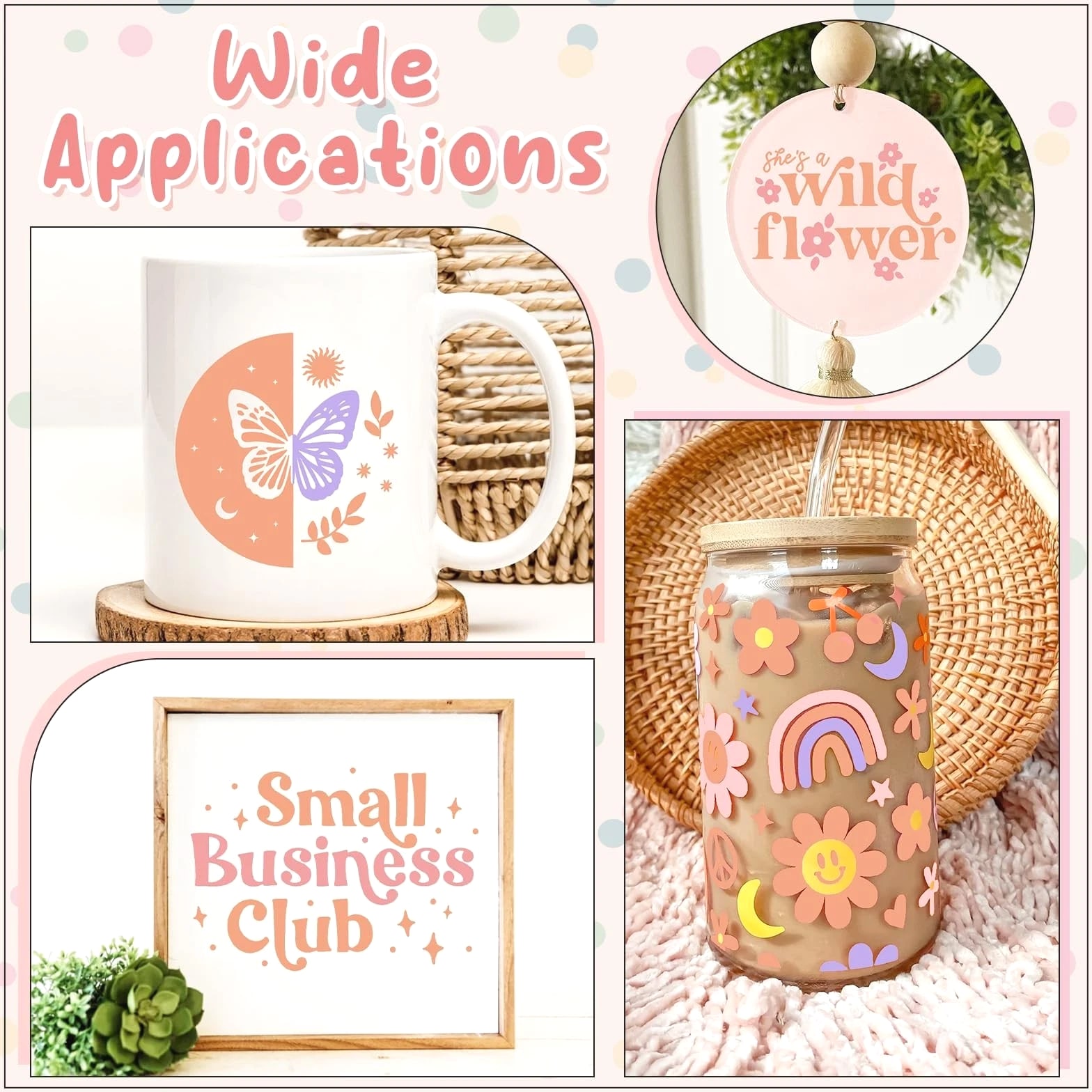 Boho Permanent Vinyl - 8 Sheets 12"x10" Peachy Pink Permanent Adhesive Vinyl for Cutting Machine, Home Decor Self Sticker Product Details Color: Peachy Pink-8 Brand: Tintnut MPN: 357951 UPC: Does not apply EAN: Does not apply Item dimensions L x W x H: 12 x 10 x 0.01 inches Surface Recommendation: Tile Recommended Uses For Product: Car Material: Vinyl Theme: Cartoon Cartoon Character: Peachy Pink Special Feature: Permanent Number of Pieces: 8 Product Style: Bohemian Item Form: Sheet Pattern: Variety Pack Shape: Rectangular Indoor Outdoor Usage: Outdoor Additional Features: Permanent Reusability: Single Use Material Type: Vinyl Finish Type: Sheer Unit Count: 1.0 Count Number of Items: 1 Brand Name: Tintnut Manufacturer Part Number: 357951 Model Number: 357951 Age Range Description: Adult Multiple Choice & Convenient Apply: This solid permanent adhesive vinyl includes 8 sheets for cutting machine and craft cutter. We also enclosed 5 sheets transfer tape to satisfy your needs during your DIY creations. Working Easy on Cut, Weed & Transfer: This adhesive vinyl works easily on cutting, weeding and transferring your designs. Makes it easier to do it yourself. Multiple Application: This permanent vinyl can be used to DIY your own design of indoor and outdoor decorations for decor sticker, party decoration, car decal. It has good stickiness to glass, wood, plastic, metal and walls. It can also be a gift to your friends interested in DIY creations. Water Proofing and Long-Lasting: This Self Permanent Adhesive Vinyl has High Elasticity and Strengthened Stereoscopic Vision Compared to Normal Material, and Waterproof Surface. It is Wash Durable and has Color Fastness. Customer Service: If you have any doubts or problems encountered with your adhesive vinyl