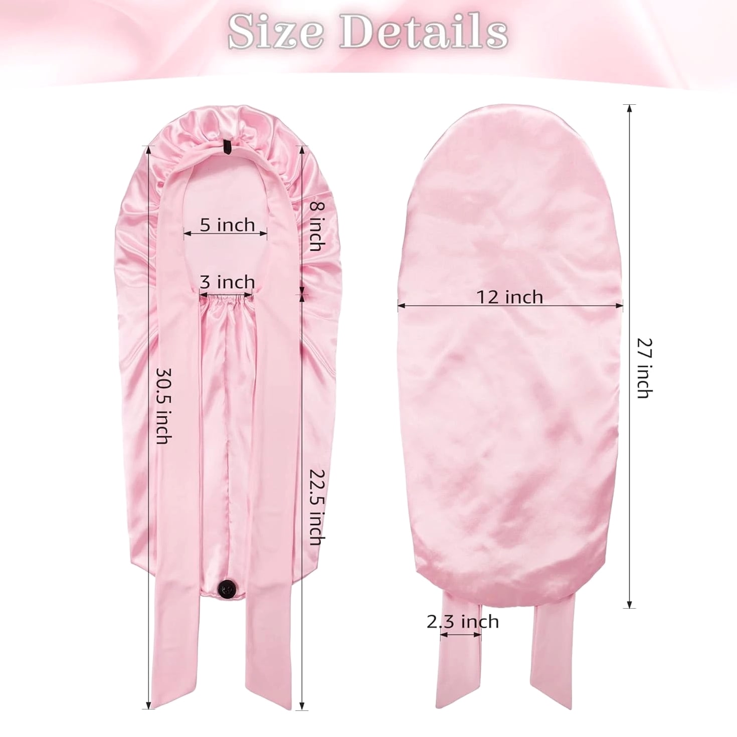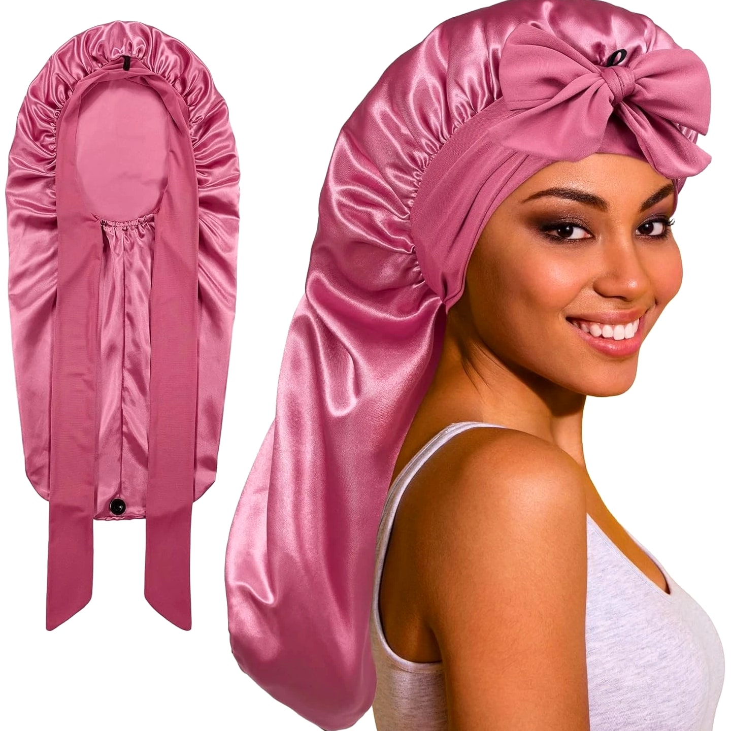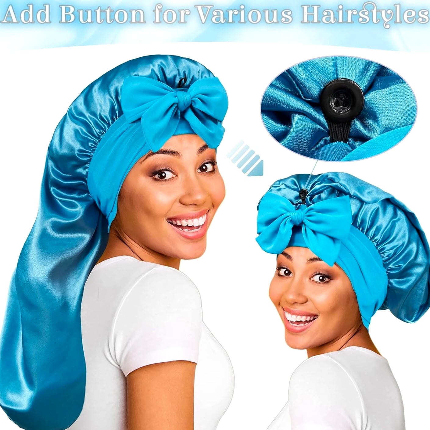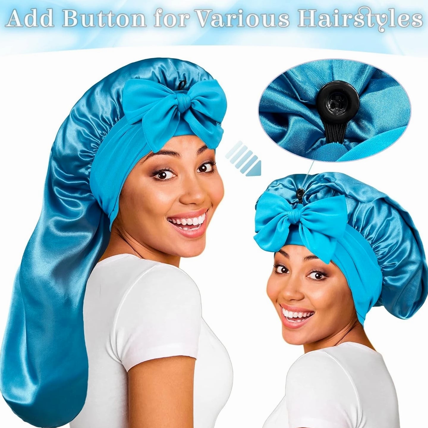 Silk Bonnet with Tie Band: The long satin bonnet features a stretchy long band, you can wrap it on your head, adjust tightness and make a bow on forehead or both sides. If you are a man you can directly wrap on back. It can stay on overnight, prevent hair from getting messy and protect your hair well, is one of the most ideal sleeping hair caps. Extra Long Satin Bonnet: This sleep cap is long enough so you can tuck plenty of long thick hair into it, to hold various braids or long hair, dreadlocks, crochet braid, dread, locs, box braid, faux crochet hair, weaves, wig, etc. Add button holds the heavy hair up for a more comfortable feel without being excessively large. Quality Material: The bonnet part is made of good texture imitative silk, skin-friendly, soft, breathable and smooth, well protects hair from breaking and getting messy, and keeps hair moisture too. Long band is made of stretchy spandex material, would not make you feel tight and leave imprint on head, and much more cozy. Widely Used: Long satin bonnet is not only suitable for sleeping, but also suitable for everyday wear. You can wear it when washing your face, skincare, makeup, bathing, doing sports, or even doing housework, making your life more convenient. Washing Instructions For Silk Satin Bonnet: A, Satin bonnet can be hand washed with cold water and gentle soaps. It should be laid out flat or hung to dry. B, After you receive the sleep cap, wash it with cold water before wearing and it will not fade.
