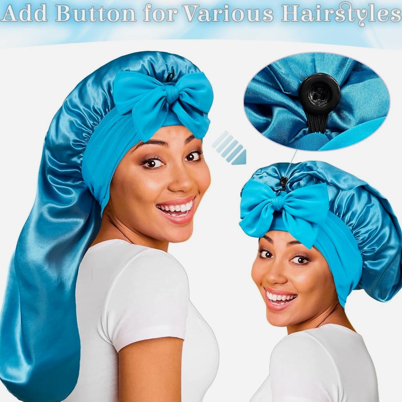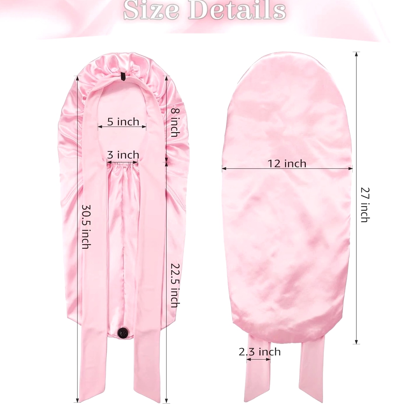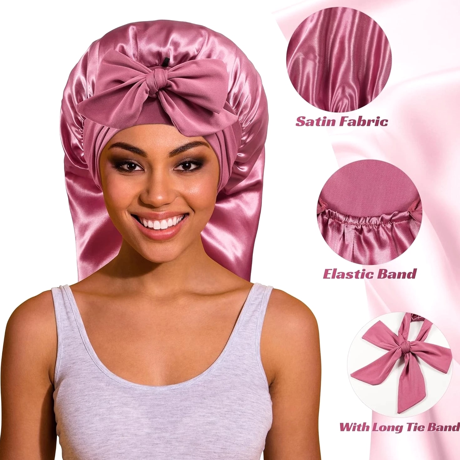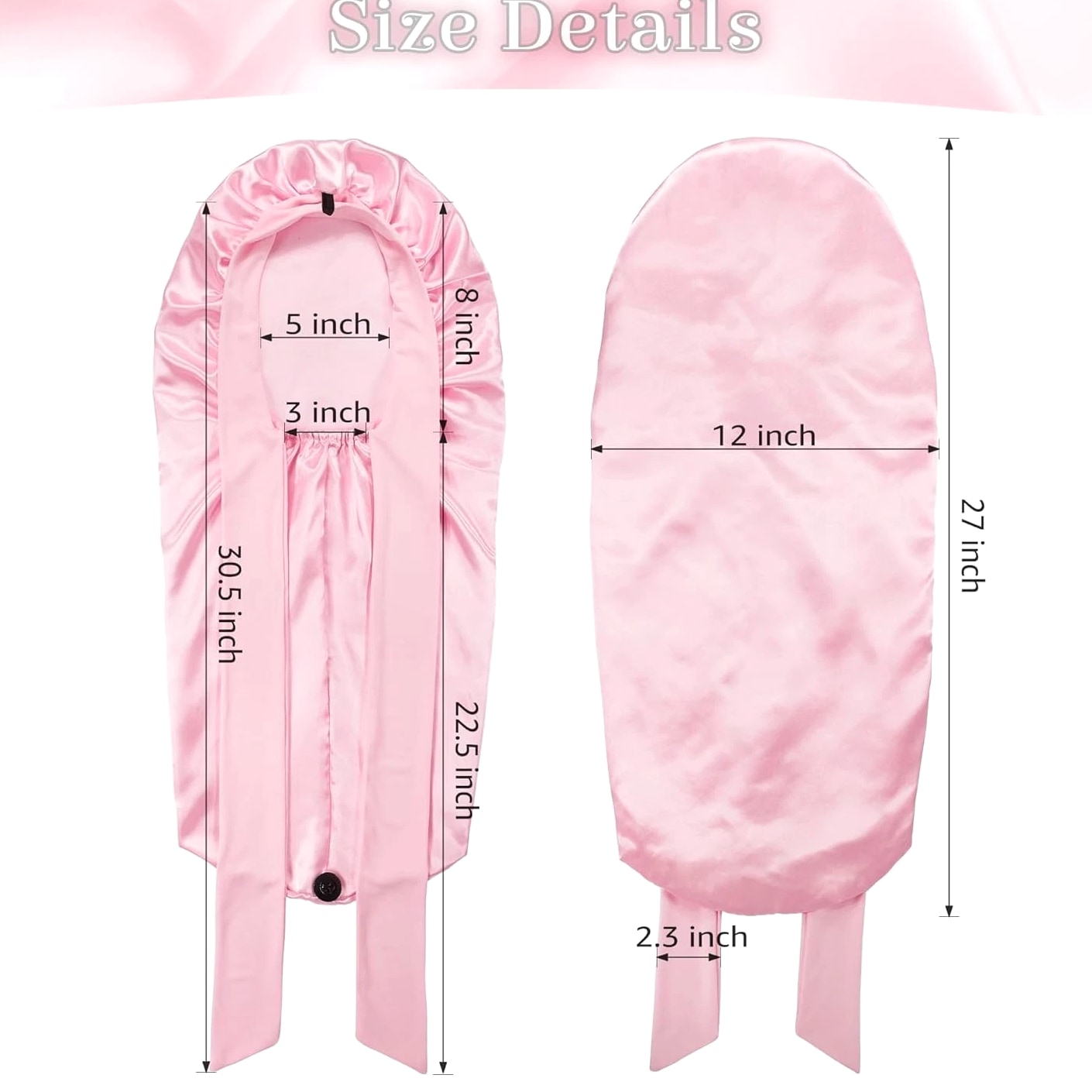 Silk Bonnet with Tie Band: The long satin bonnet features a stretchy long band, you can wrap it on your head, adjust tightness and make a bow on forehead or both sides. If you are a man you can directly wrap on back. It can stay on overnight, prevent hair from getting messy and protect your hair well, is one of the most ideal sleeping hair caps. Extra Long Satin Bonnet: This sleep cap is long enough so you can tuck plenty of long thick hair into it, to hold various braids or long hair, dreadlocks, crochet braid, dread, locs, box braid, faux crochet hair, weaves, wig, etc. Add button holds the heavy hair up for a more comfortable feel without being excessively large. Quality Material: The bonnet part is made of good texture imitative silk, skin-friendly, soft, breathable and smooth, well protects hair from breaking and getting messy, and keeps hair moisture too. Long band is made of stretchy spandex material, would not make you feel tight and leave imprint on head, and much more cozy. Widely Used: Long satin bonnet is not only suitable for sleeping, but also suitable for everyday wear. You can wear it when washing your face, skincare, makeup, bathing, doing sports, or even doing housework, making your life more convenient. Washing Instructions For Silk Satin Bonnet: A, Satin bonnet can be hand washed with cold water and gentle soaps. It should be laid out flat or hung to dry. B, After you receive the sleep cap, wash it with cold water before wearing and it will not fade.