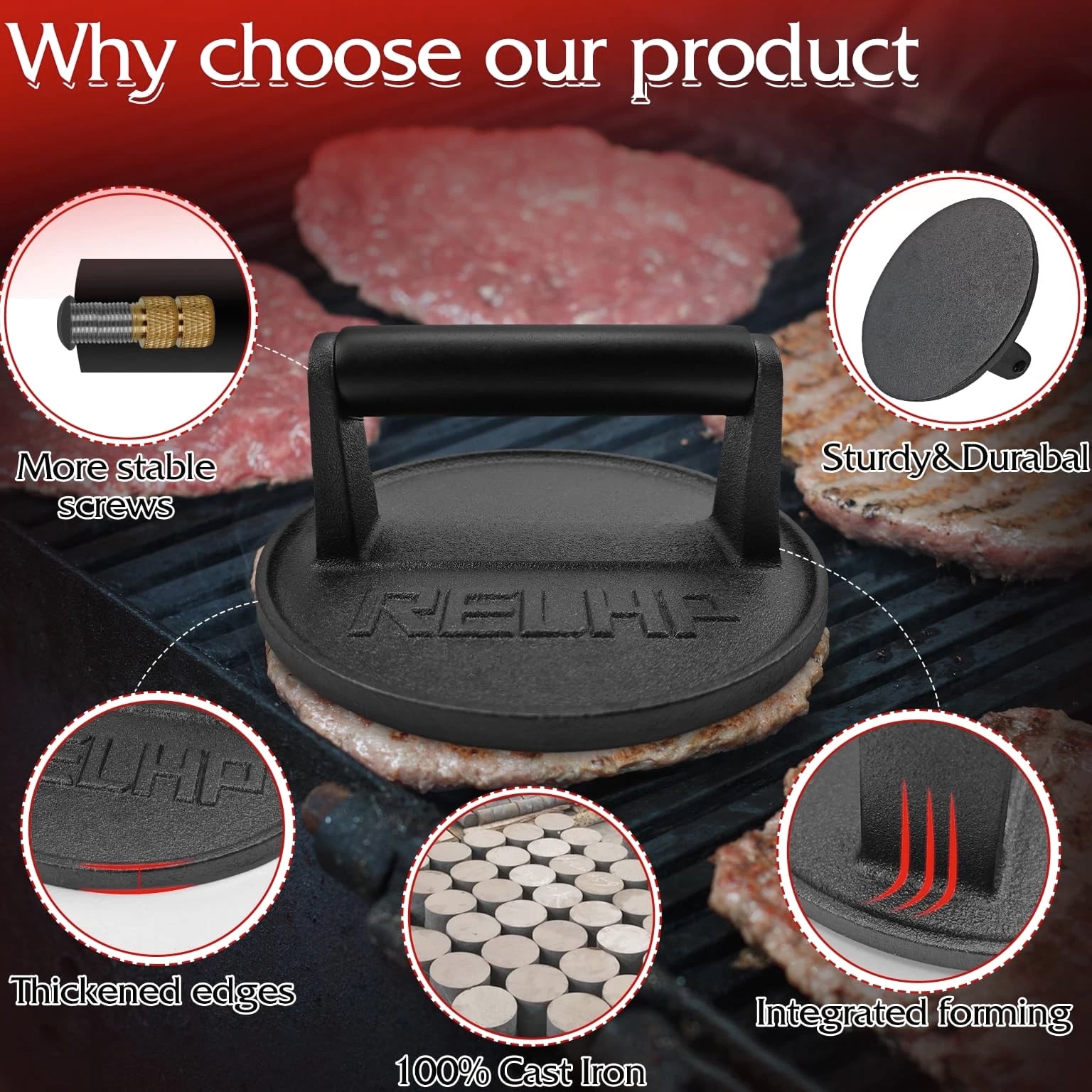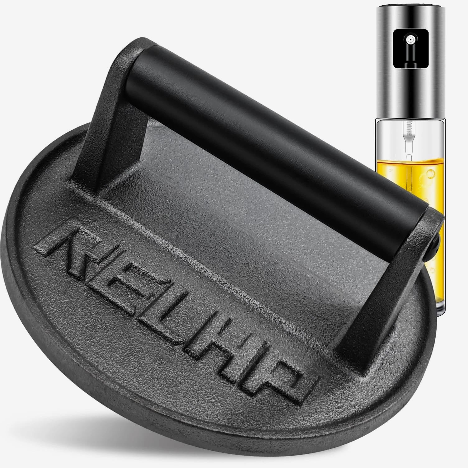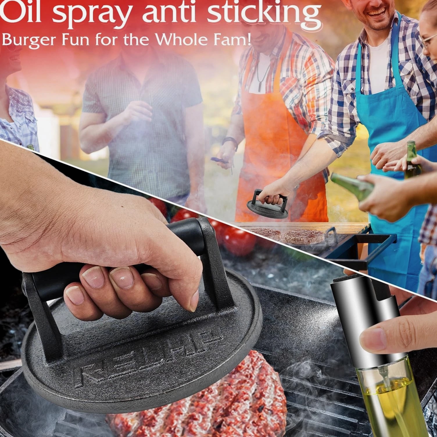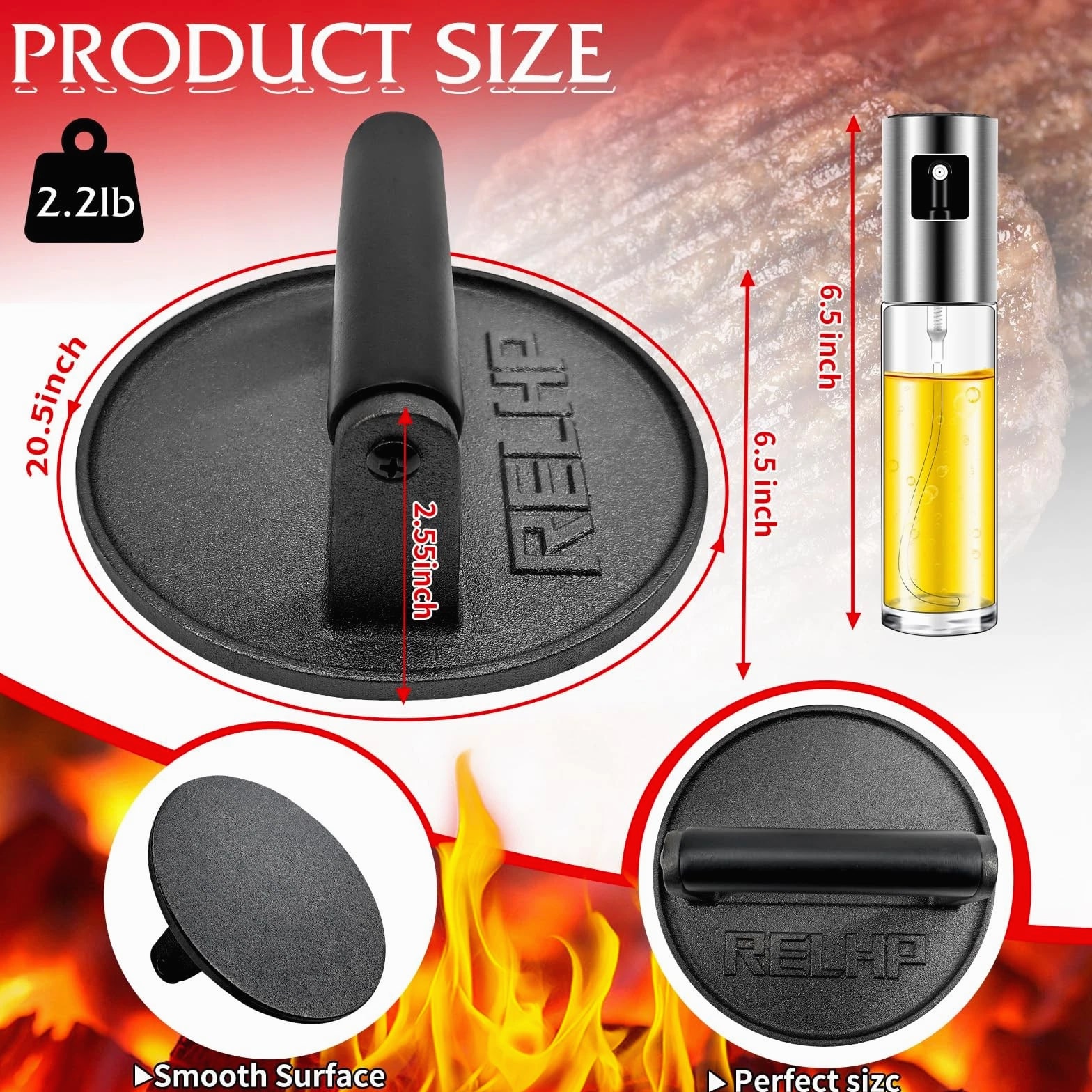 The Cast Iron Skillet features a smooth surface for easy cleaning, a simple yet practical design, and a high-quality spray bottle. Its 6.2-inch size is perfect for making delicious hamburgers. The press is made of durable and thick cast iron, and the heat-resistant handle provides a comfortable grip, ensuring stability and user comfort even when handling various types of meat. The non-slip feature further enhances its usability, making it an indispensable multi-functional tool in the kitchen. For hamburger lovers, this product is a must-have. [Enhanced Quality Meat Press Board]: The foundation of this cast iron meat press is constructed from thickened, food-grade cast iron, complemented by a handle crafted from premium wood. This construction not only ensures structural stability but also provides a comfortable grip. The design is aimed at enhancing user experience by offering a more comfortable and enjoyable grilling process. [Optimal Dimensions]: Meat Press Tool is meticulously engineered to provide uniform pressure across its entire surface. This hamburger smasher makes it easy for both professional chefs and burger enthusiasts to create delicious and high-quality burgers. [High-Atomization Spray Bottle]: This hamburger smasher tool set comprises a high-quality spray bottle and a griddle press. The spray bottle is designed to be used prior to grilling to prevent burgers from adhering to the grill or frying pan. Additionally, it is versatile enough to be utilized in cooking other dishes. [High-Quality Meat Press Board]: The raw material for the cast iron press plate is food-grade cast iron and it is designed with a thicker structure. The high-quality wood handle is used for the anti-scalding part. Not only is the structure more stable, but the grip feel is also very comfortable. This design is intended to add fun to the grilling process while ensuring that users enjoy a comfortable use experience. [The Ideal Gift for a Grilling Enthusiast] An excellent choice for anyone who loves grilling.