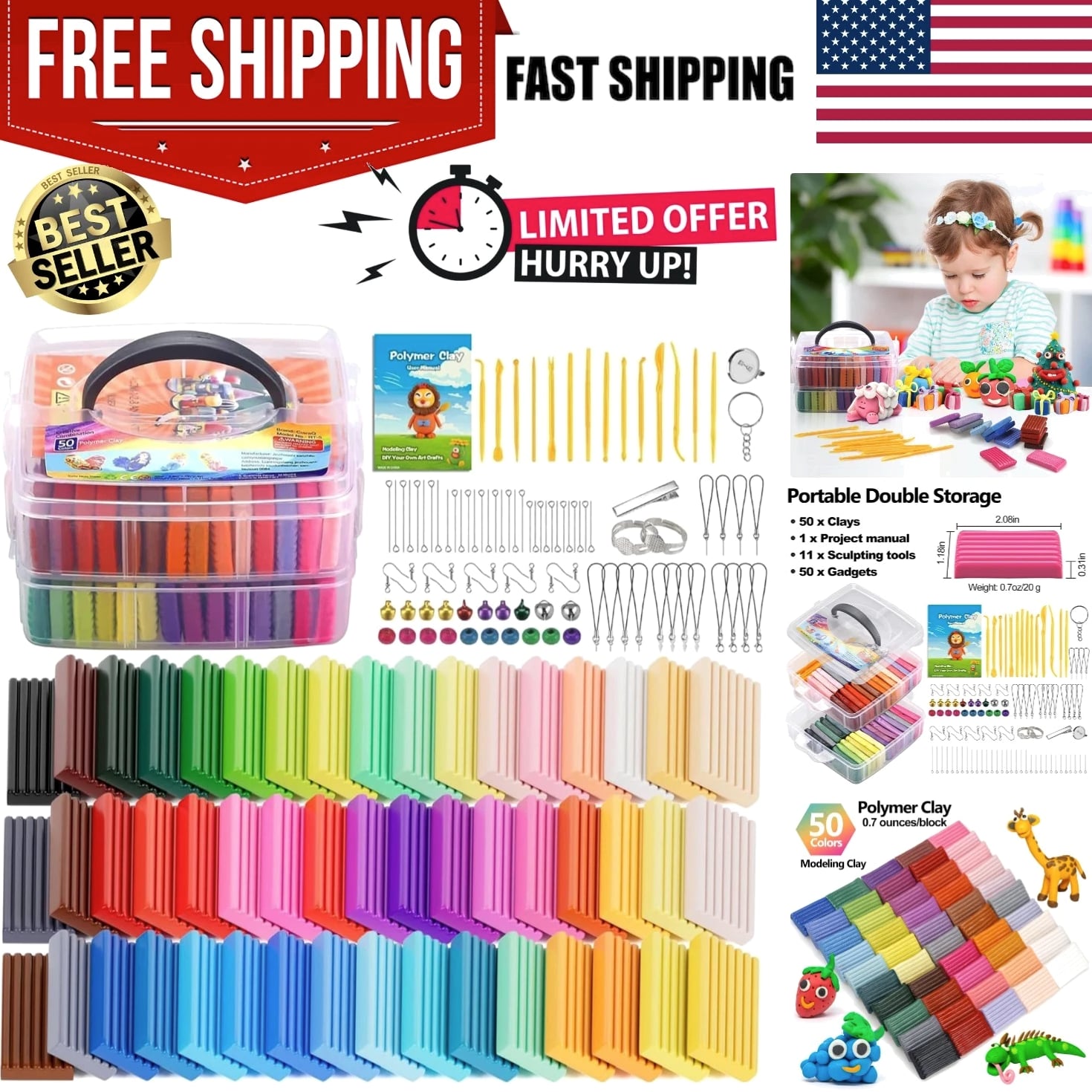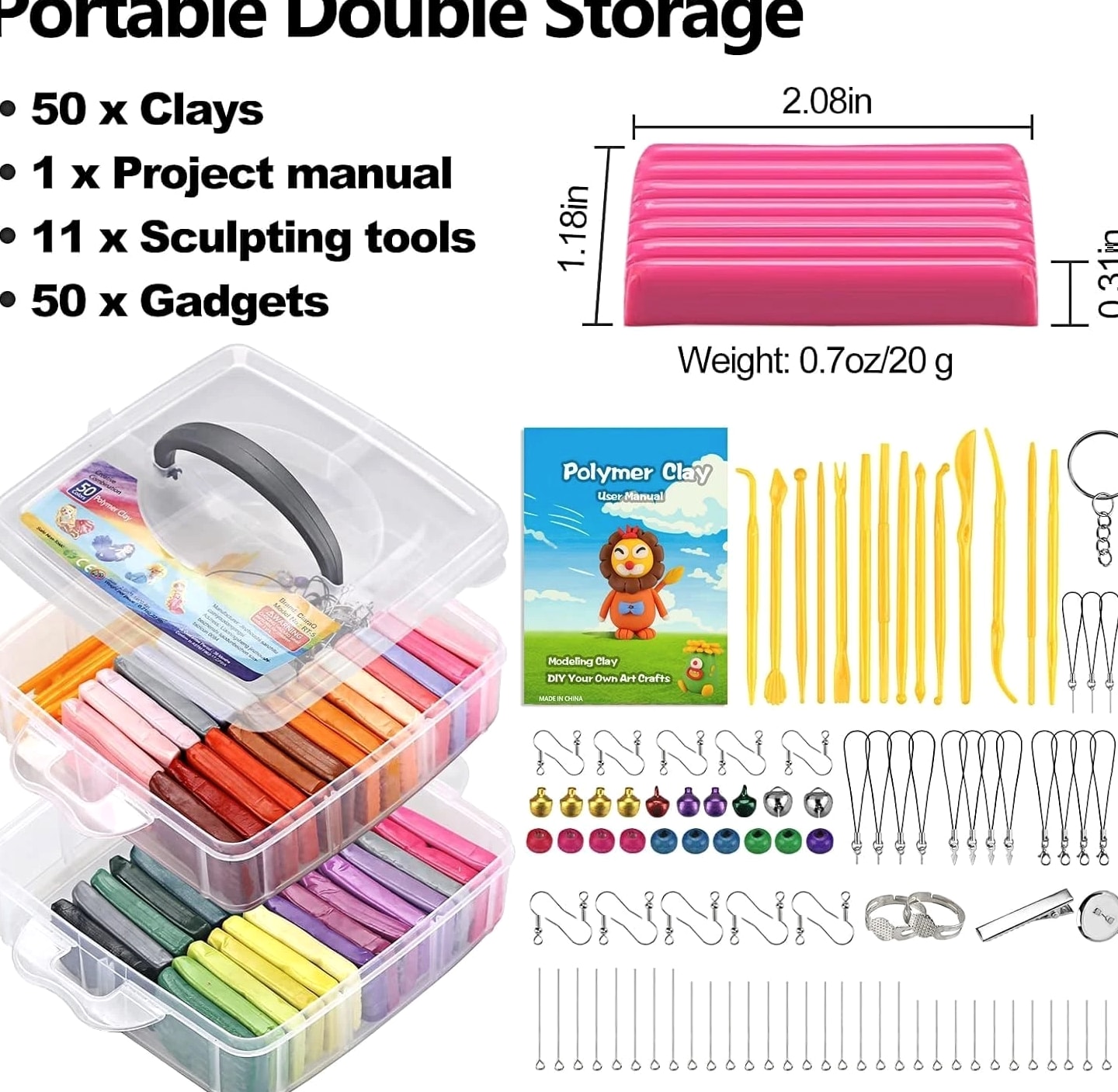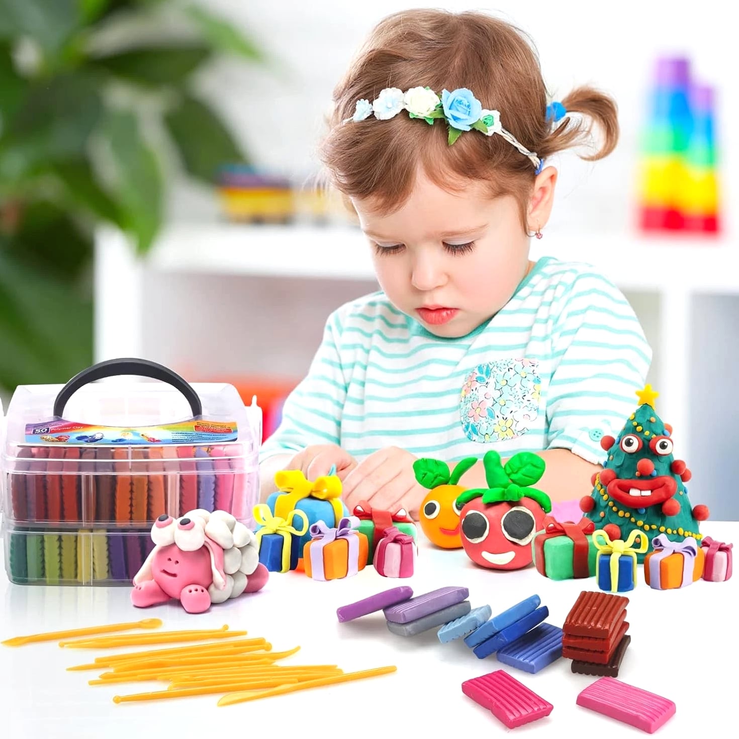 Creative Polymer Clay Starter Set - 50 Colors for Kids Age 4+ Craft Kit Creative Polymer Clay Starter Set 50 Colors for Kids Age 4+ - A Fun and Engaging Experience! What's Included: One plastic storage box 50 vibrant colors of polymer clay Creative modeling tools and accessories Project booklet for inspiration Weighs 2.8 pounds for easy handling Quality You Can Trust: Non-toxic and safe for kids Environmentally friendly and allergen-free Complies with ASTM D-4236 standards Endless Creativity Awaits: Non-hardening modeling clay: never hardens, easily reusable, and blendable for endless possibilities. Individually wrapped packs ensure your little ones can dive right into their creations. Perfect for children and beginners to craft small ornaments, model animals, characters, and more! Molding Methods: Recommended to use an oven to bake for ideal results. Hair dryer for small workpieces (1-2 inches). Boiling method not effective; please refer to included instructions for best practices. Why Choose Our Creative Polymer Clay Set? Designed for ages 4 and up, our Creative Polymer Clay Starter Set is the ultimate tool to spark creativity and keep kids engaged in imaginative play. With 50 dazzling colors and everything needed to create beautiful designs, this set promises fun and learning in every project. Your child's creativity deserves the best! Impress them with a crafting experience that is not only fun but also safe and educational. Order the Creative Polymer Clay Starter Set today and watch their artistic skills flourish!