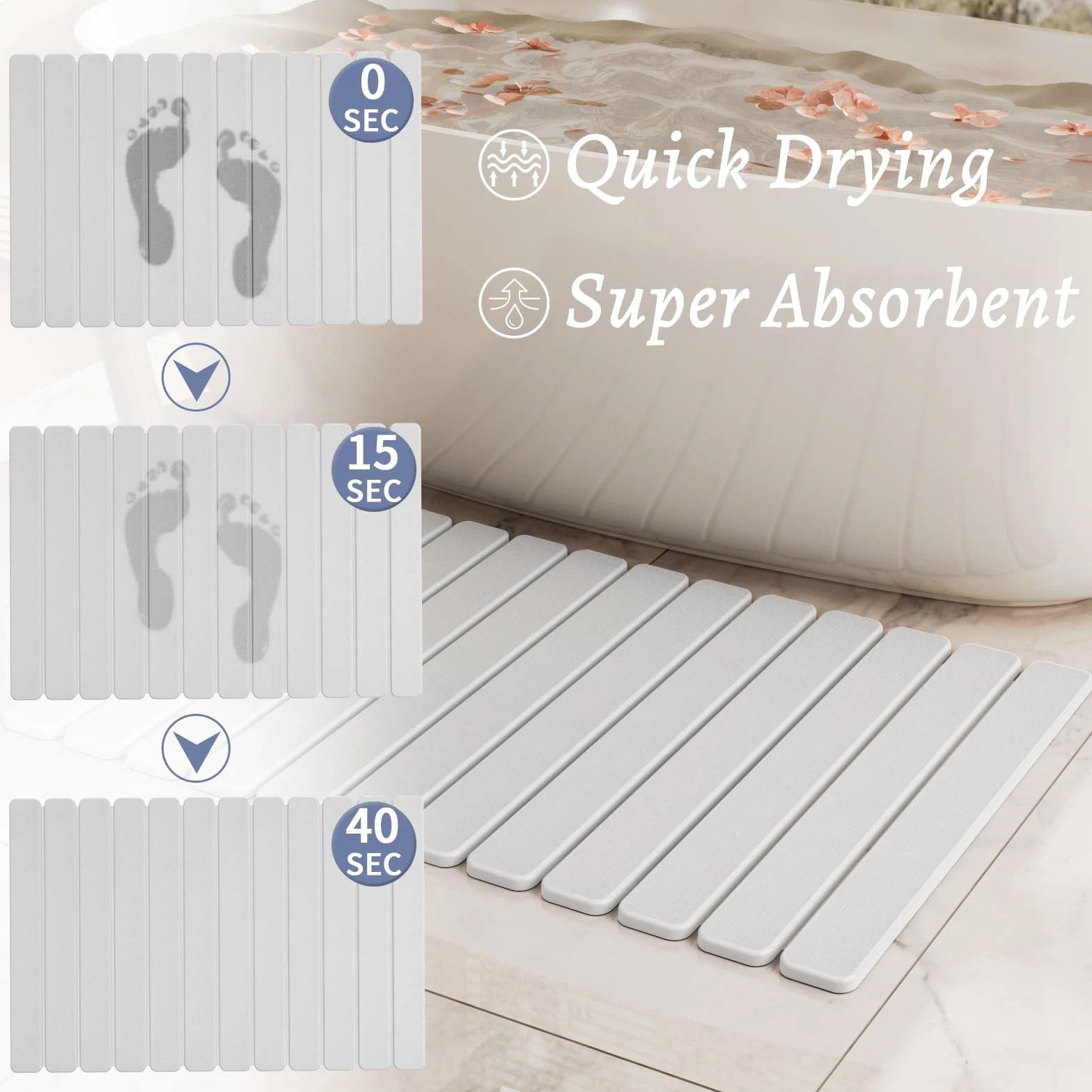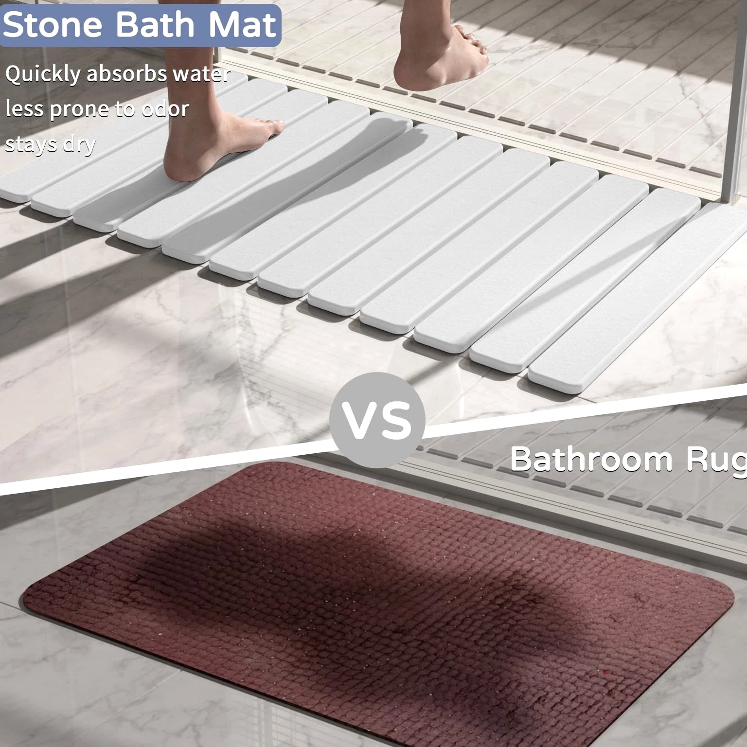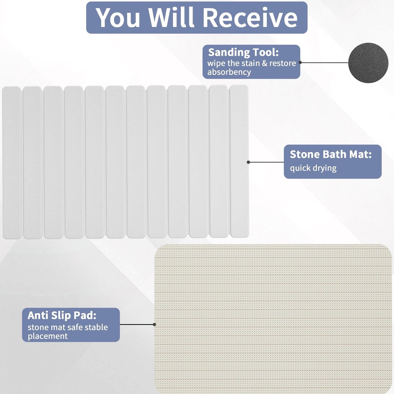 Stone Bath Mat Super Absorbent & Quick Drying: This bathroom stone mat absorbs moisture and allows it to evaporate quickly, keeping your feet clean and dry. Say goodbye to damp and unhygienic conditions in the bathroom! Foldable Design: It measures 31.5 x 19.7in. Note: It ships folded and will need to be opened upon arrival. When not in use, it can be rolled up and stored to save space. It can also be used as a large stone dish drying mat for kitchen counter, plant mat, entryway mat, pet bowl mat, and poolside mats. Anti-Slip Design: The surface texture of the diatomite stone bath mat increases friction; a full PVC anti-slip backing is attached to the back and includes an extra non-slip mat. Please place the non-slip mat under the bathroom mat and keep the floor dry to ensure the stone bath mat grips the floor securely. Easy to Clean: After a period of time, if the surface shows water stains or light marks, you can rinse with water or wipe with a damp paper towel, then dry in a ventilated place. For stubborn stains, lightly sand with sandpaper. Note: Please do not spill dark drinks such as coffee or red wine on the stone mat to avoid leaving traces. The package includes a sheet of sandpaper for removing stubborn stains.