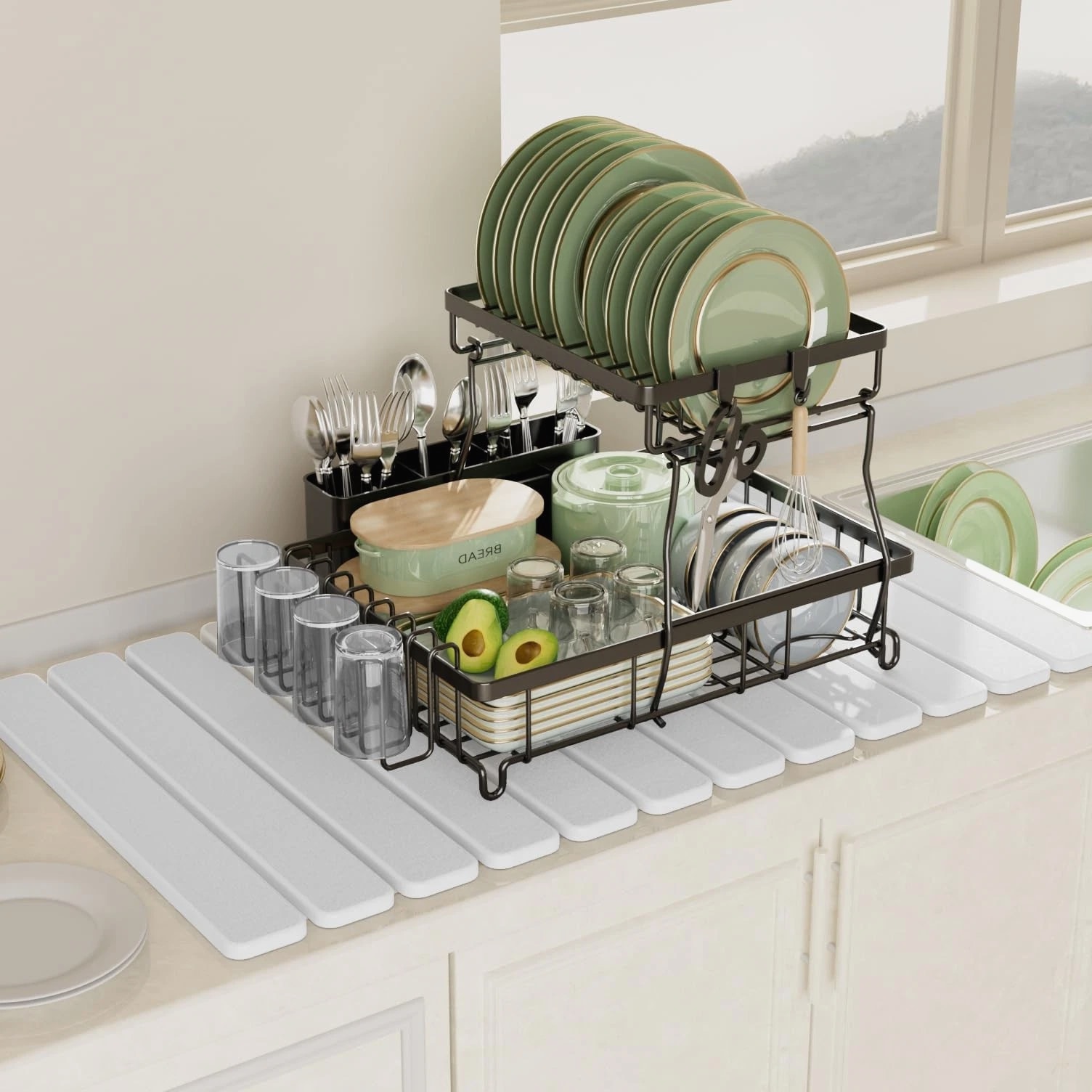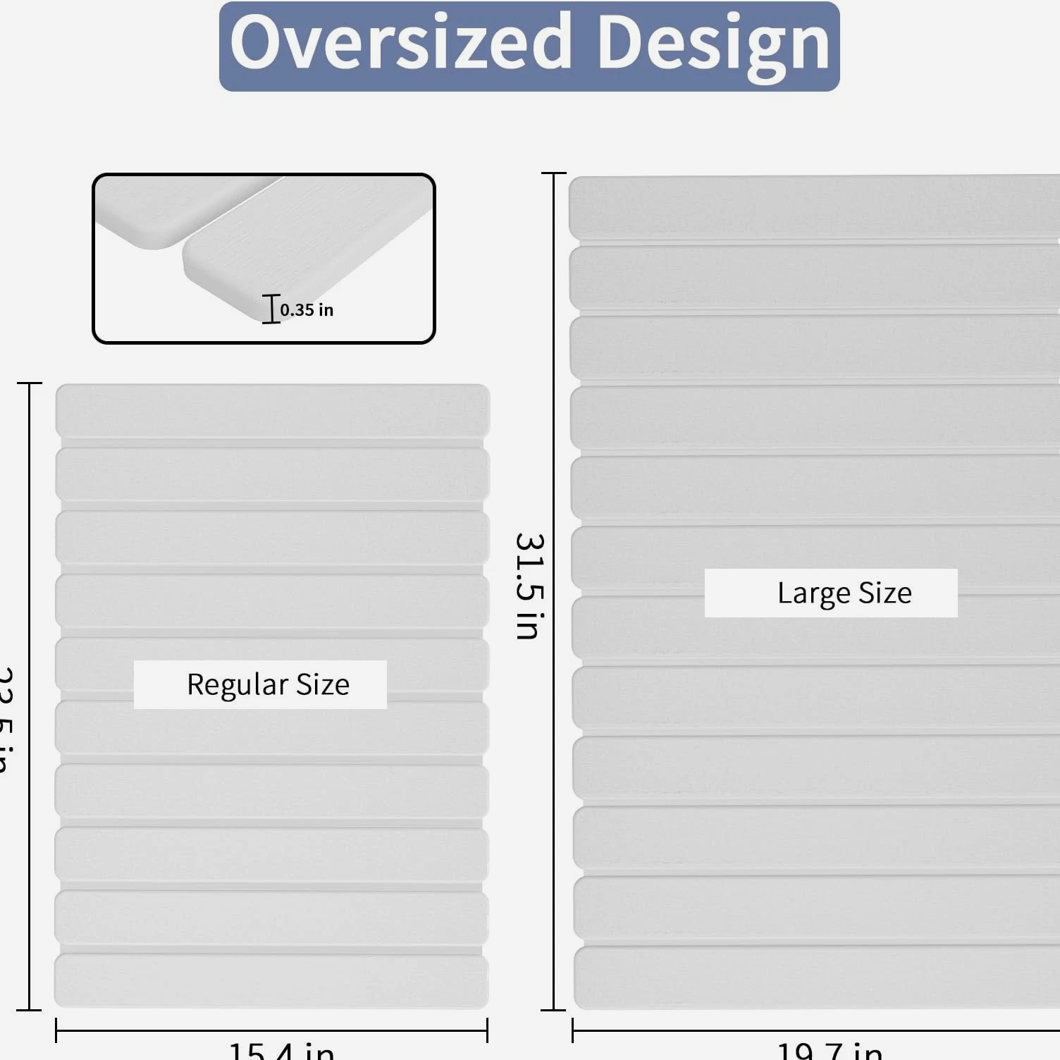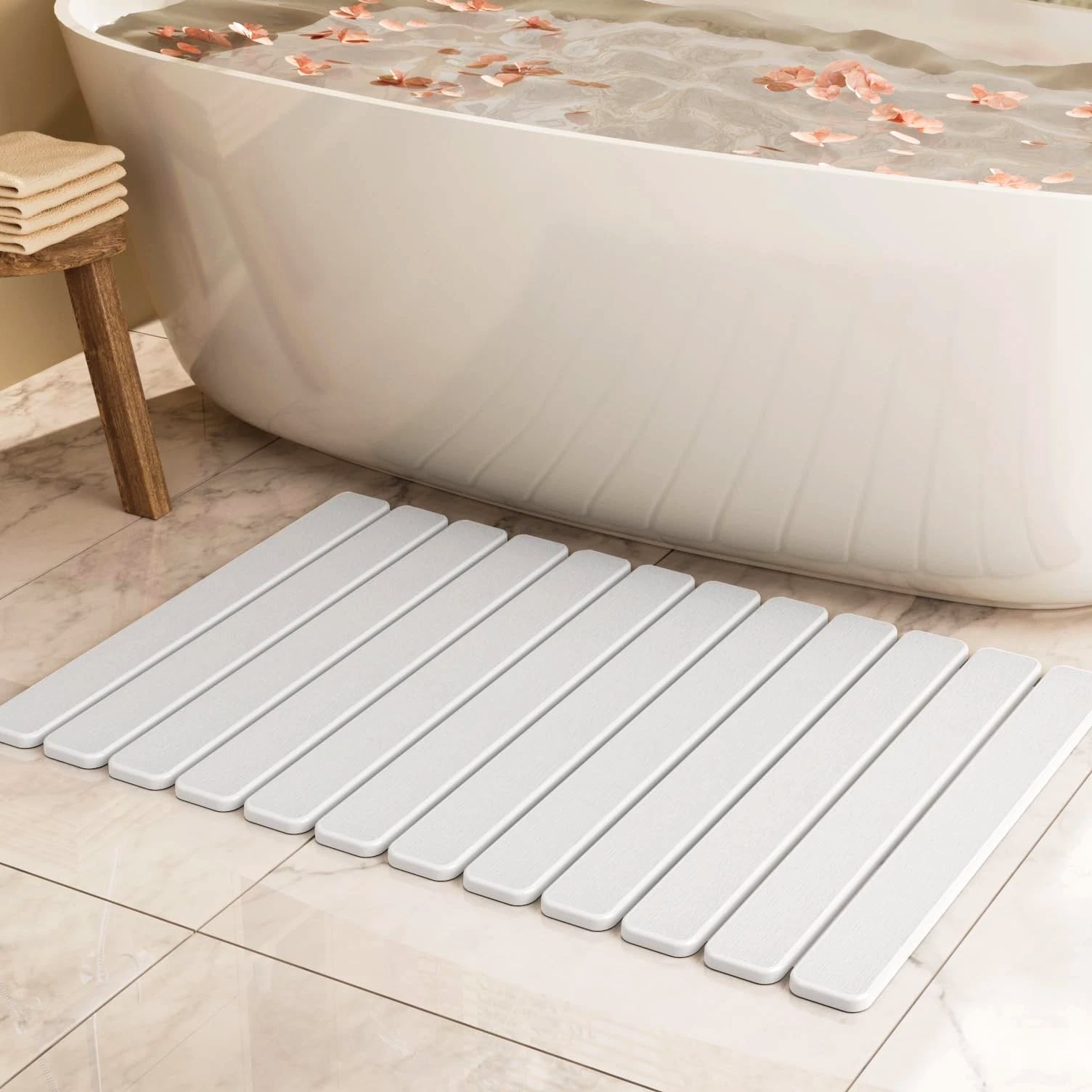 Stone Bath Mat Super Absorbent & Quick Drying: This bathroom stone mat absorbs moisture and allows it to evaporate quickly, keeping your feet clean and dry. Say goodbye to damp and unhygienic conditions in the bathroom! Foldable Design: It measures 31.5 x 19.7in. Note: It ships folded and will need to be opened upon arrival. When not in use, it can be rolled up and stored to save space. It can also be used as a large stone dish drying mat for kitchen counter, plant mat, entryway mat, pet bowl mat, and poolside mats. Anti-Slip Design: The surface texture of the diatomite stone bath mat increases friction; a full PVC anti-slip backing is attached to the back and includes an extra non-slip mat. Please place the non-slip mat under the bathroom mat and keep the floor dry to ensure the stone bath mat grips the floor securely. Easy to Clean: After a period of time, if the surface shows water stains or light marks, you can rinse with water or wipe with a damp paper towel, then dry in a ventilated place. For stubborn stains, lightly sand with sandpaper. Note: Please do not spill dark drinks such as coffee or red wine on the stone mat to avoid leaving traces. The package includes a sheet of sandpaper for removing stubborn stains.