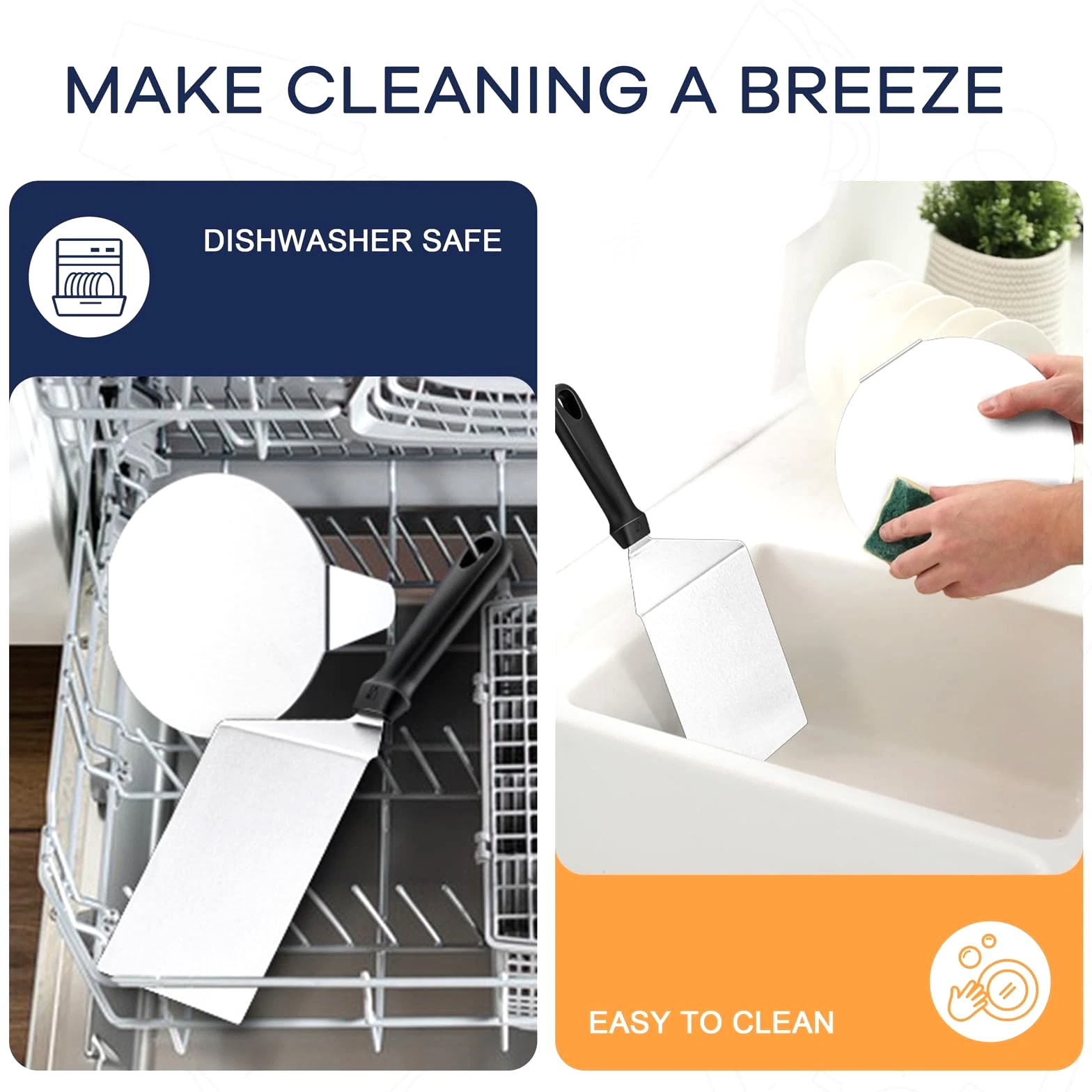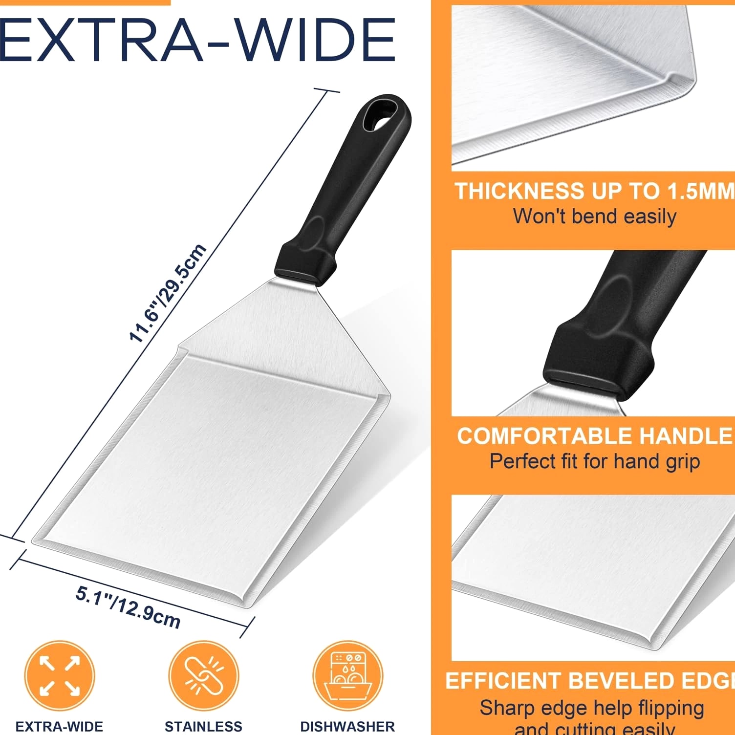 Stainless Steel Heavy Duty Hamburger Spatula & Smash Burger Press for Griddle Grill The metal burger turner and burger press are made of food-grade stainless steel, heavy duty and durable. With the extra large surface, the spatula can hold a full-size burger. Sturdy one-piece steel firmly connected with triple-rivet handle securely, not easy to loosen or crack. Fits as burger smasher, fish spatula turner, pancake spatula, bbq spatula, teppanyaki spatula, pizza spatula. Tired of unevenly cooked meat? Bacon press can help you push that squiggly meat like burger patties, bacons, steaks down into your griddle. Built in cast iron, it is both durable for long-term use and non-stick. No more hesitation for this simple but perfect bbq griddle set because it does save you a lot of cooking time, brings you more delicious foods and even a healthier diet with less grease and fat. Product Contents: 1 x Hamburger Spatula with Plastic Handle Commercial grade hamburger spatula and burger press are made of premium stainless steel, sturdy structure and high-quality components ensure stable performance, would not bend or crack, do not contain any harmful coating released in your foods, rust-proof and corrosion resistant, heat resistant and comfortable plastic handles are solidly installed Heavy duty - thickness of burger spatula blade is up to 1.5mm, strong enough to provide stable performance and durability, smooth comfortable plastic handle will not loosen or come apart to extend the service life Fantastic smash, burger turner has extra-wide surface to hold a full-size burger, no more worry about burgers falling to the ground, large enough for holding more food at once, fits as fish spatula turner, pancake spatula, bbq spatula, teppanyaki spatula, pizza spatula Stainless steel grill press, heavy duty metal bacon press helps to press out the unwanted grease, makes griddle or grill cooking much healthier, triangular structure ensures burger press durable enough for long term use, with non-s