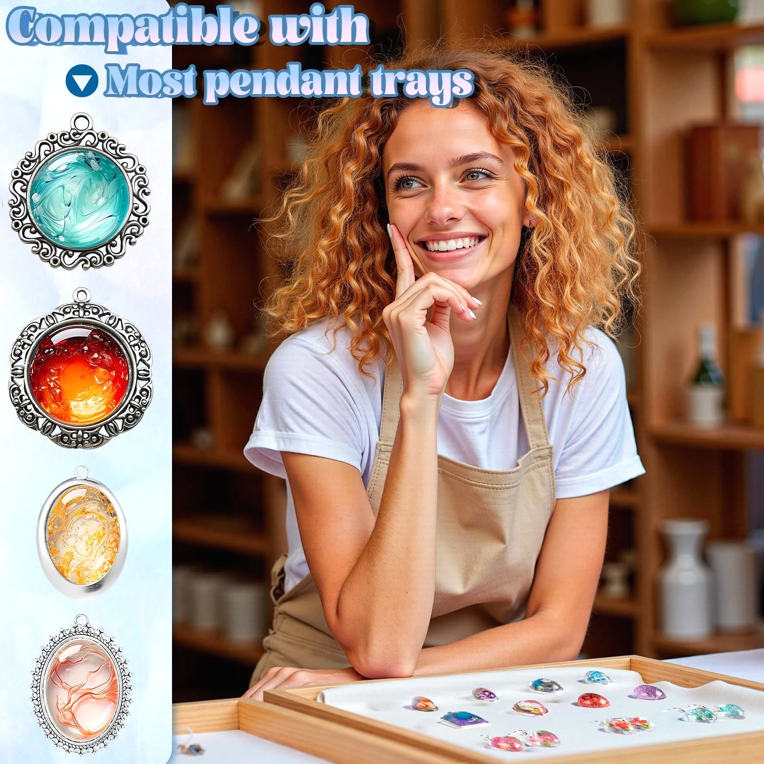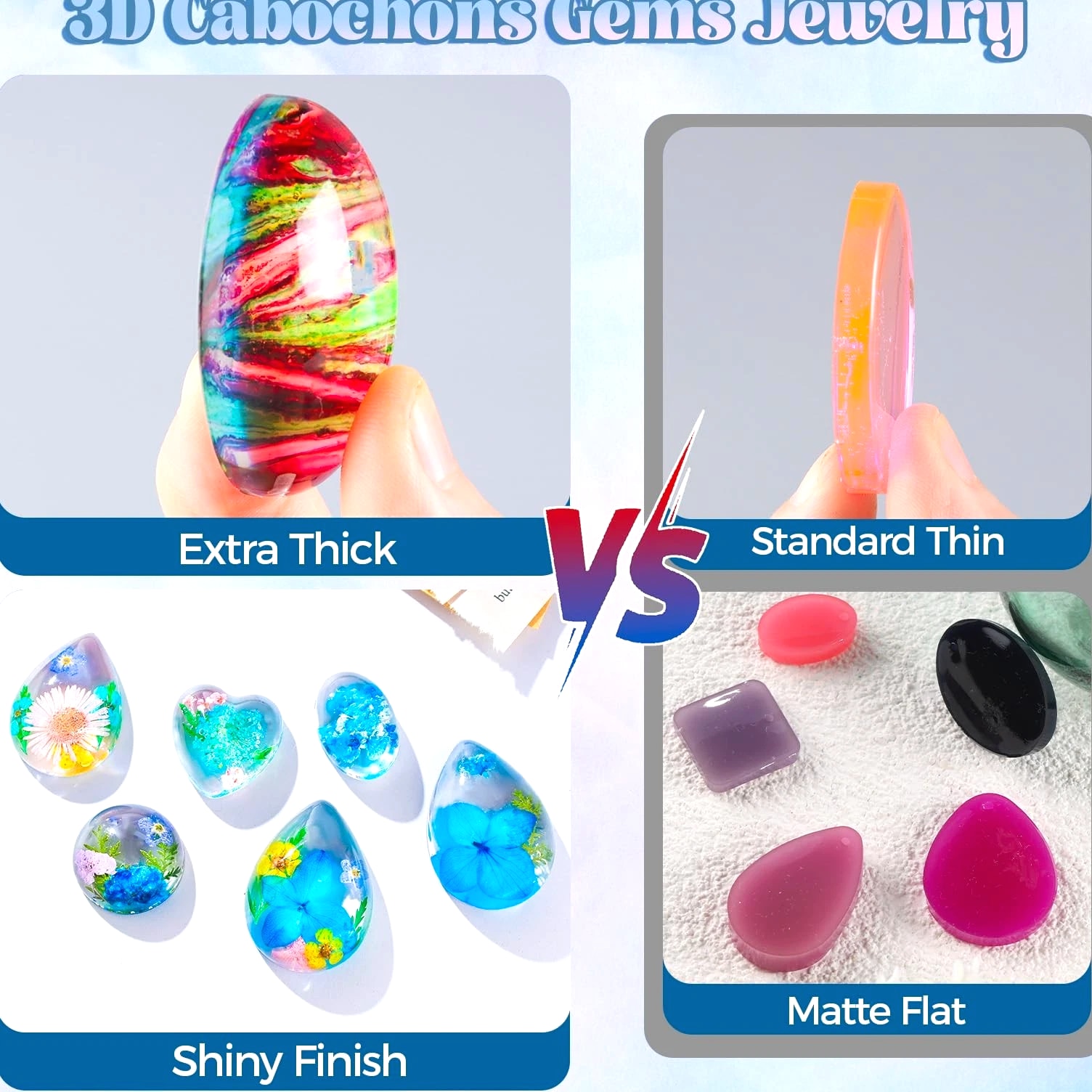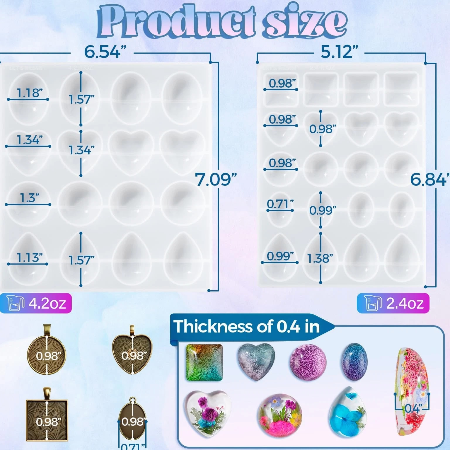 Cabochon Gems Resin Molds, 36 Cavities Thicker & Shiny UV Resin Molds Jewelry with 16 pcs Pendant Trays, Epoxy Molds for Beginner, jewelry making kits for Pendant, Earrings, Necklace, Keychains Multi-Shape & Size Cabochon Gems Resin Molds Kit: The epoxy resin molds include 2 pcs epoxy molds with 36 cavities. It is perfect for a variety of DIY uv resin molds projects. Note: The 16 pendant bases in the set fit only the small-size molds. Note: Only small-size molds come with a metal pendant tray. Thick & Glossy 3D Jewelry Finish: The silicone resin molds finished pieces are up to 0.4 inches thick, making them more solid and domed than standard resin jewelry. After curing, the resin molds jewelry surface is smooth and shiny, with rounded edges, giving your creations a stunning 3D effect. Custom-Fit resin jewelry molds with Great Compatibility: The small-sized resin molds silicone are specially designed to match most standard metal pendants for jewelry making. Finished pieces fit perfectly without the need for trimming or sanding, allowing you to create professional jewelry. Perfect for both beginners and professionals to effortlessly achieve high-quality, handcrafted pendant necklaces results. Versatile Use: This silicone molds for resin is perfect for making earrings, pendants, keychains, and more. It's compatible with epoxy resin, uv resin, plaster, clay, and other materials. Add dried flowers, crystal chips, or small charms to create bag charms, necklaces, bracelets etc. Whether for everyday wear or as a gift, it's a perfect choice. Premium Materials: The resin earring molds are made from thick, high-quality silicone with a smooth interior, making it easy to demold and resistant to tears, ensuring it can be reused many times. The resin tray is made from durable metal alloy, ensuring it stays sturdy, resistant to deformation, and won't fade over time.