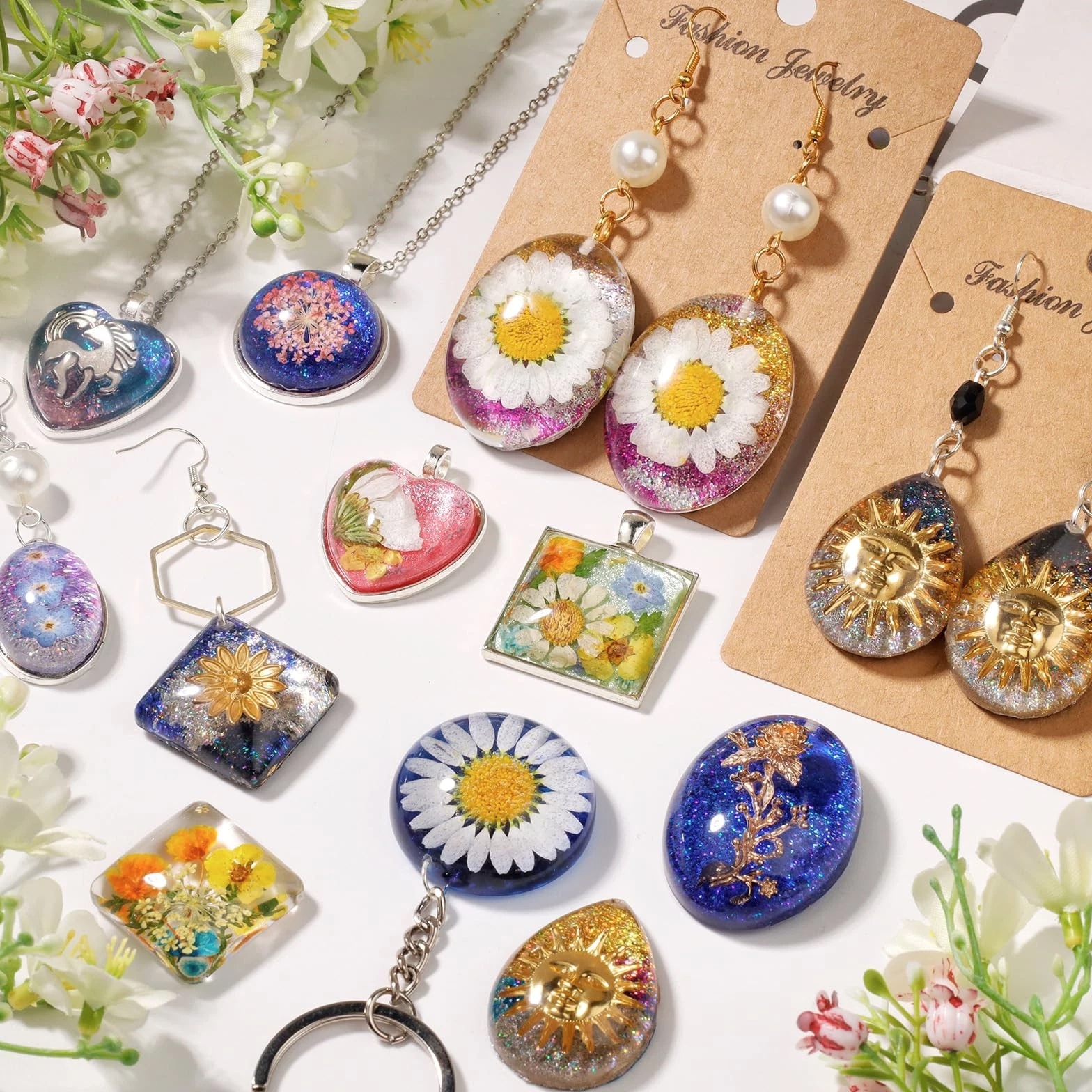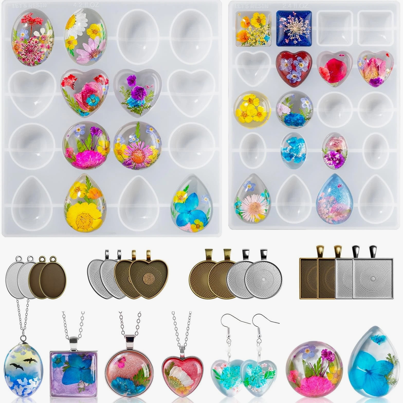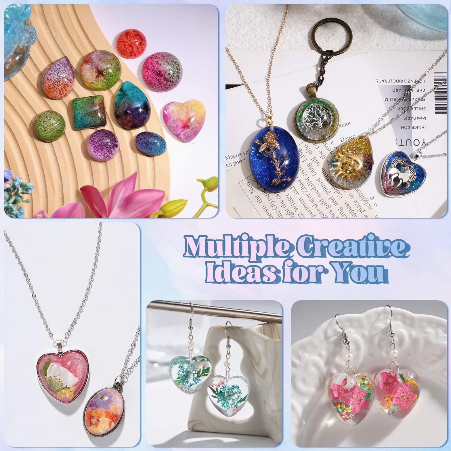 Cabochon Gems Resin Molds, 36 Cavities Thicker & Shiny UV Resin Molds Jewelry with 16 pcs Pendant Trays, Epoxy Molds for Beginner, jewelry making kits for Pendant, Earrings, Necklace, Keychains Multi-Shape & Size Cabochon Gems Resin Molds Kit: The epoxy resin molds include 2 pcs epoxy molds with 36 cavities. It is perfect for a variety of DIY uv resin molds projects. Note: The 16 pendant bases in the set fit only the small-size molds. Note: Only small-size molds come with a metal pendant tray. Thick & Glossy 3D Jewelry Finish: The silicone resin molds finished pieces are up to 0.4 inches thick, making them more solid and domed than standard resin jewelry. After curing, the resin molds jewelry surface is smooth and shiny, with rounded edges, giving your creations a stunning 3D effect. Custom-Fit resin jewelry molds with Great Compatibility: The small-sized resin molds silicone are specially designed to match most standard metal pendants for jewelry making. Finished pieces fit perfectly without the need for trimming or sanding, allowing you to create professional jewelry. Perfect for both beginners and professionals to effortlessly achieve high-quality, handcrafted pendant necklaces results. Versatile Use: This silicone molds for resin is perfect for making earrings, pendants, keychains, and more. It's compatible with epoxy resin, uv resin, plaster, clay, and other materials. Add dried flowers, crystal chips, or small charms to create bag charms, necklaces, bracelets etc. Whether for everyday wear or as a gift, it's a perfect choice. Premium Materials: The resin earring molds are made from thick, high-quality silicone with a smooth interior, making it easy to demold and resistant to tears, ensuring it can be reused many times. The resin tray is made from durable metal alloy, ensuring it stays sturdy, resistant to deformation, and won't fade over time.
