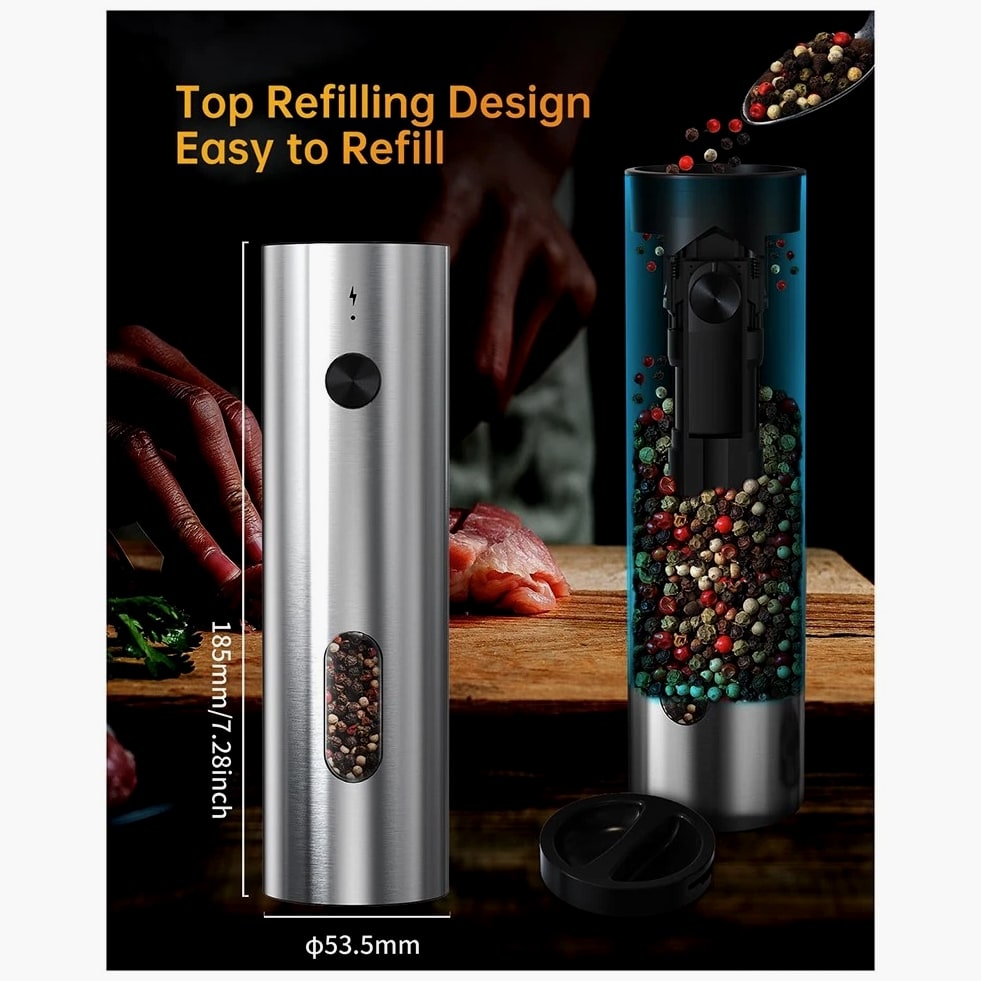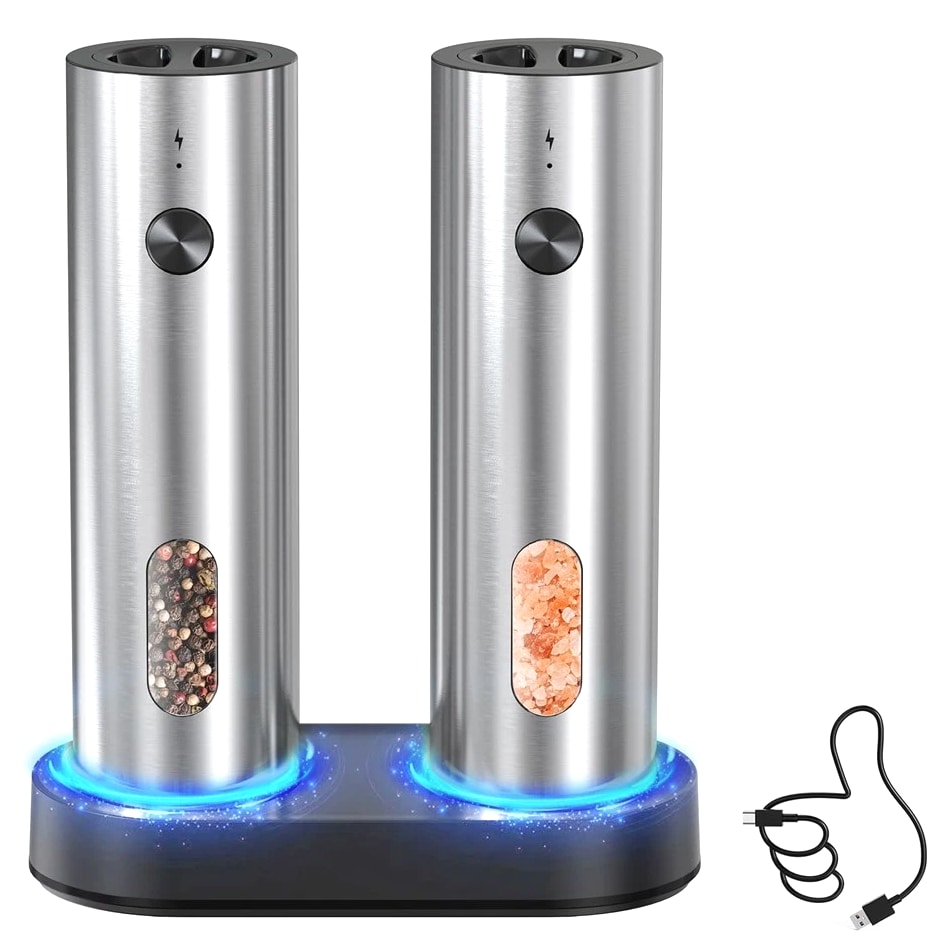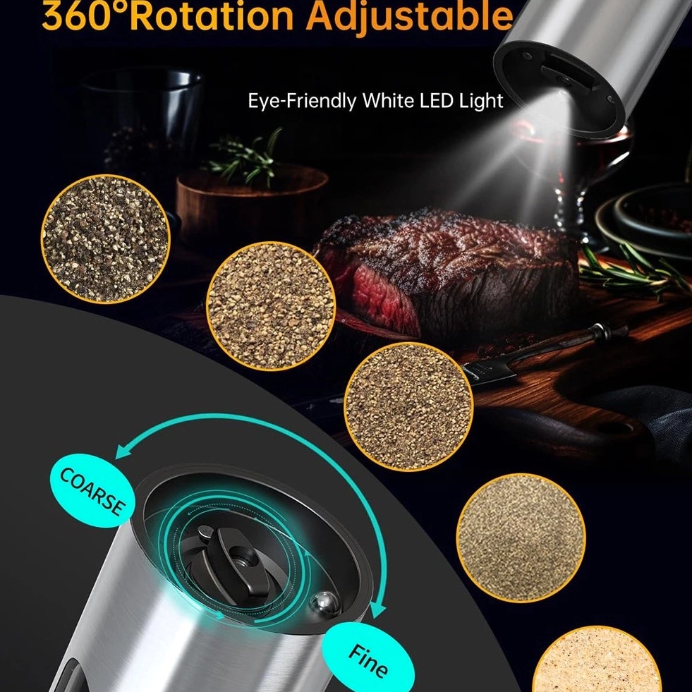 Effortless Top-Loading Design: Refill your grinders with ease using our top-loading system designed to prevent spills and messes. Just pour your spices directly into the chamber for quick, hassle-free seasoning anytime. Convenient USB Charging Dock: Keep your kitchen counters clean with a dual grinder charging base that also catches spills. A quick 5-minute charge provides all-day use, while a full charge allows for over 20 minutes of continuous grinding. Adapter not included. Adjustable Coarseness: Tailor your grinding with 5 distinct settings, from coarse for robust steak to fine for delicate soups. The intuitive 360° rotating dial at the base offers seamless control over your spice texture. Enhanced Large Capacity: Our upgraded 110ml grinder holds 30% more spices than standard 70ml models, minimizing the need for frequent refills. The integrated bright LED light illuminates the area, ensuring you can see your spices grind in real time. Superior Quality and Stylish Design: Constructed from food-grade, BPA-free materials, this elegant stainless steel pepper mill set is perfect for any setting. The ergonomic textured button allows for simple, one-touch operation, making it accessible for users of all ages. Color: Silver Material: stainless steel Package Contents: 2 x Grinder 1 x Charging Base 1 x Cord