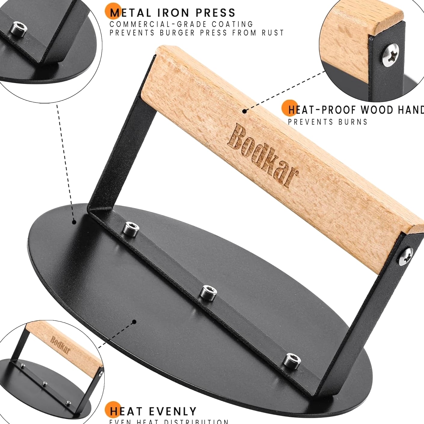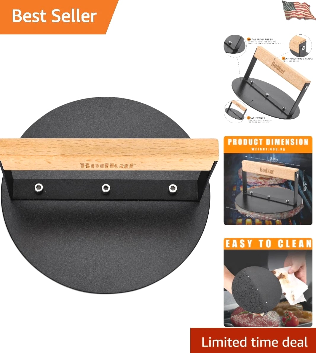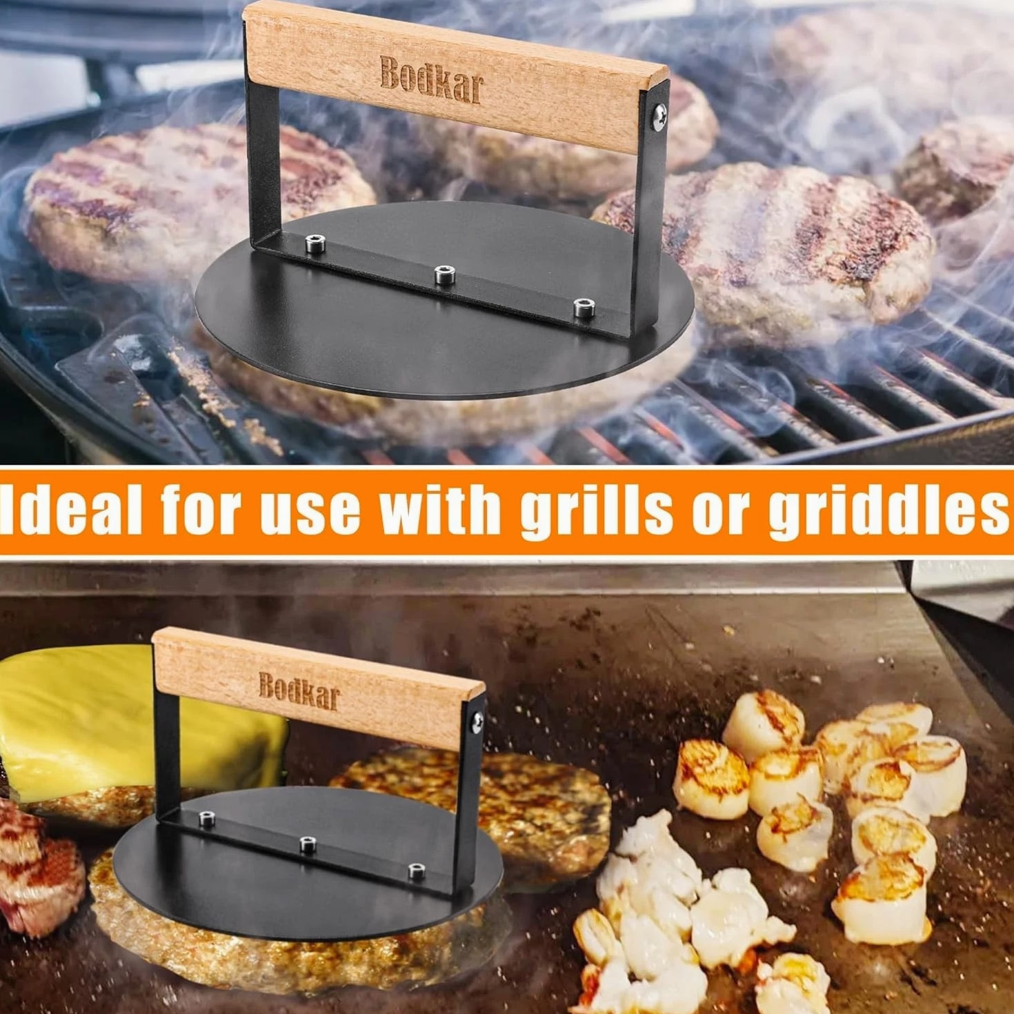 Elegant 6-Inch Round Smash Burger Press with Wood Handle Transform your grilling experience with this 6-inch Round Burger Smasher, expertly crafted to deliver perfectly flat and delicious burgers every time. Features: Durable Construction: Made from rust-proof iron metal, this burger press is designed to withstand the test of time. Versatile Design: The 6" round shape fits seamlessly in most pans and skillets, ideal for creating thin burgers and various meats. Heat Distribution: Smooth flat surface ensures even distribution and retention of heat, perfect for smashing burgers to achieve that coveted thin crust. Sturdy Wooden Handle: Crafted from natural wood, the heat-resistant handle provides a secure and comfortable grip. Easy to Clean: Designed for convenience, the burger press is easy to clean after use and fits most frying pans, skillets, grills, and griddles. Benefits: Creates restaurant-quality smashed burgers with uniform thickness. Squeezes excess fat from meats while cooking for a healthier meal. Reduces cooking time by preheating the press, enhancing your grilling efficiency. Perfect for versatility: use it for bacon, grilled sandwiches, panini, and more. A wonderful gift for grilling enthusiasts during special occasions like Thanksgiving, Christmas, and beyond. Why Choose Our Burger Press? If you aspire to elevate your burger-making skills, look no further. Our Elegant 6-Inch Smash Burger Press combines functionality with style, allowing you to create gourmet burgers in the comfort of your own home. Offering a perfect blend of sturdiness, ease of use, and quick cleanup, this tool is essential for any grilling aficionado. Make a statement at your next barbecue and impress your guests with perfectly smashed burgers. Order your Elegant 6-Inch Smash Burger Press today and savor the taste of quality grilling! Shipping Free & Fast Shipping - Normal delivery time of 3-7 business days.