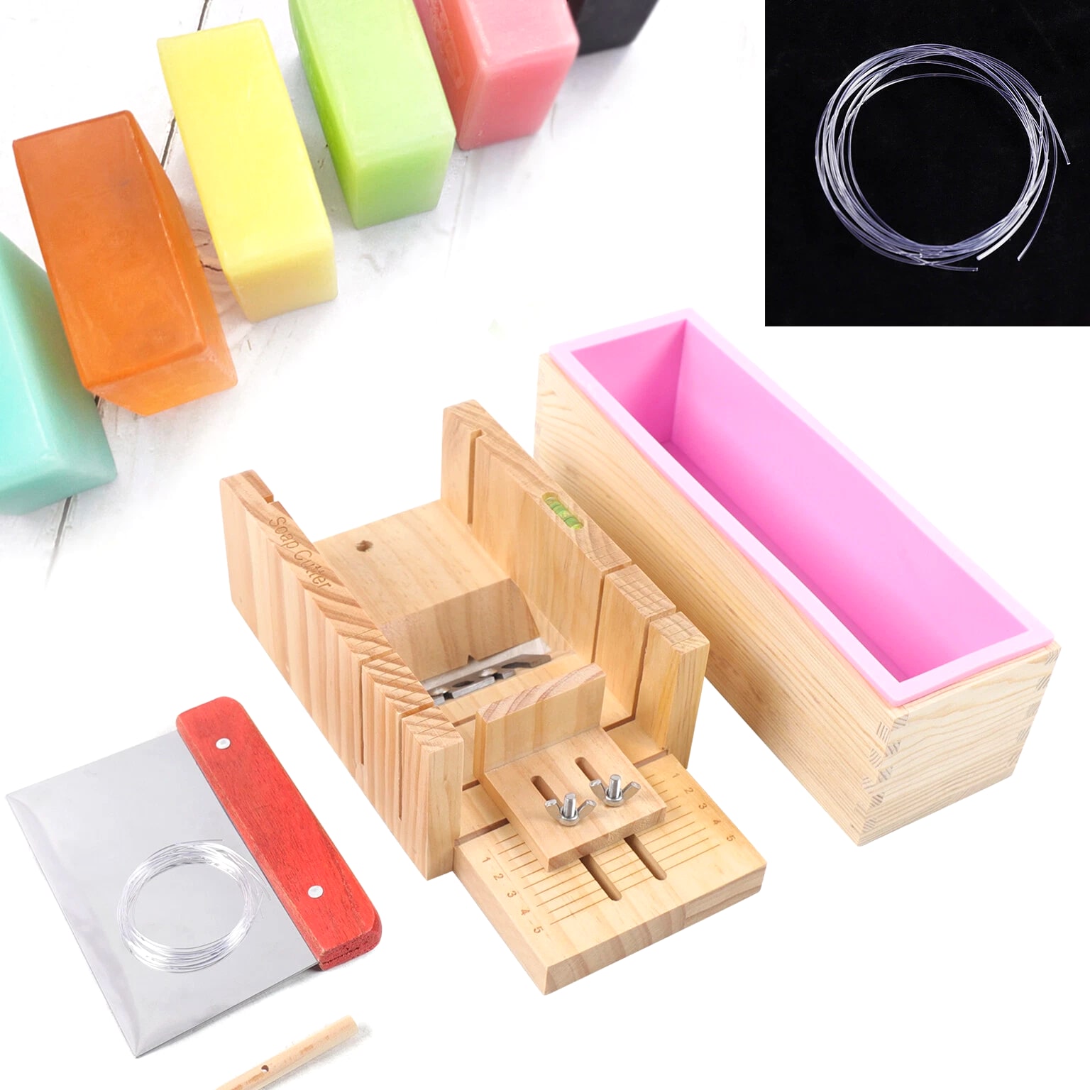 3 Pcs Soap Making Tool Kit Loaf Soap Mould Adjustable Wooden Soap Cutter Slicer Description: Name: Soap cutter set Style: modern and simple Process: grinding, polishing Specification: 3 pcs set Material: wood+silicone+stainless steel Product Size: Wooden mold box: 9.6"*2"*2.8" Wooden Soap cutter Mold: 10.8"*3.5"*5" Straight knife: 5.9"*4.3" Function: used to make handmade soap candles, cakes, etc. Applicable occasions: holidays, weddings, birthdays, full moons, travel commemorations, graduations, parties, etc. Features: 1. Multifunctional: suitable for cutting soap and candles 2. The surface of the accessories is smooth and easy to clean 3. Adjustable thickness: clear scale reading, you can adjust the thickness of soap, easy to observe during operation, easy to get the correct soap size you need. 4. High quality and easy to clean: made of exquisite solid wood and food grade stainless steel, safe high temperature resistance, corrosion resistance, long service life Tips: When you start to make soap, insert the silicone mold into the wood box. Pour liquid soap into the silicone mold. After the liquid soap hardens, remove the silicone mold and take out the soap. Use wire cutter when the soap is still slightly soft. Packing list: 1*Wooden box with silicone container 1*Wooden Soap cutter Mold 1*Straight knife Packing size: 29*17*13cm/11.4"*2.7"*5.2" Package weight: 1.35kg/3lb