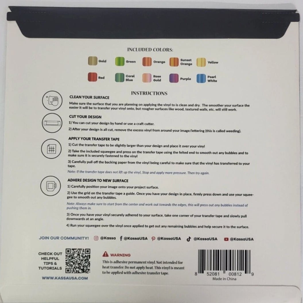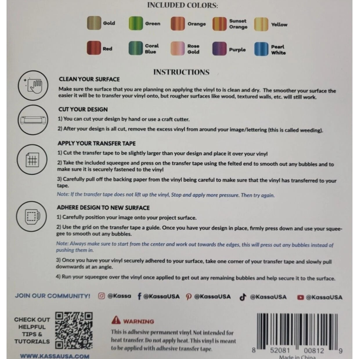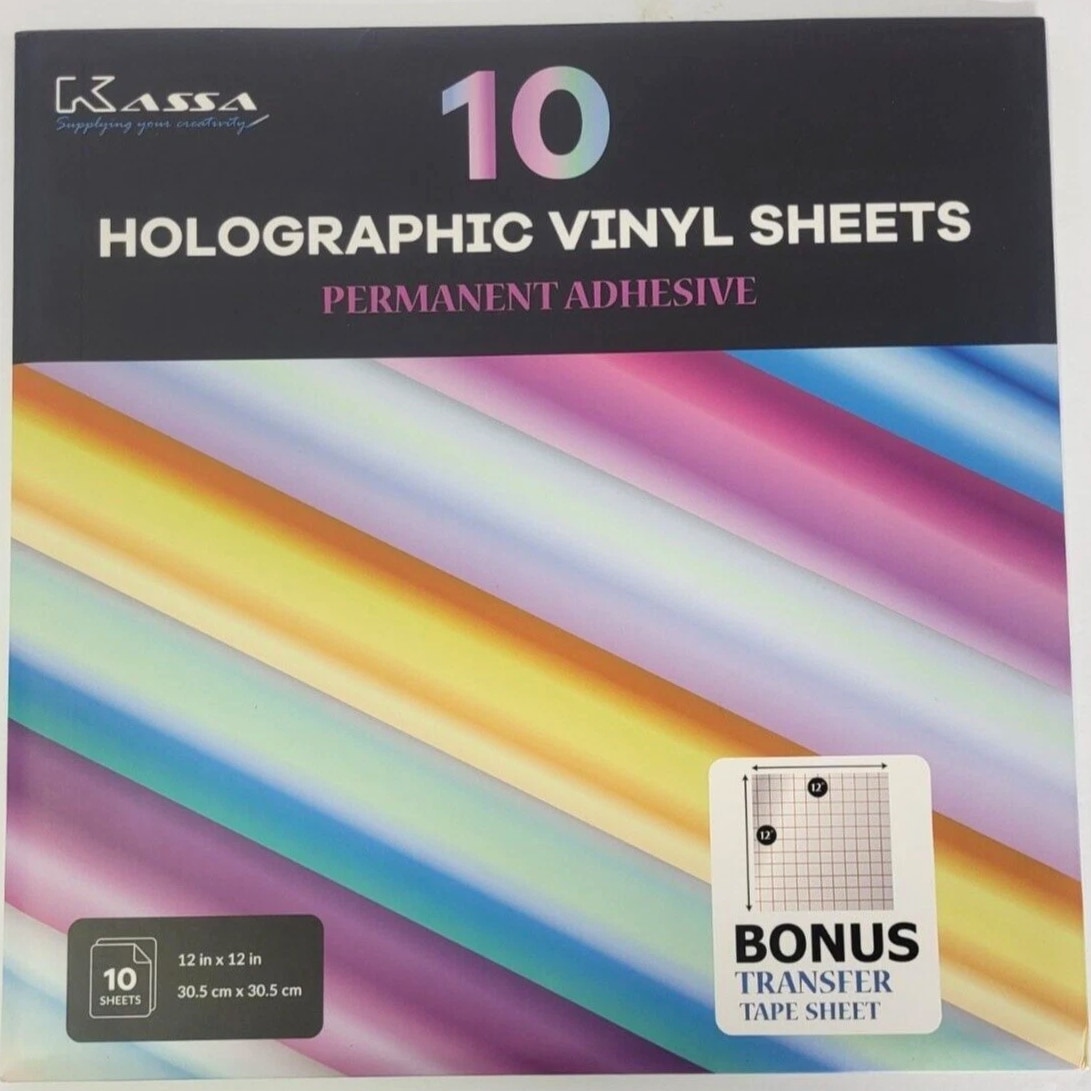 Kassa - 10 Holographic Vinyl Sheets with Permanent Adhesive 12"X12" 10 Different Holographic Colors: Gold, Red, Green, Coral Blue, Orange, Rose Gold, Sunset Orange, Purple, Yellow, Pearl White & Bonus Transfer Tape Sheet. Unopened, see pictures for condition. Will combine shipping when possible.