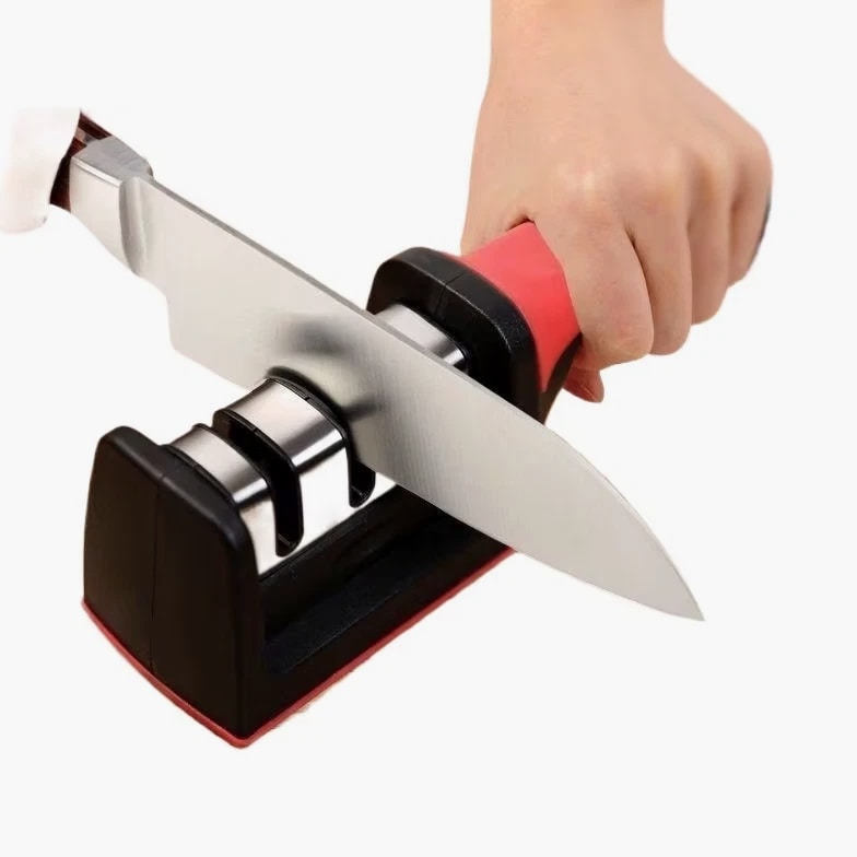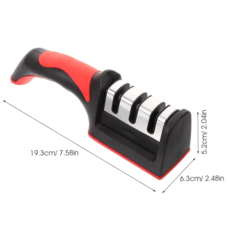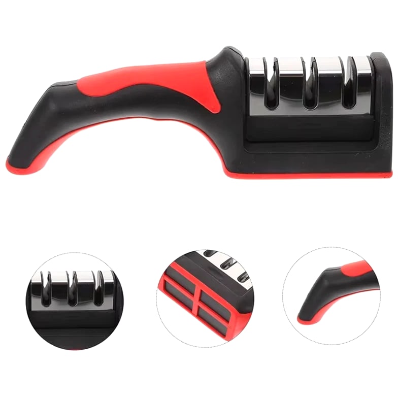 The Multi-Functional 3-Stage Knife Sharpener is a manual tool designed for kitchen knives and scissors. Constructed from durable carbon steel, it features three stages for effectively sharpening blades. The sleek black finish adds style to any kitchen, making it a practical and essential gadget for maintaining sharp utensils. Perfect for home cooks and chefs alike, this knife sharpener offers a convenient and efficient way to keep your kitchen tools in top condition.