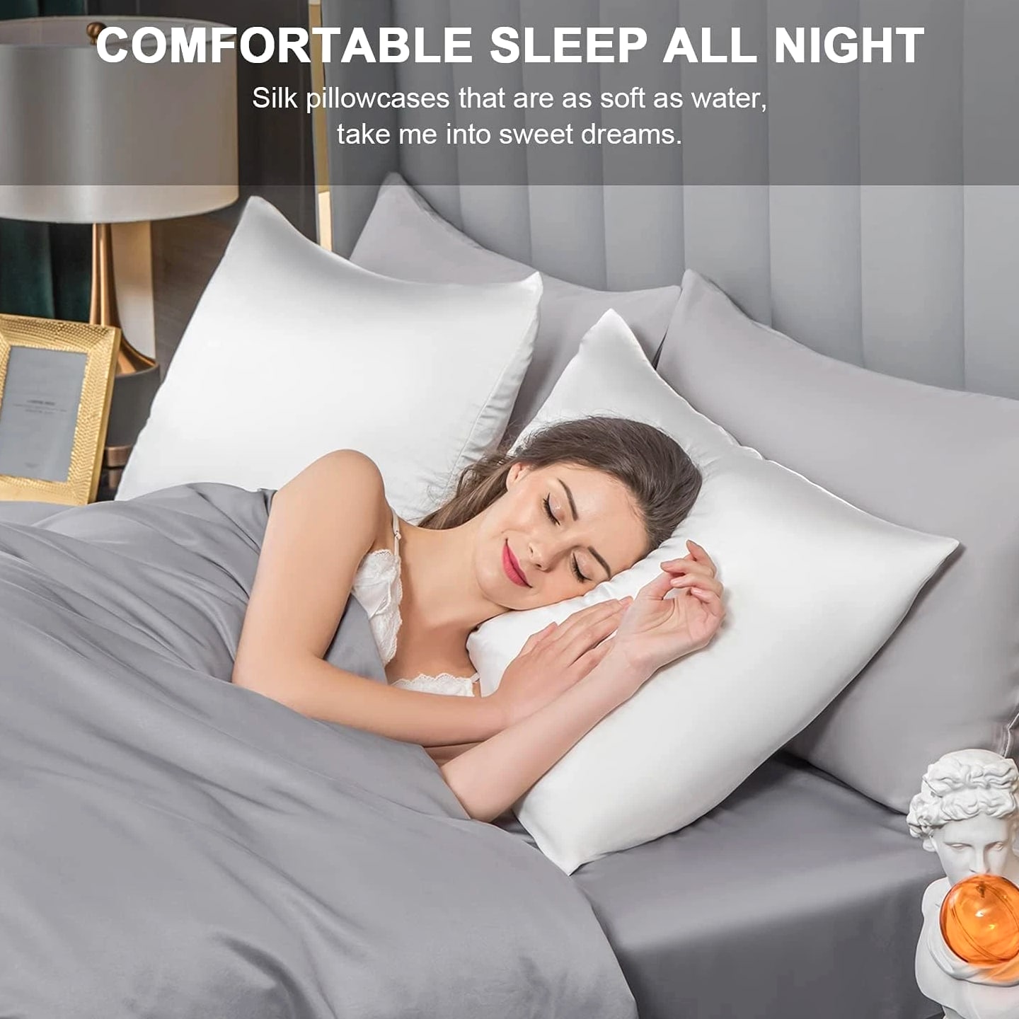 Material: Mulberry Silk This mulberry silk pillowcases have the following characteristics: 1. Mulberry Silk, smooth and soft. Mulberry silk is a natural thermoregulator which keeps you cool in summer and warm in winter. Silk fabric has 18 kinds of Amino acids that are believed to effectively promote your skin cells' metabolism; silk never absorbs moisture. 2. Both sides of the pillowcase are organic silk. Light weight and easy to carry. 3. Superior durable plain color, not easy to run after washing. Exquisite craftsmanship with neat stitches. 4. Mulberry Silk can Prevent Wrinkles, Regulate Sleep Temperature, Protect Hair from Damage & retain moisture. 5. Zipper closure design makes the silk pillowcase hold your pillow perfectly overnight without shifting, improving your life quality at the same time. 6. If you have any other questions, please feel free to contact us and we will do our best to solve your problem. Washing and Care Instructions: Hand wash in cold or lukewarm water with mild detergent. Do not soak dark-colored silk for more than three minutes. Do not twist or wring, hang dry. Do not dry in direct sunlight. Do not tumble dry. Note: The silk pillowcase may be wrinkled in long-term storage. It is recommended to use a steam iron or garment ironing machine, ironing at low temperature before use. (Multiple ironing is not recommended) PREMIUM MULBERRY SILK – ULTRA SOFT, SMOOTH & BREATHABLE Our silk pillowcases are made of high-natural mulberry silk, offering an ultra-soft, smooth, and breathable sleeping surface that reduces friction between your hair and pillow. It is lightweight, skin-friendly, and hypoallergenic, providing healthy and comfortable sleep for adults, toddlers and people with sensitive skin. Enjoy a gentle, luxurious sleep experience every night. BEAUTY ANTI-AGING & SKIN HAIR CARE – FOR ADULTS & KIDS Pure mulberry silk nourishes and hydrates the skin, helps lock in moisture, reduce sleep wrinkles and fine lines, and slow down skin aging—perfect for sensitive