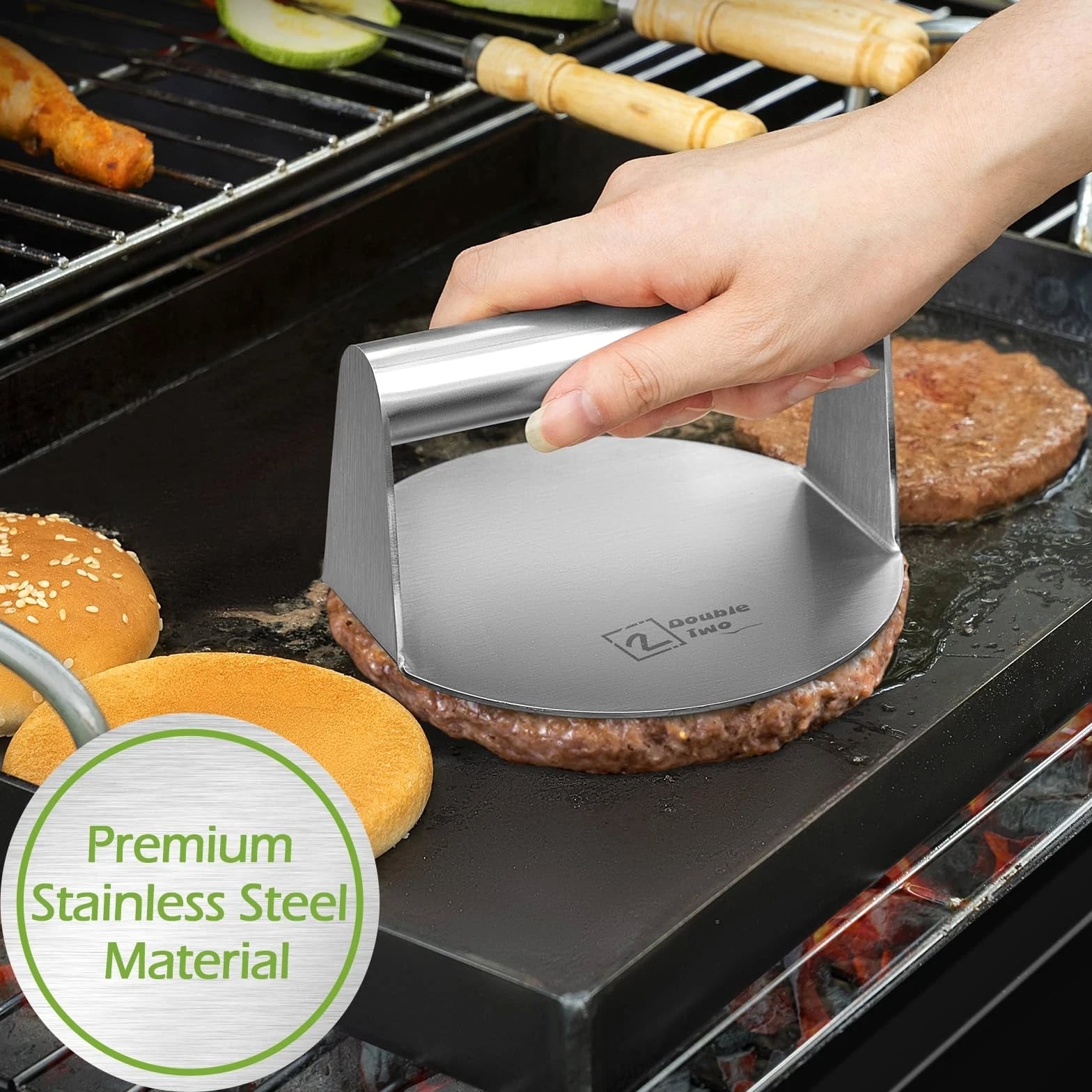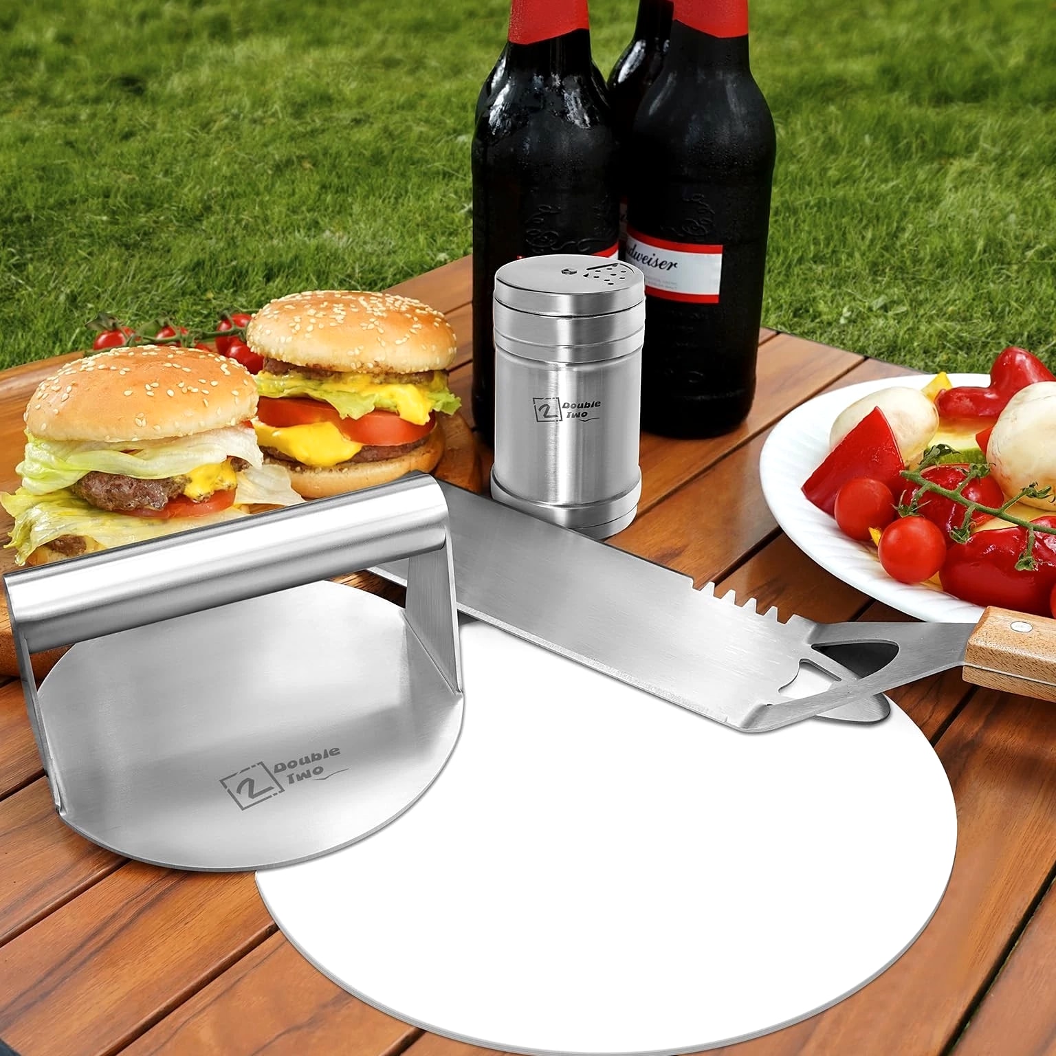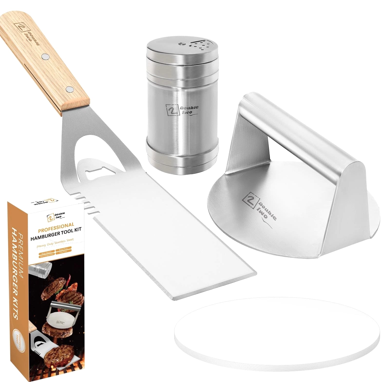 Smashed Burger Kit, Burger Press Kit - Stainless Steel Burger Press, Grill Spatula, Spice Dredge Shaker, Hamburger Patty Paper - Burger Smasher, Griddle Accessories Kit Product Details Brand: 2 DOUBLE TWO Material: Stainless Steel Item dimensions L x W x H: 5.5 x 3.15 x 16 inches Item Weight: 0.96 Kilograms Handle Material: Wood Brand Name: 2 DOUBLE TWO Included Components: Burger Press, Spatula, Shaker, patty paper Number of Pieces: 4 Manufacturer: 2 double two Manufacturer Part Number: burger-01 Item Type Name: burger press tool set Material Type: Stainless Steel Handle Material: Wood Is the item dishwasher safe?: No Grill Surface Compatibility: GENERAL Grill Compatibility: Standard Grills Item Dimensions: 5.5 x 3.15 x 16 inches Item Weight: 0.96 Kilograms Versatile Set: Equip your kitchen with this comprehensive smashed burger kit, perfect for all your burger making needs; no need to buy them separately at higher prices. Durable Construction: Crafted from high-quality materials, ensuring long-lasting performance and easy maintenance. Grilling Essentials: Includes a stainless steel burger press, grill spatula, spice dredge shaker, hamburger patty paper, providing everything you need for hamburger preparation. After Sale Service: We hope you will like our burger press kit; if there are any questions or concerns about the product, please let us know and we will try our best to help.
