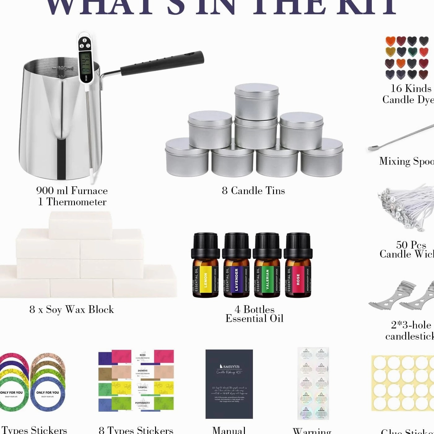 Complete Candle Making Kit for Adults, DIY Starter Soy Candle Making Supplies/Kit, DIY Arts & Crafts Kits Perfect as Home Decorations Description Item dimensions L x W x H 9.06 x 5.91 x 4.33 inches Color silver gray Theme candle making Age Range (Description) Adult Size 8 pcs candle tins kit 🎁【A Complete Candle Making Kit】The natural soy wax candle making kit comes in a beautiful giftable box, includes 8 block soy wax, 900ml candle melting pot, candle tin x 8, candle scents x4, wax dye block x16, wick holder x 2, thermometer, candle wicks x50, beautiful candle labels x16, stirring spoon, and much more! A detailed making instruction manual lets you easily enjoy the joy of making aromatherapy candles. 💓【Natural Soy Wax and Candle Making Pots】The candle making kit is made of 100% natural wax. The candles burn clean without deformation and cracking. 900ml candle making pot with strong rust resistance, high temperature resistance, corrosion resistance, sufficient capacity, no dripping, suitable for making it easier to make. Large capacity candle pour pot, give you enough space to unleash your imagination and create more candles. 🌈【DIY Your Candle Making Kit】Our candle making kit comes in 4 different fragrances and 16 wax dye blocks. The perfect combination of soy wax, scented oils and dyes allow you to create colorful and multi shaped scented candles, turning any space into your ideal comfort zone. In addition, it comes with pre printed labels to match the scents. We provide a thermometer specifically to make it easier for you to know when to add scents and dye blocks. 🎀【The Ultimate Set for Beginners】Many DIY craft kits can be frustrating with unclear instructions or missing components. However, our scented candle-making kit is the perfect place for a beginner candle maker to start. We have prepared a detailed guide with pictures to provide foolproof candle making steps. The instructions are incredibly simple to follow, makin