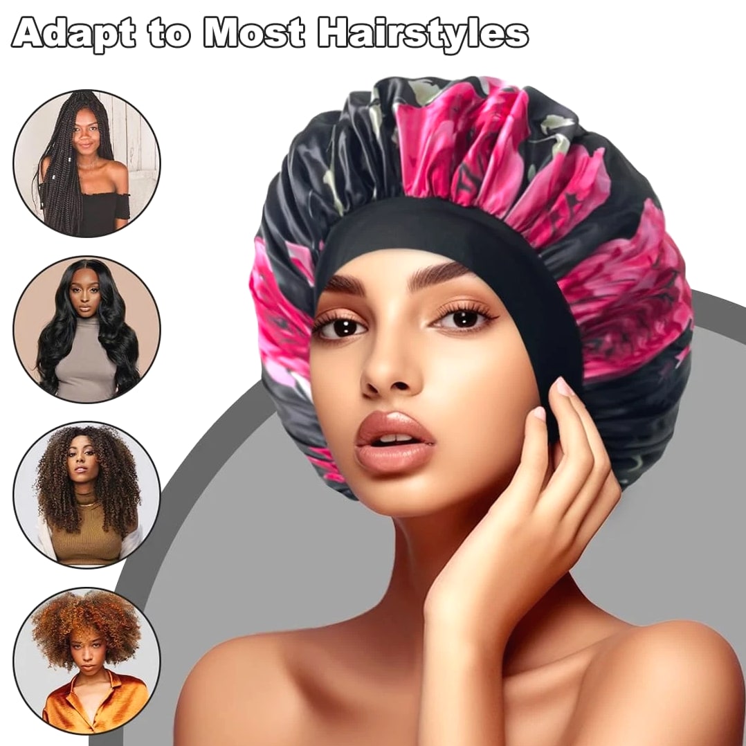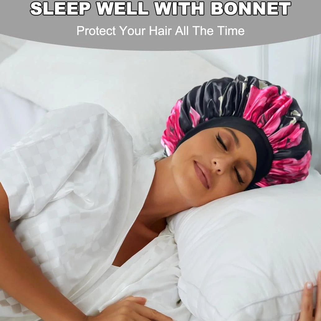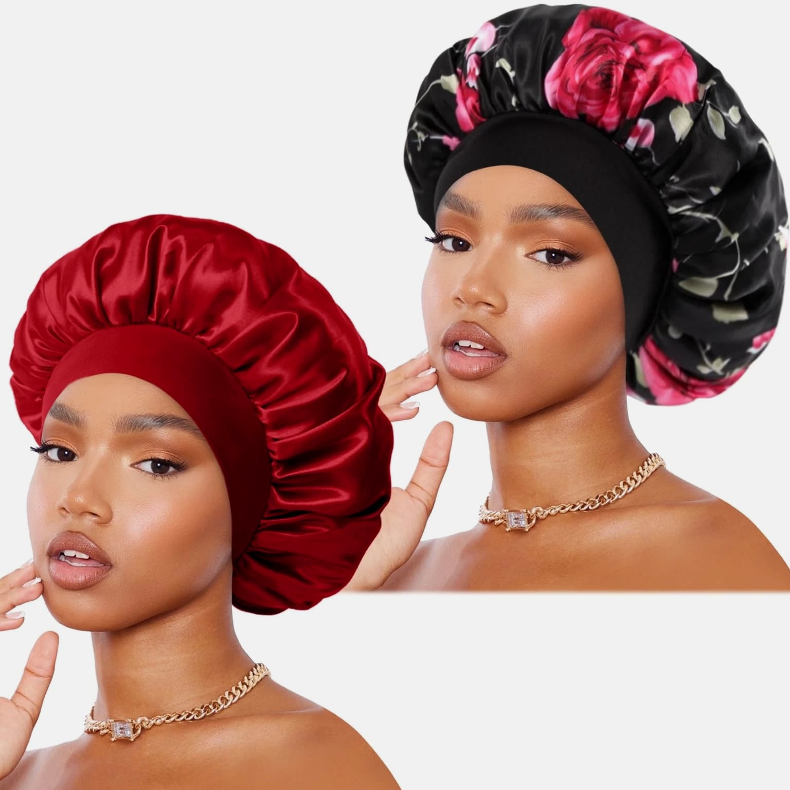Satin Bonnet 2-Pack Silk Hair Bonnets Black Peacock Blue Pink