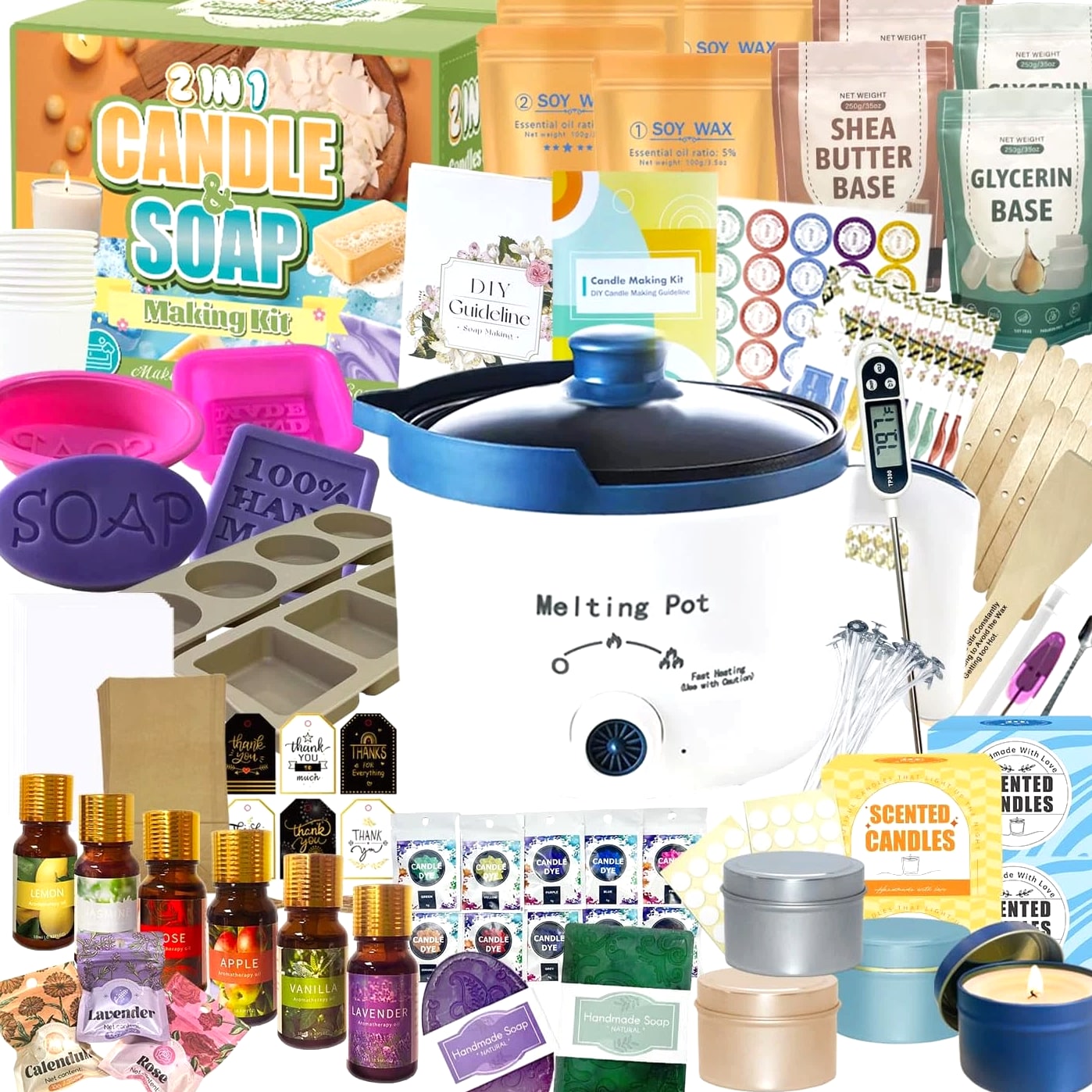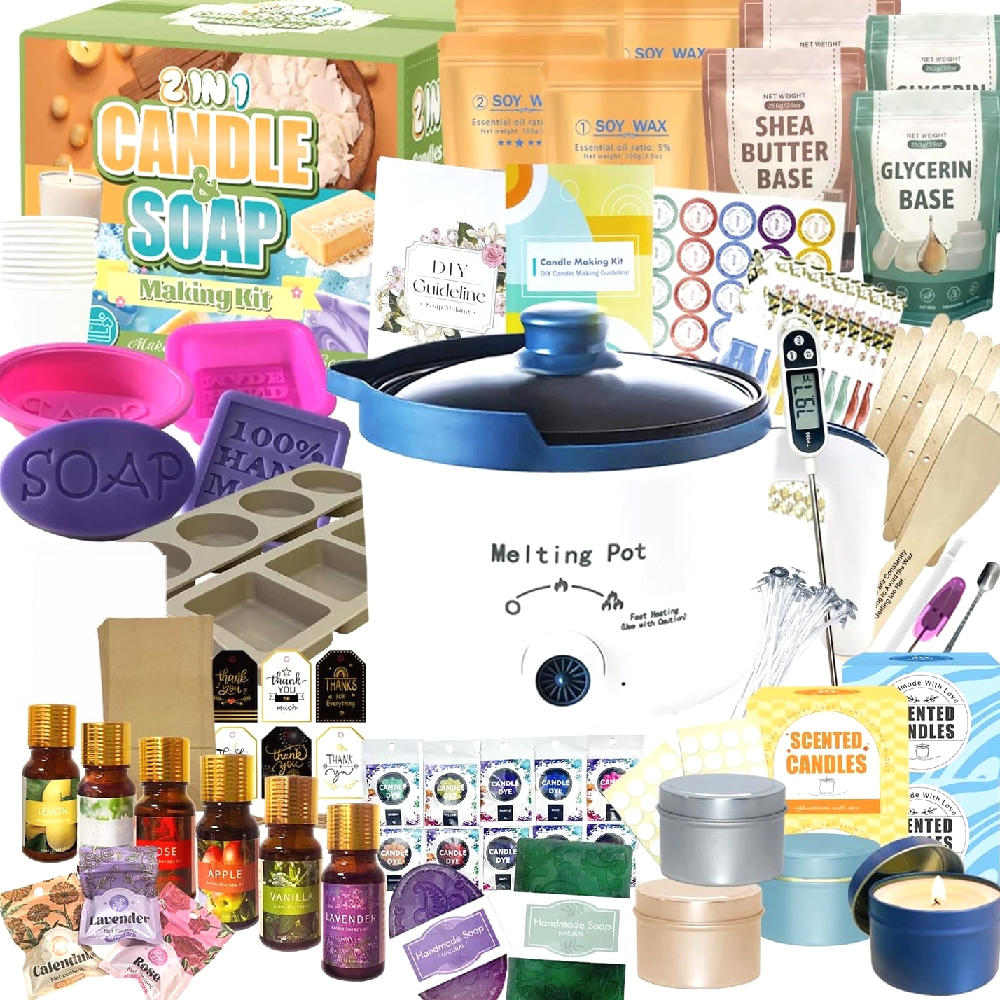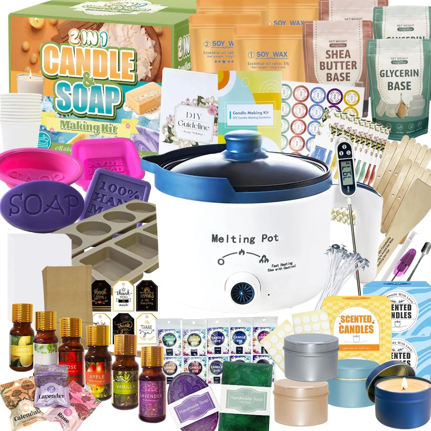 π ππππ ππ π, ππππππ πππ ππππππππππ: Create both luxury candles and artisan soaps with one expertly curated system. Includes dual-purpose tools: an electric melting pot (works for wax & soap bases), reusable silicone molds, professional thermometer, dyes and fragrance oils. All materials nest in a gift box β no duplicate equipment or clutter. πππππππ πππππππ, ππππππππ-π πππππππ: Cosmetic-grade SLS-free soap base, natural soy wax, and 8 phthalate-free fragrances (for candles & skin). Vibrant non-bleeding dyes. Unlike cheap kits, our materials resist frosting/cracking and deliver salon-quality lather (soaps) and strong scent throw (candles). Vegan, cruelty-free, FDA-compliant πππππ πππππ, πππππππ πππππππ: Includes color-coded instructions about making soaps and candles. Pre-portioned wax (2lb) and soap base (2lb) eliminate measuring. Tools prevent common fails. 92% of testers made IG-worthy products on their first attempt! Perfect for teens, busy adults, or gifts. ππππππ πππππ ππ πππππππππππ ππππ ππππ: Kit for starting your home business creating craft holistic wellness gifts. Includes soap & candle gift packaging supplies. Reusable commercial-grade tools (electric melting pot, pro molds) support high-volume crafting. Ideal for entrepreneurs or mindfulness seekers πππππ ππ πππ π ππ πππππ ππππππππ : This is the perfect gift for craftspeople, teens and anyone who enjoys DIY. Hand-made soap can be used as part of a family DIY workshop. The first soap you made with your family are wonderful gifts, and may even spark a new hobby you'll be able to enjoy and share with others for years to come