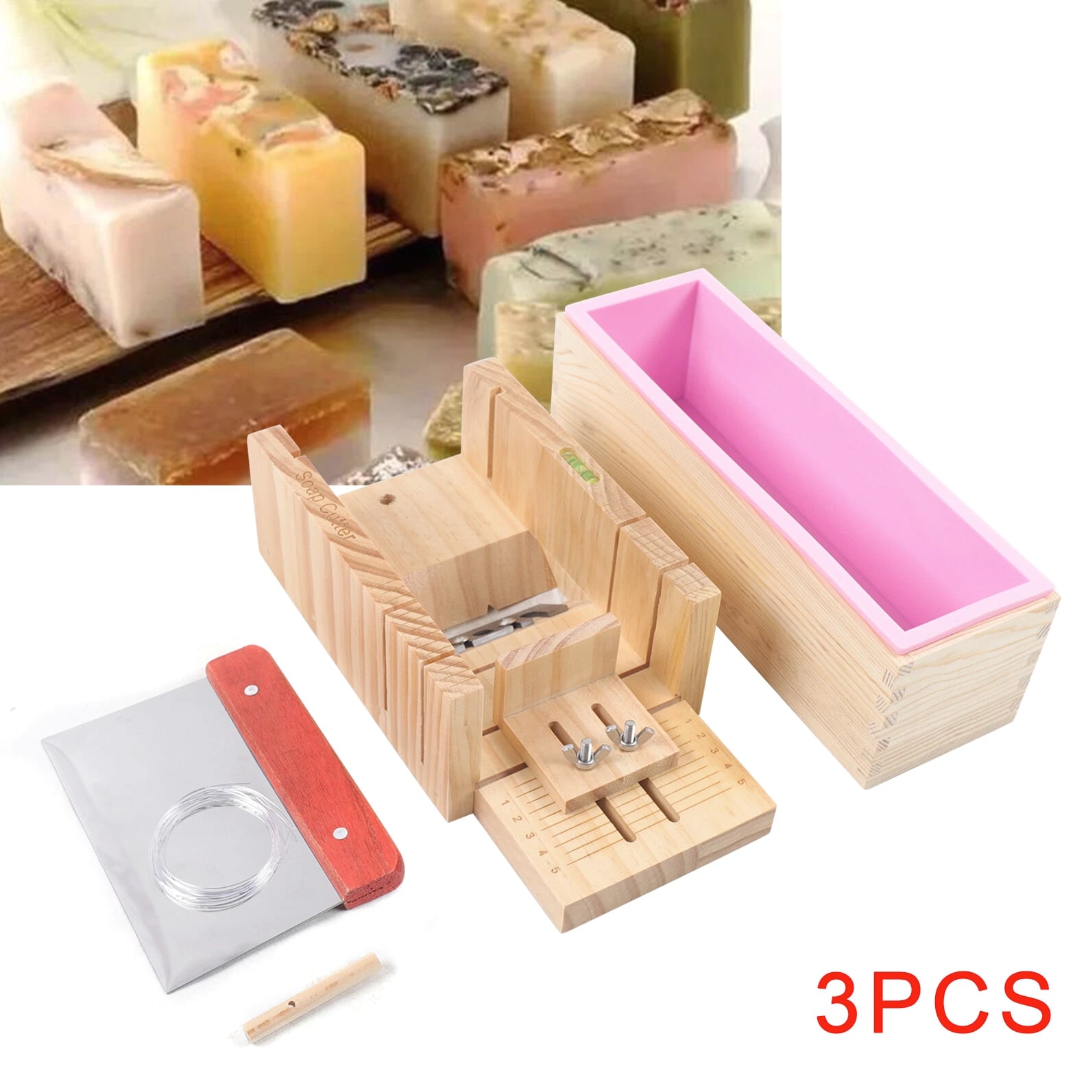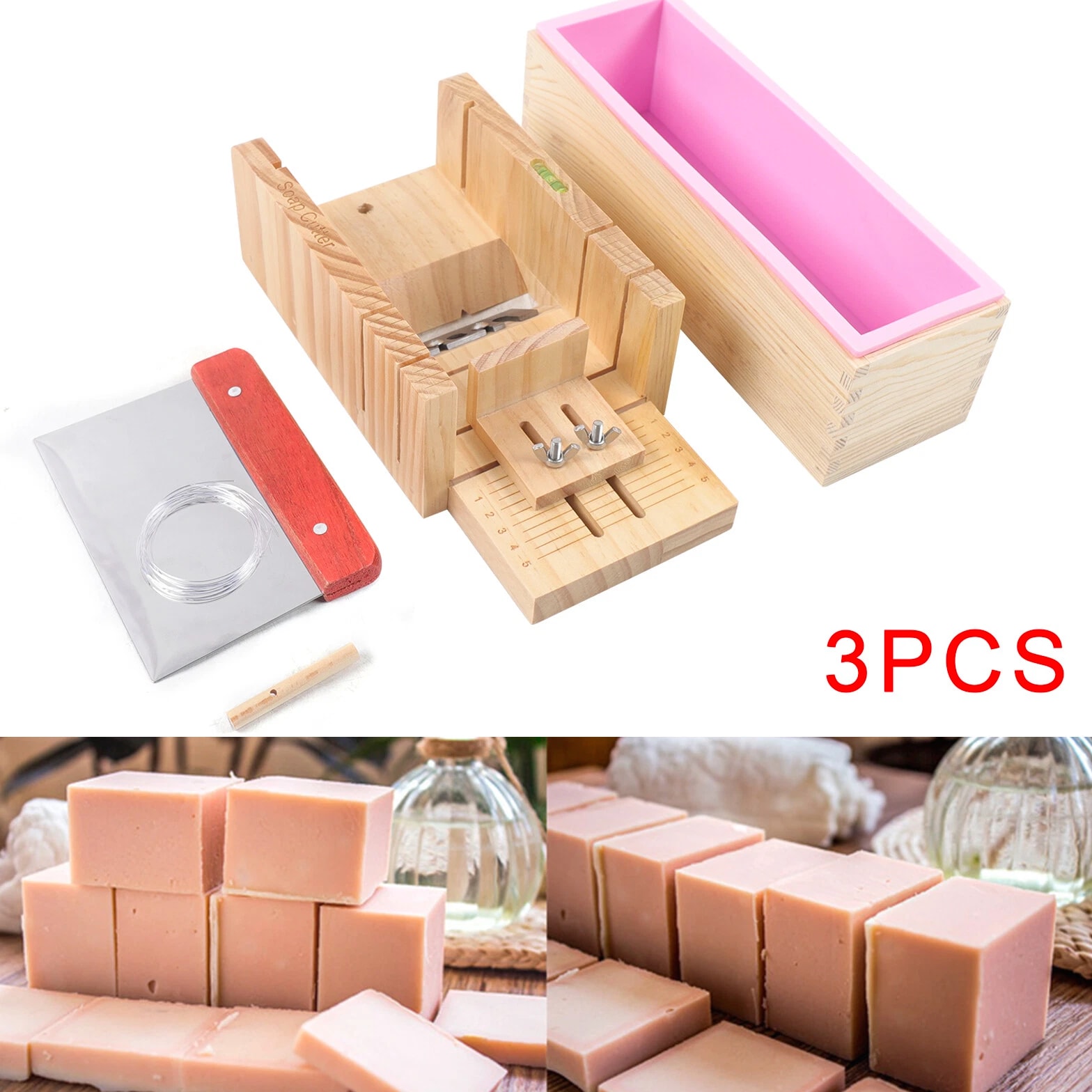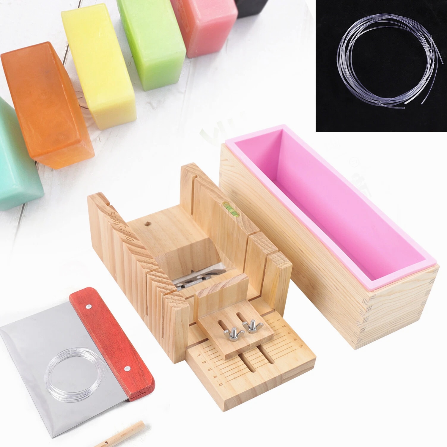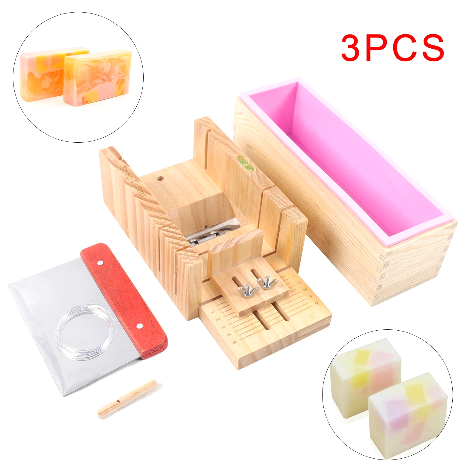 Pro Soap Making Supplies Kit 3 Pcs Set Soap Tools Cakes Mold Handmade DIY 3 Pcs Soap Making Tool Kit Loaf Soap Mould Adjustable Wooden Soap Cutter Slicer Gift Description: Name: Soap cutter set Style: modern and simple Process: grinding, polishing Specification: 3 Pcs set Material: wood+silicone+stainless steel Product Size: Wooden mold box: 9.6"*2"*2.8" Wooden Soap cutter Mold: 10.8"*3.5"*5" Straight knife: 5.9"*4.3" Function: used to make handmade soap candles, cakes, etc. Applicable occasions: holidays, weddings, birthdays, full moons, travel commemorations, graduations, parties, etc. Features: 1. Multifunctional: suitable for cutting soap and candles 2. The surface of the accessories is smooth and easy to clean 3. Adjustable thickness: clear scale reading, you can adjust the thickness of soap, easy to observe during operation, easy to get the correct soap size you need. 4. High quality and easy to clean: made of exquisite solid wood and food grade stainless steel, safe high temperature resistance, corrosion resistance, long service life Tips: When You Start To Make A Soap, You Need To Put The Silicone Mold Into The Wood Box. And Then Pour Liquid Soap Into The Silicone Mold. After The Liquid Soap Is Hardened, You Take Out The Silicone Mold And Remove The Soap. Wire Cutter Should Be Used When The Soap Is Still A Bit Soft. Packing list: 1*Wooden box with silicone container 1*Wooden Soap cutter Mold 1*Straight knife Packing size: 29*17*13cm/11.4"*2.7"*5.2" Package weight: 1.35kg/3lb