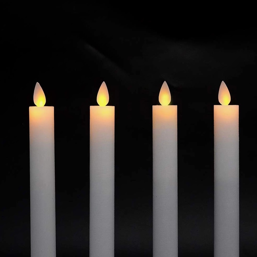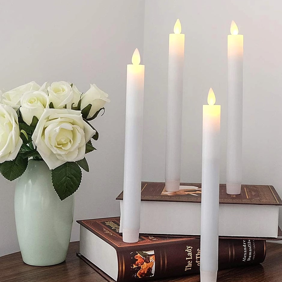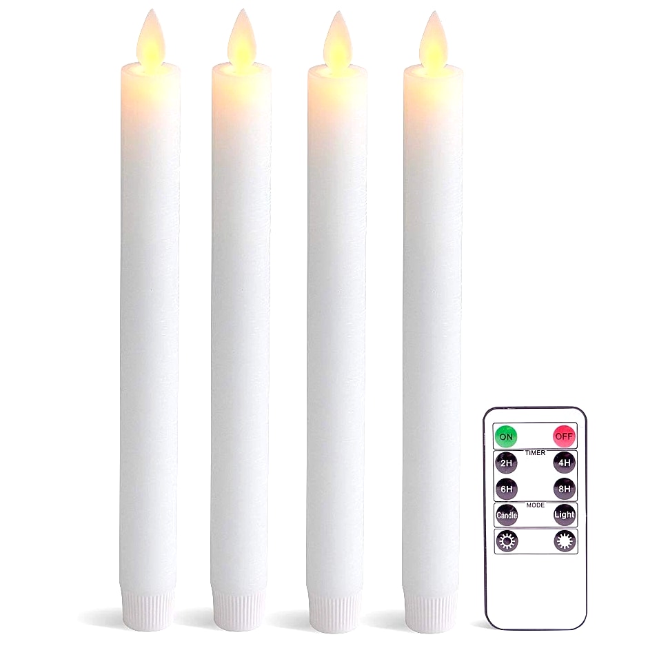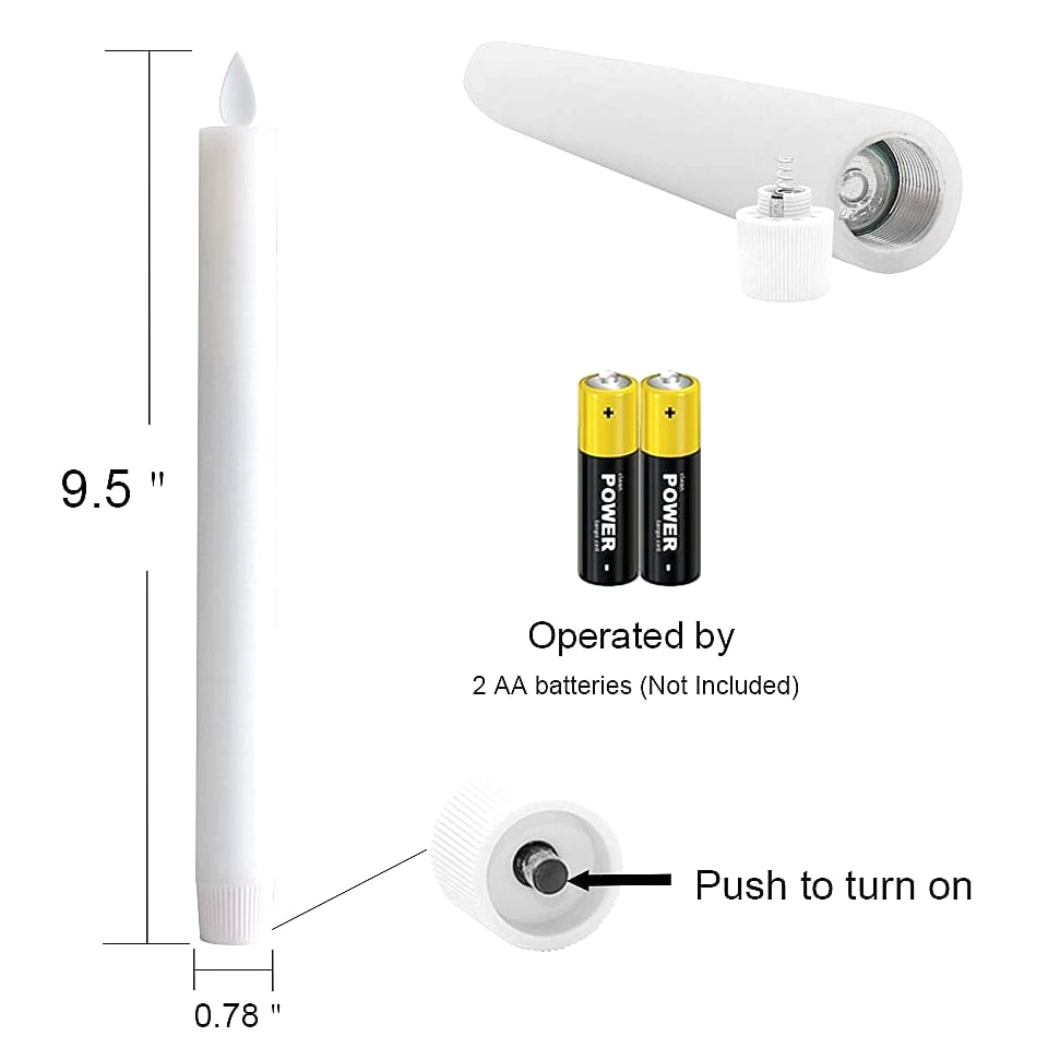 ♥MOVING WICK DANCING FLAME: New designed moving wick imitates the real dancing flame like traditional taper candles in white without fire-related risk and messy dripping, you won't even tell the difference from a distance, each operated by 2 "AA" batteries (not included) which can last more than 150 hours. Moving Wick Patent Number: 11480309 ♥MULTIFUNCTIONAL REMOTE: Included 10-key remote control allows you to place the candles at locations which are hard to reach. One remote can control multiple candles at the same time without touching these led taper candles to control the candles on/off, set the timer, change the flame mode, adjust the brightness. ♥AUTOMATICAL CYCLE TIMER: Set a timer (2 hours, 4 hours, 6 hours, 8 hours) and leave the led candles alone, they will automatically turn off when timer ends and automatically turn on at the same time the second day, cycling every 24 hours. Never worry about forgetting to turn them off before going to bed. ♥MATERIAL AND DIMENSION: Our flameless flickering taper candles are made of 100% real paraffin wax unscented in white color, diameter 0.78" and height 9.5" which can fit any standard 1 inch taper candle holders and chandeliers. They look and feel like real candles, your guests will be impressed at the first sight of them. ♥WIDE RANGE DECORATION: These incredibly realistic flickering LED window candles are ideal for table centerpieces, window sill, mantel, wedding, party, Christmas decoration, add a romantic atmosphere to any room or scene. Also a thoughtful present for your girlfriend, wife, parents and friends.