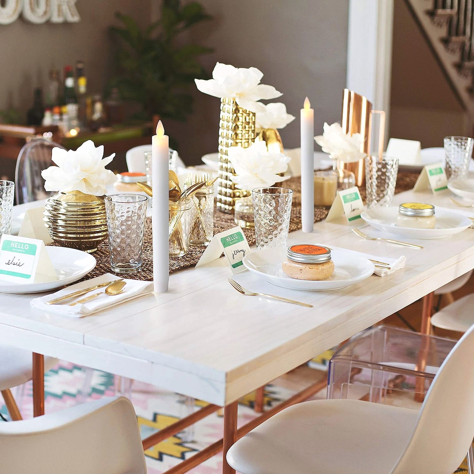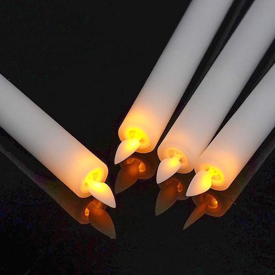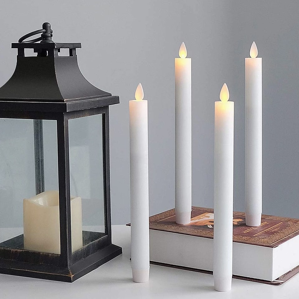 ♥MOVING WICK DANCING FLAME: New designed moving wick imitates the real dancing flame like traditional taper candles in white without fire-related risk and messy dripping, you won't even tell the difference from a distance, each operated by 2 "AA" batteries (not included) which can last more than 150 hours. Moving Wick Patent Number: 11480309 ♥MULTIFUNCTIONAL REMOTE: Included 10-key remote control allows you to place the candles at locations which are hard to reach. One remote can control multiple candles at the same time without touching these led taper candles to control the candles on/off, set the timer, change the flame mode, adjust the brightness. ♥AUTOMATICAL CYCLE TIMER: Set a timer (2 hours, 4 hours, 6 hours, 8 hours) and leave the led candles alone, they will automatically turn off when timer ends and automatically turn on at the same time the second day, cycling every 24 hours. Never worry about forgetting to turn them off before going to bed. ♥MATERIAL AND DIMENSION: Our flameless flickering taper candles are made of 100% real paraffin wax unscented in white color, diameter 0.78" and height 9.5" which can fit any standard 1 inch taper candle holders and chandeliers. They look and feel like real candles, your guests will be impressed at the first sight of them. ♥WIDE RANGE DECORATION: These incredibly realistic flickering LED window candles are ideal for table centerpieces, window sill, mantel, wedding, party, Christmas decoration, add a romantic atmosphere to any room or scene. Also a thoughtful present for your girlfriend, wife, parents and friends.