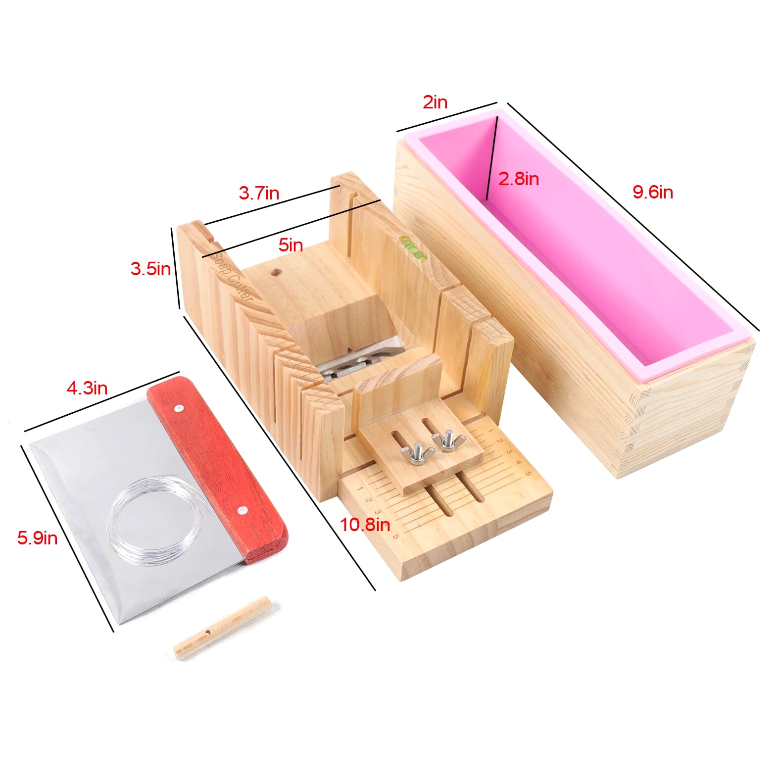 Pro Soap Making Supplies Kit - 3 Pcs Set, Soap Tools, Cakes Mold, Handmade DIY The Description of product: 3 Pcs Soap Making Tool Kit Loaf Soap Mould Adjustable Wooden Soap Cutter Slicer Gift Description: Name: Soap cutter set Style: modern and simple Process: grinding, polishing Specification: 3 Pcs set Material: wood+silicone+stainless steel Product Size: Wooden mold box: 9.6"*2"*2.8" Wooden Soap cutter Mold: 10.8"*3.5"*5" Straight knife: 5.9"*4.3" Function: used to make handmade soap candles, cakes, etc. Applicable occasions: holidays, weddings, birthdays, full moons, travel commemorations, graduations, parties, etc. Features: 1. Multifunctional: suitable for cutting soap and candles 2. The surface of the accessories is smooth and easy to clean 3. Adjustable thickness: clear scale reading allows you to adjust soap thickness; easy to observe during operation, easy to get the correct soap size you need. 4. High quality and easy to clean: made of exquisite solid wood and food-grade stainless steel, safe high temperature resistance, corrosion resistance, long service life Tips: When you start to make soap, put the silicone mold into the wood box. Then pour liquid soap into the silicone mold. After the liquid soap hardens, take out the silicone mold and remove the soap. Wire cutter should be used when the soap is still a bit soft. Packing list: 1*Wooden box with silicone container 1*Wooden Soap cutter Mold 1*Straight knife Packing size: 29*17*13cm/11.4"*2.7"*5.2" Package weight: 1.35kg/3lb