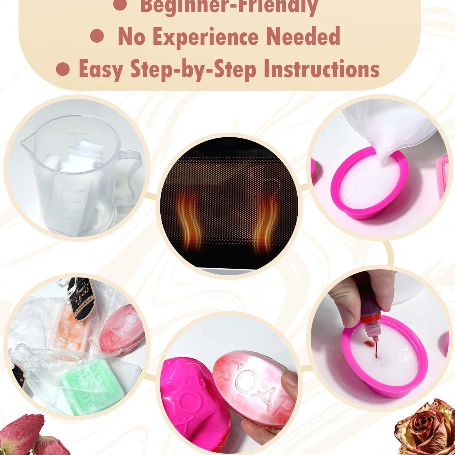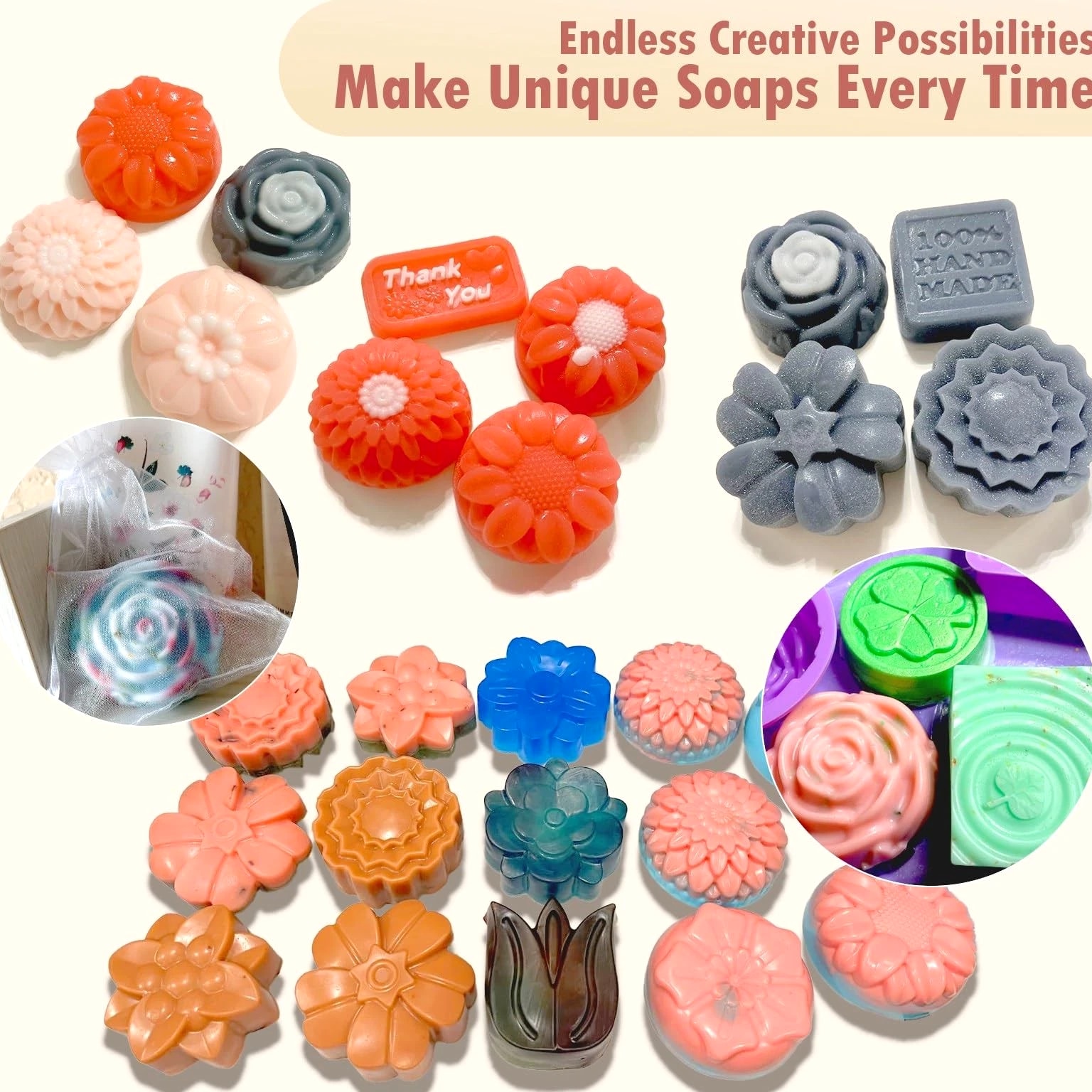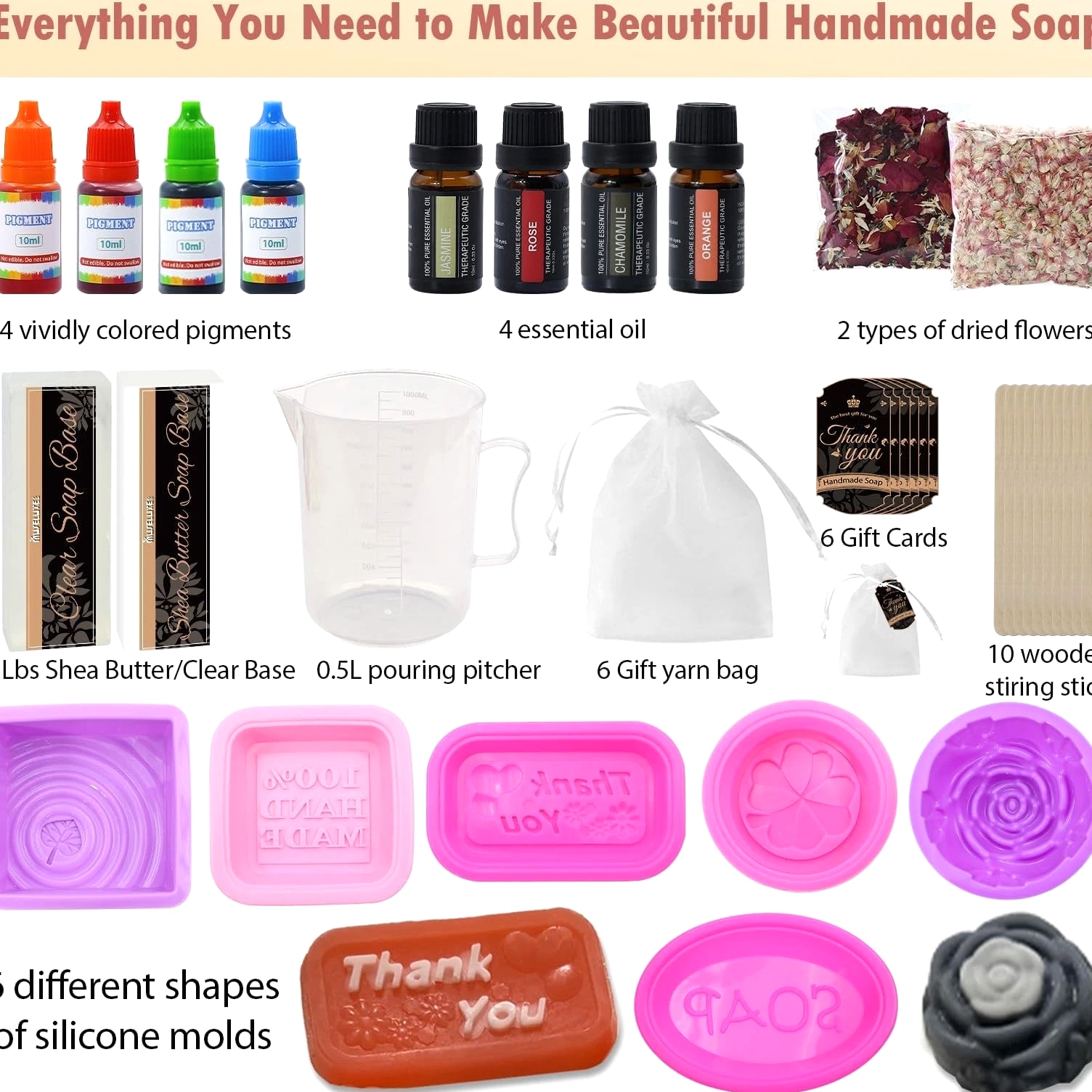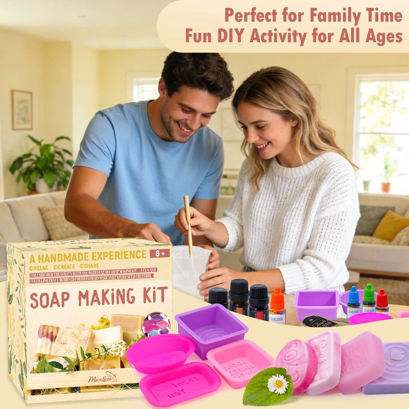 Create your own natural handmade soaps with this complete soap making kit for adults. Designed for beginners, this melt and pour soap kit lets you easily customize soap colors, fragrances and dried flowers—no prior experience needed. With a generous amount of shea butter and clear soap base, reusable silicone molds and thoughtful accessories, you can make multiple soaps for personal use or gifting. Whether you're seeking a relaxing hobby, a creative family activity or a meaningful handmade gift, this soap making kit brings creativity, fun and satisfaction to every project. Perfect for DIY lovers, teens, families and anyone who enjoys crafting unique, personalized soaps at home. Complete Soap Making Kit – Everything You Need This all-in-one soap making kit includes 6 reusable silicone molds, 2.2 lbs shea butter & clear melt and pour soap base, dried flowers, vibrant colorants, fragrances, pouring pitcher, stirring sticks, gift cards and mesh gift bags. Perfect for creating multiple handmade soaps at home without requiring extra tools. Natural, Gentle Ingredients Craft your own soap with plant-based melt and pour bases, natural dried flowers and carefully selected fragrances. Free from harsh chemicals, gentle on skin and suitable for everyday use, making it a great choice for both adults and teens. Easy Melt & Pour – Beginner Friendly Designed for beginners and DIY lovers, this soap making kit requires no cutting or complex steps. Simply melt, mix, pour and enjoy the creative process. Ideal for first-time soap makers, teens, families and craft enthusiasts. Fun DIY Activity for Family & Relaxation Soap making is more than a craft—it's a relaxing and rewarding experience. Enjoy quality parent-time, creative bonding with friends, or peaceful solo crafting while creating personalized soaps with colors, scents and dried flowers. Thoughtful Gift for Any Occasion Beautifully packaged and gift-ready, this DIY soap making kit makes a unique gift for Christmas, birthdays, Mother's Day, Valentine's Day, anni