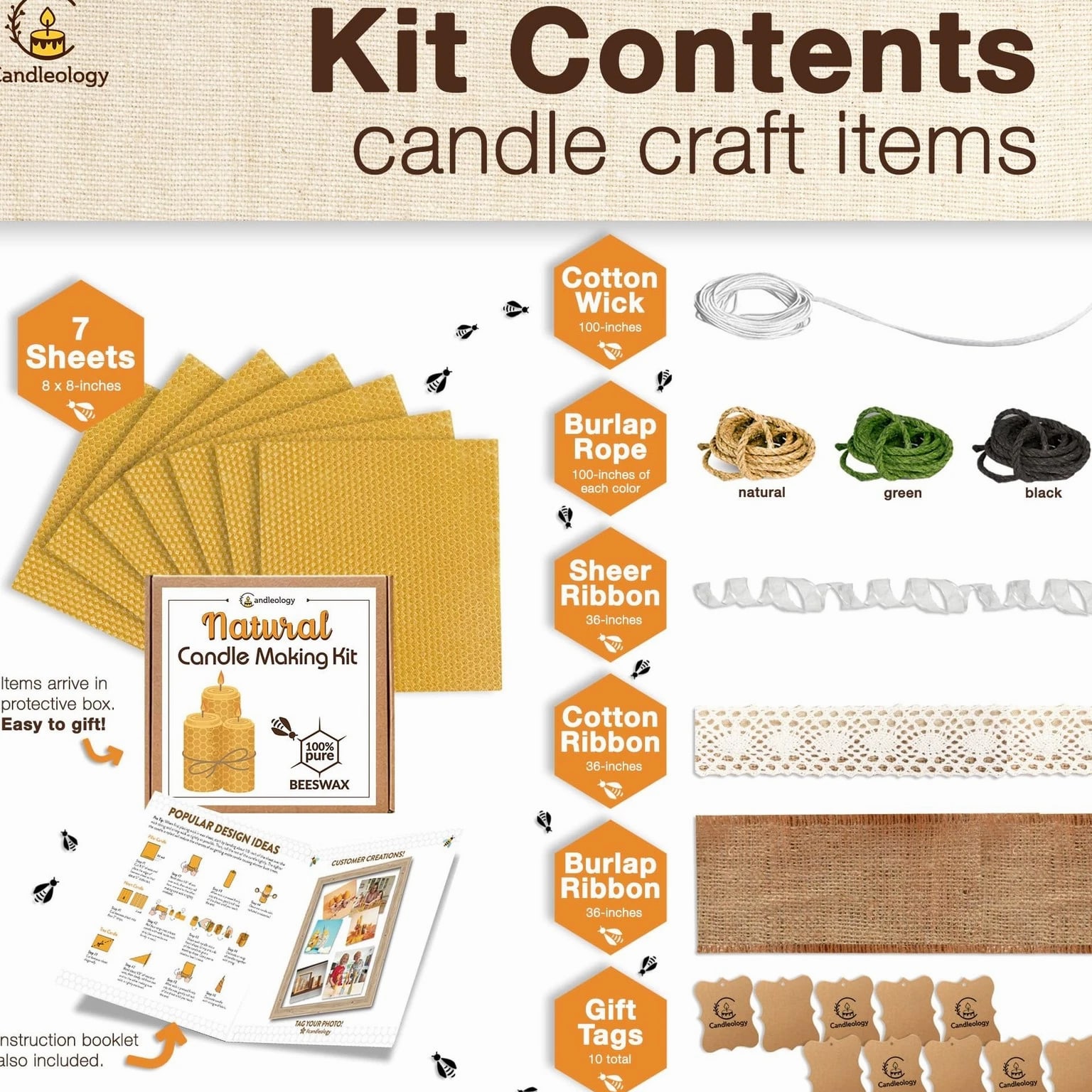 Beeswax DIY Candle Making Kit - Natural Candle Rolling Kit for Beginners with 7 Beeswax Sheets & Multiple Decorations to Make Candles Product Details Color: All-Natural Brand: Candleology MPN: CY-BCRK-NATURAL-V2 UPC: 850051265169 EAN: 0850051265169 Brand: Candleology Age Range (Description): Kids, Adults Color: All-Natural Item dimensions L x W x H: 8.5 x 9 x 1.25 inches Material: Beeswax Brand Name: Candleology Age Range Description: Kids, Adults Model Name: CY-BCRK-NATURAL-V2 Art Craft Kit Type: beeswax candle making UPC: 850051265169 Manufacturer: Candleology Item Type Name: Candle Making Kit Color: All-Natural Subject Character: Nature Seasons: All Seasons Item Dimensions: 8.5 x 9 x 1.25 inches Item Weight: 0.37 Kilograms Size: Variable (Small to Medium) Number of Pieces: 7 Material Type: Beeswax CANDLE ROLLING KIT - Our beeswax candle making kits are entertaining and safe to use. You don't need to melt wax to create wonderful candles - just roll them with our natural beeswax sheets. Our beeswax sheets were made without any harmful additives. Beeswax candles provide a smooth, clean burn. "BEE" CREATIVE - Handmade craft kit helps develop aesthetic taste, creativity, and fine motor skills for children. Roll your own candles and decorate your home. Our beeswax candle set is a fun & easy-peasy activity for the whole family. Ideal for adults, and also makes a great kids candle making kit for boys and girls! FAMILY FUN - Create a positive, warm, and cozy atmosphere by rolling pillar or egg-shaped candles. Involve your children in the candle-making process and create honey bee candle decor for your home, office, bedroom or kitchen. SUSTAINABLE, NATURAL CRAFTING - Beeswax is a natural and sustainable material. It also smells wonderful and is very easy to roll, mold and manipulate - so it's great for crafting. Beeswax burns cleanly and has a pleasant scent. This kit includes an array of natural ingredients to decorate your candles with, without any harmful or toxic addi