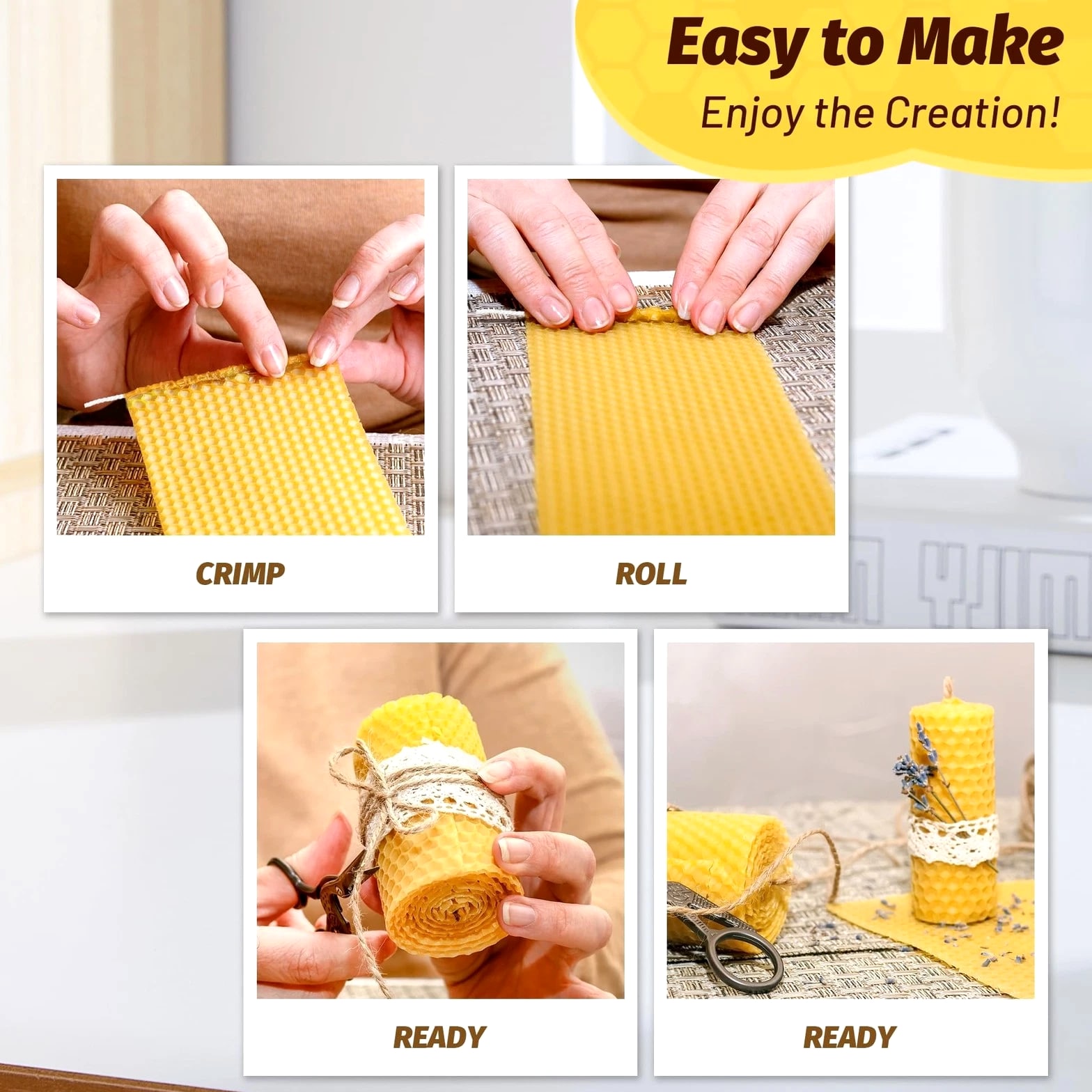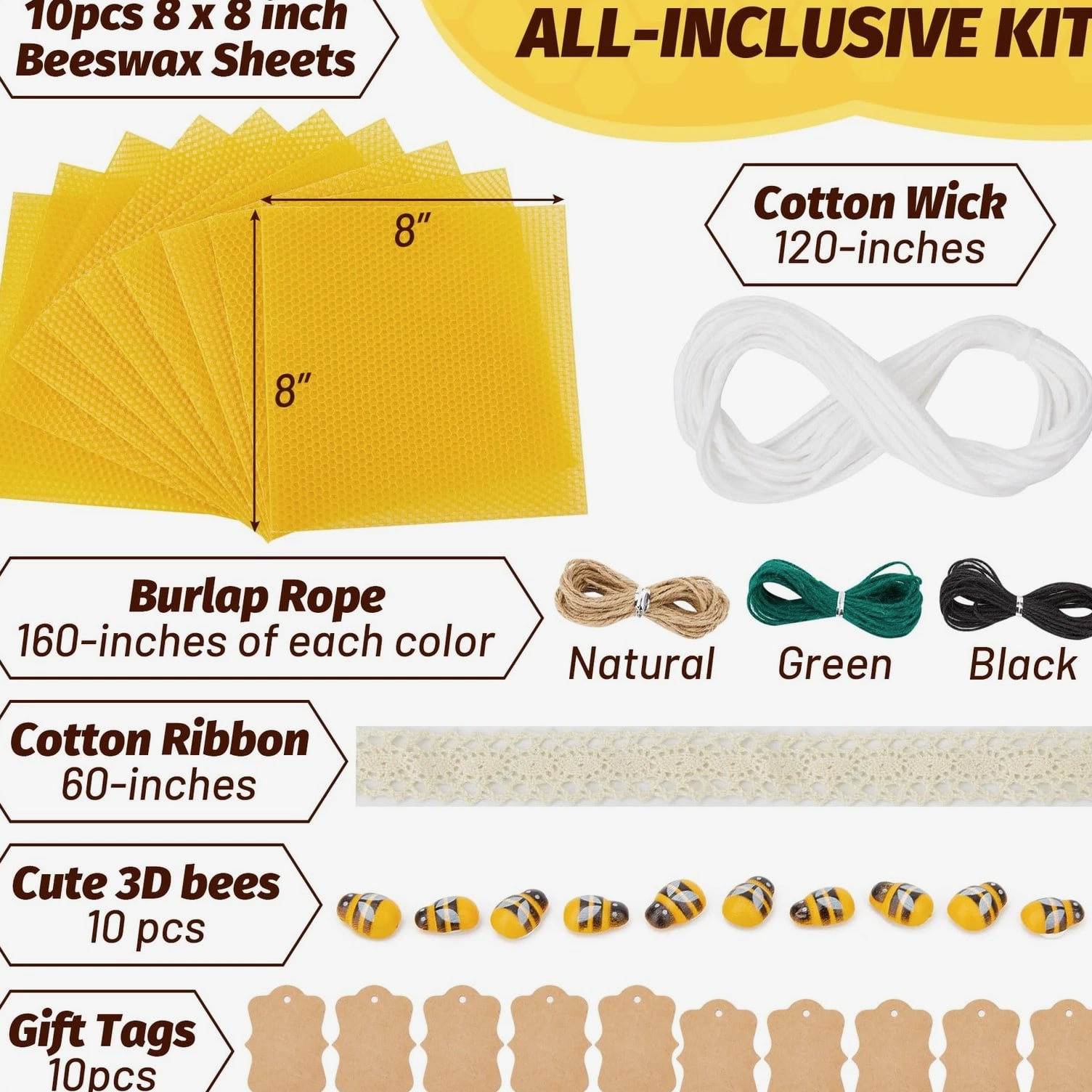HASSLICKIT Natural Beeswax Candle Making Kit for Beginners - 12 Beeswax Sheets for Candle Making Rolling DIY Kits (Natural Yellow Color, 8 x 8 inch) Product Details Brand: HASSLICKIT Age Range (Description): Adult Color: Natural Theme: Nature Item dimensions L x W x H: 8 x 8 x 0.08 inches Brand Name: HASSLICKIT Age Range Description: Adult Included Components: 10 beeswax sheets, 120 inches cotton wick, 180 inches natural jute rope, 180 inches green jute rope, 180 inches black jute rope, 60 inches cotton lace ribbon, 10 gift tags, 10 Wooden Cute Little Bees Model Name: Candle Making Kit Art Craft Kit Type: Candle Making Kit Manufacturer: HASSLICKIT Warranty Description: 3 month Color: Natural Theme: Nature Subject Character: Nature Seasons: All Seasons Item Dimensions: 8 x 8 x 0.08 inches Size: 8 inches Material Type: Beeswax Beeswax Candle Making Kit: The beeswax candle making kit includes 10 pieces of "8 x 8" inch natural beeswax and other candle making supplies: a 120 inch cotton candle wick, a 60 inch cotton ribbon, three bundles of decorative natural hemp ropes in different colors(160-inches of each color), 10 cute stickable wooden bees, and 10 handwritten gift labels. Use it to enjoy the pleasure of creating masterpieces. NATURAL BEESWAX SHEETS: Honeycomb Beeswax Sheets are made from natural beeswax, no harmful additives, non-toxic and environmentally friendly, a great alternative to paraffin or petroleum candles. Candles made from these beeswax sheets burn cleaner, brighter, last longer, and can smell faintly of honey! ENJOY THE FUN OF DIY: This beeswax candle making kit is suitable for everyone to enjoy the fun of DIY candles together. Various high-quality decorative materials help you easily create beautiful candles, allowing your creativity to soar. FUN GIFT SET: The beeswax candle making kit is a perfect gift for making candles for oneself or as a gift for loved ones and friends. Gifts that can be given to loved ones at any occasion, such as birthday events,